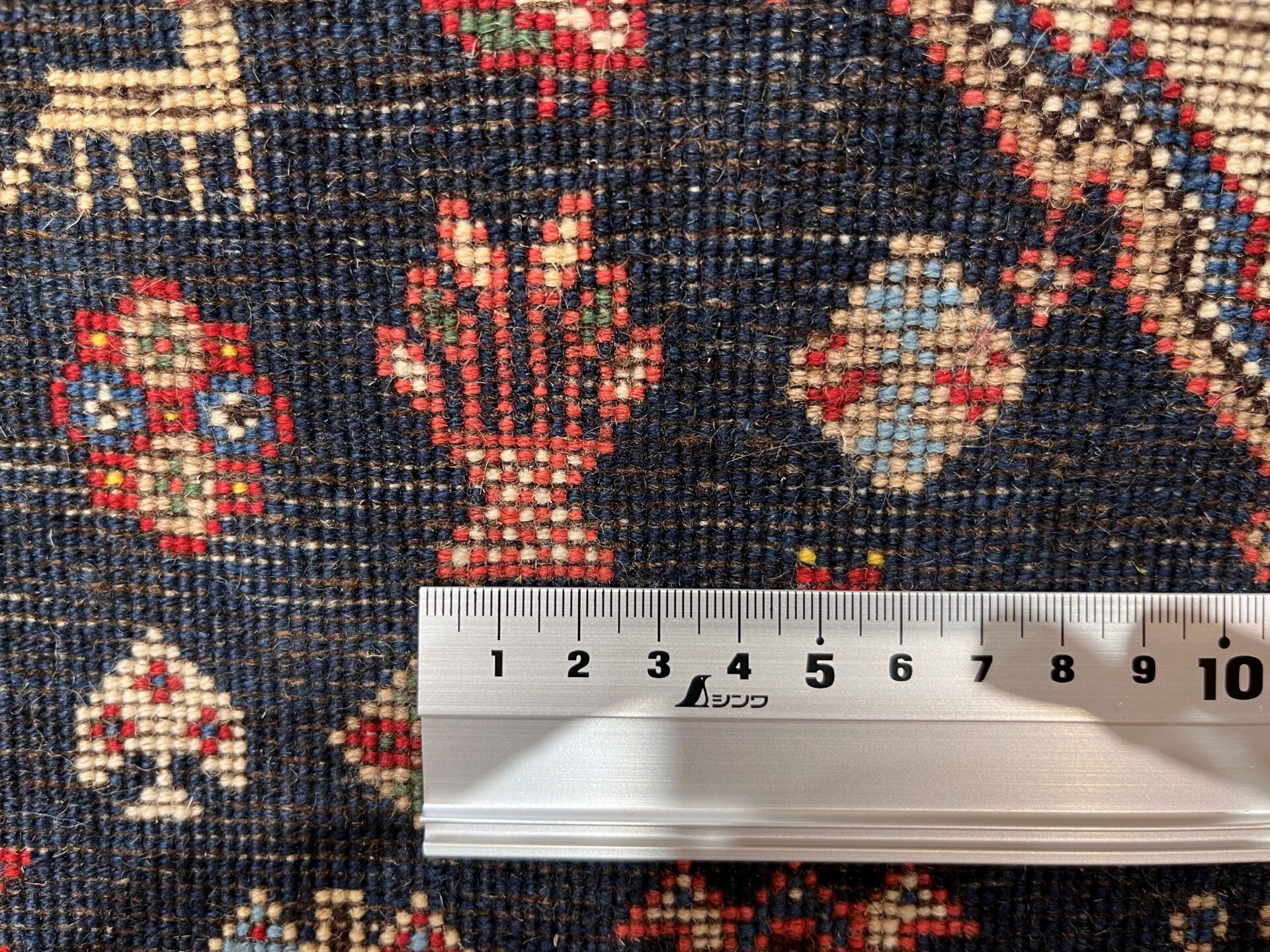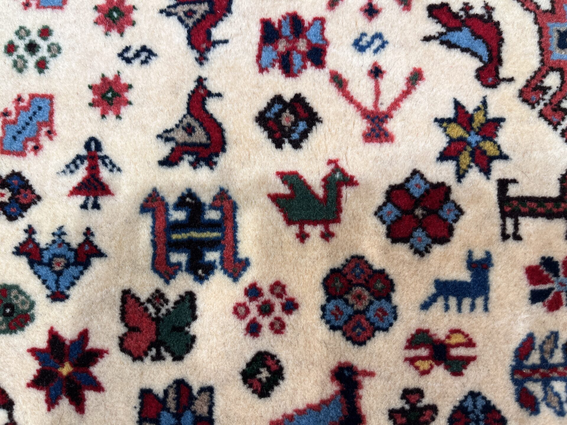 中央のトランジ(菱形モチーフ)を中心に、鳥や人の姿、魔除けの紋様などリズミカルに織り込まれています。