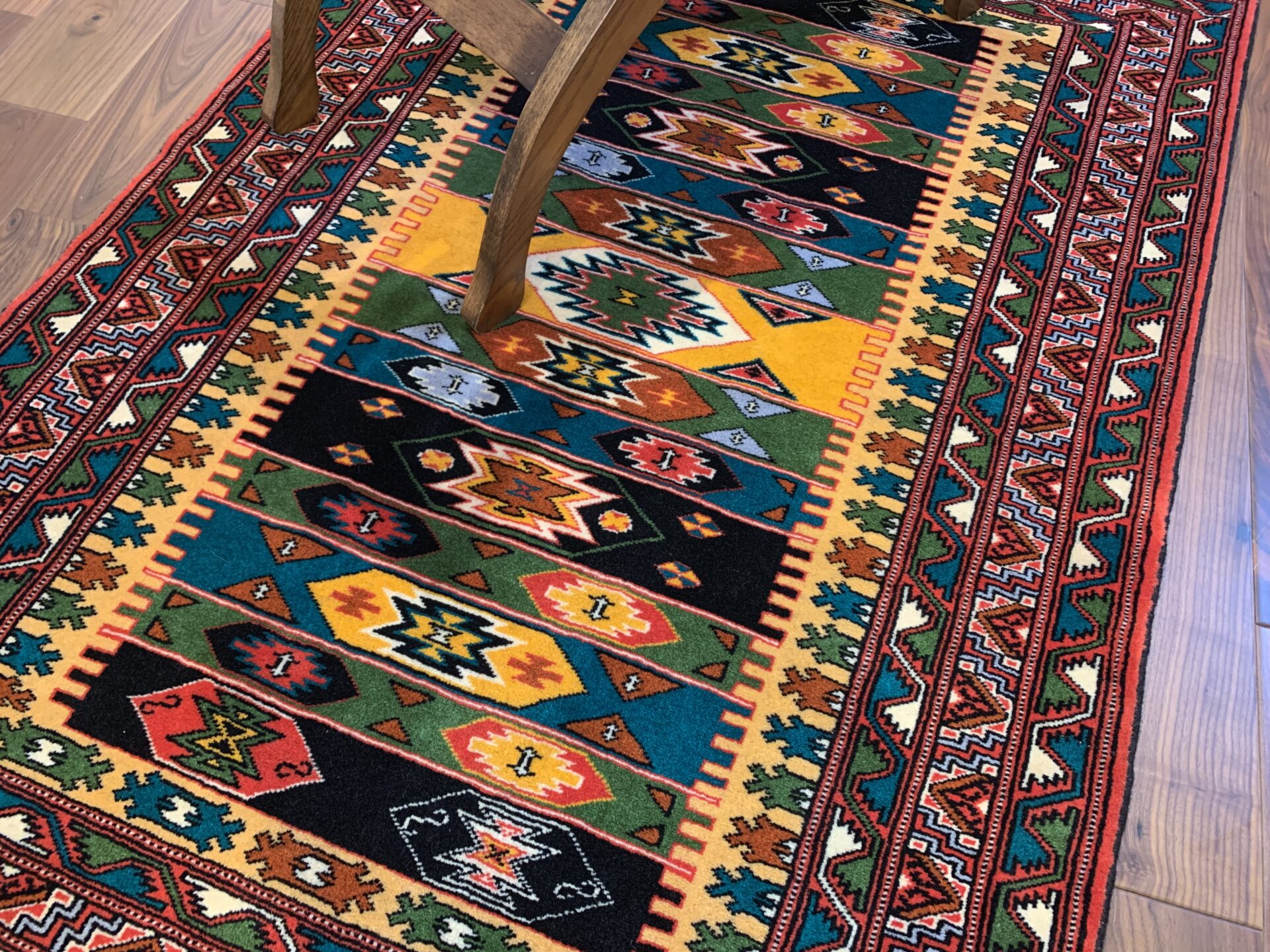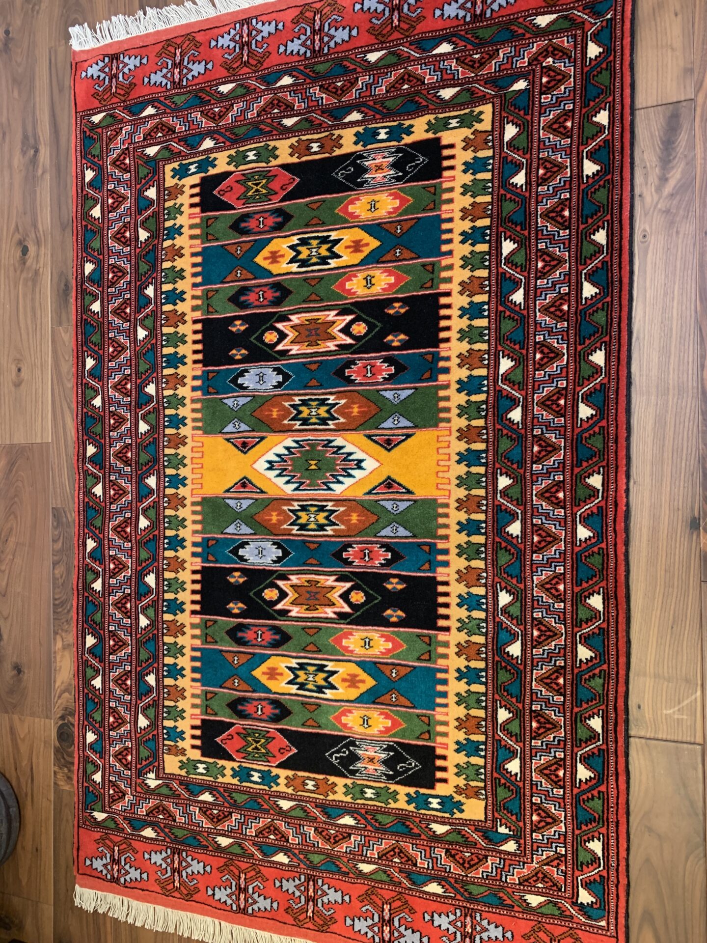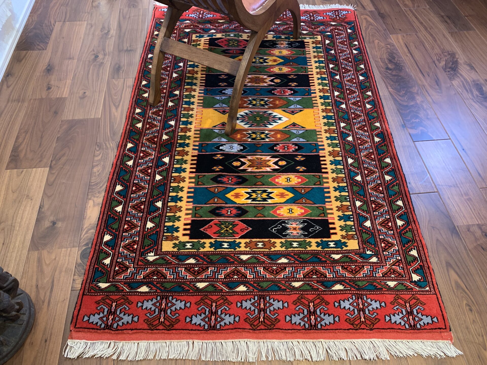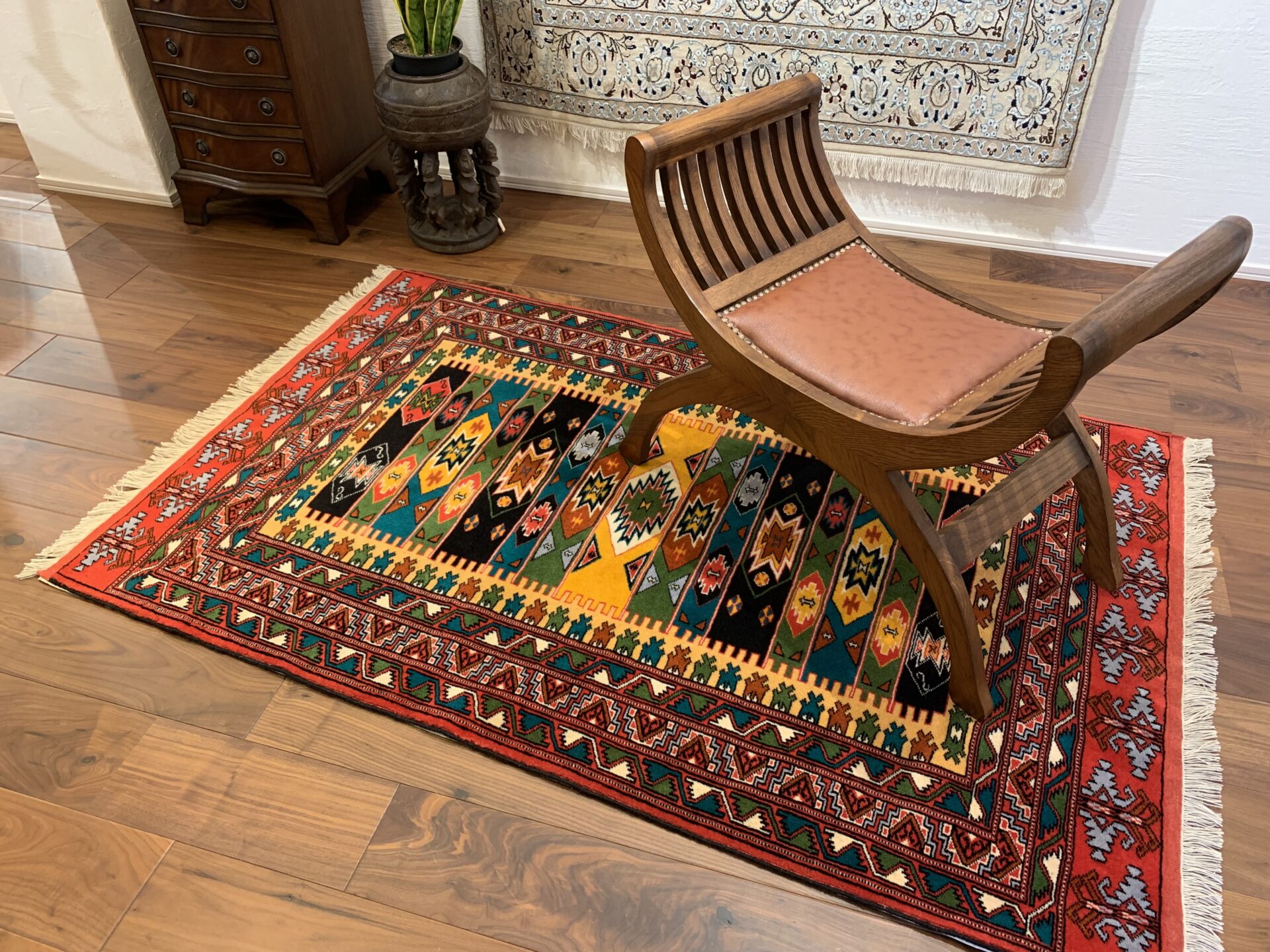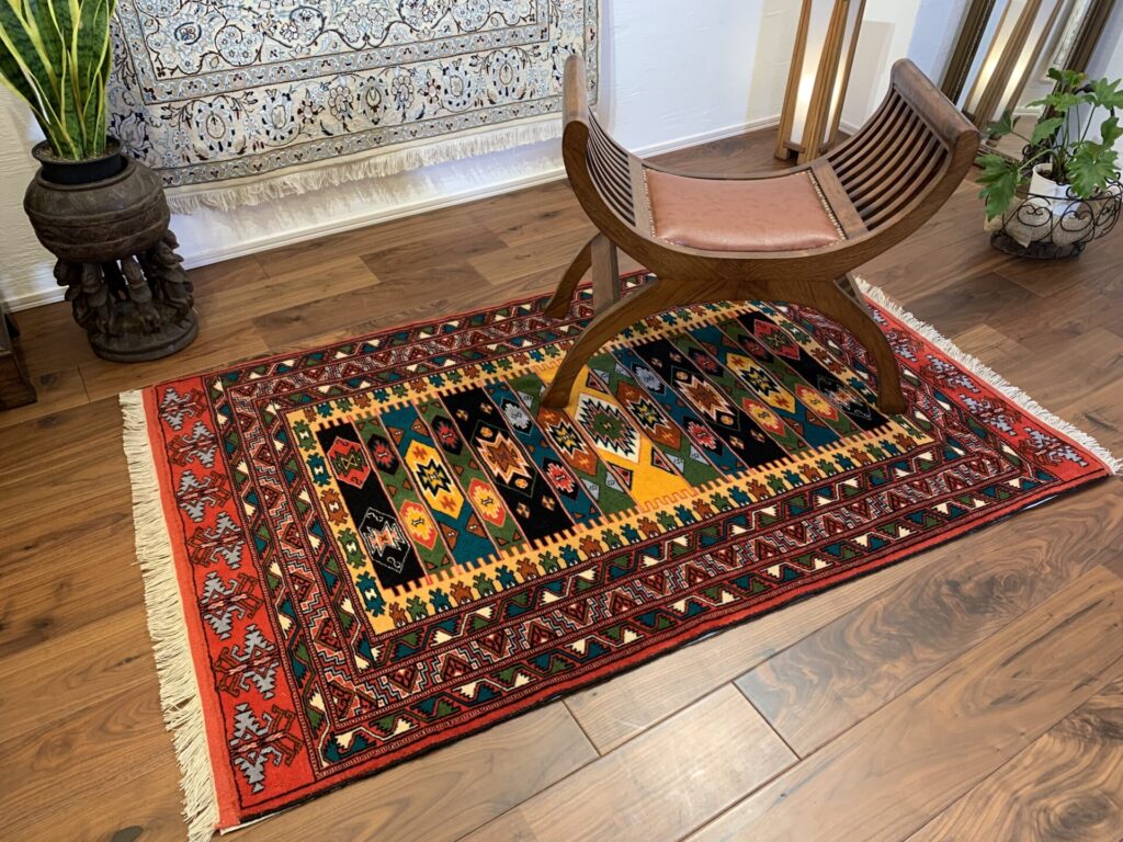 伝統のトルクメンらしい規律の中に、自由な色彩のリズムが踊る、アートのような一枚です。