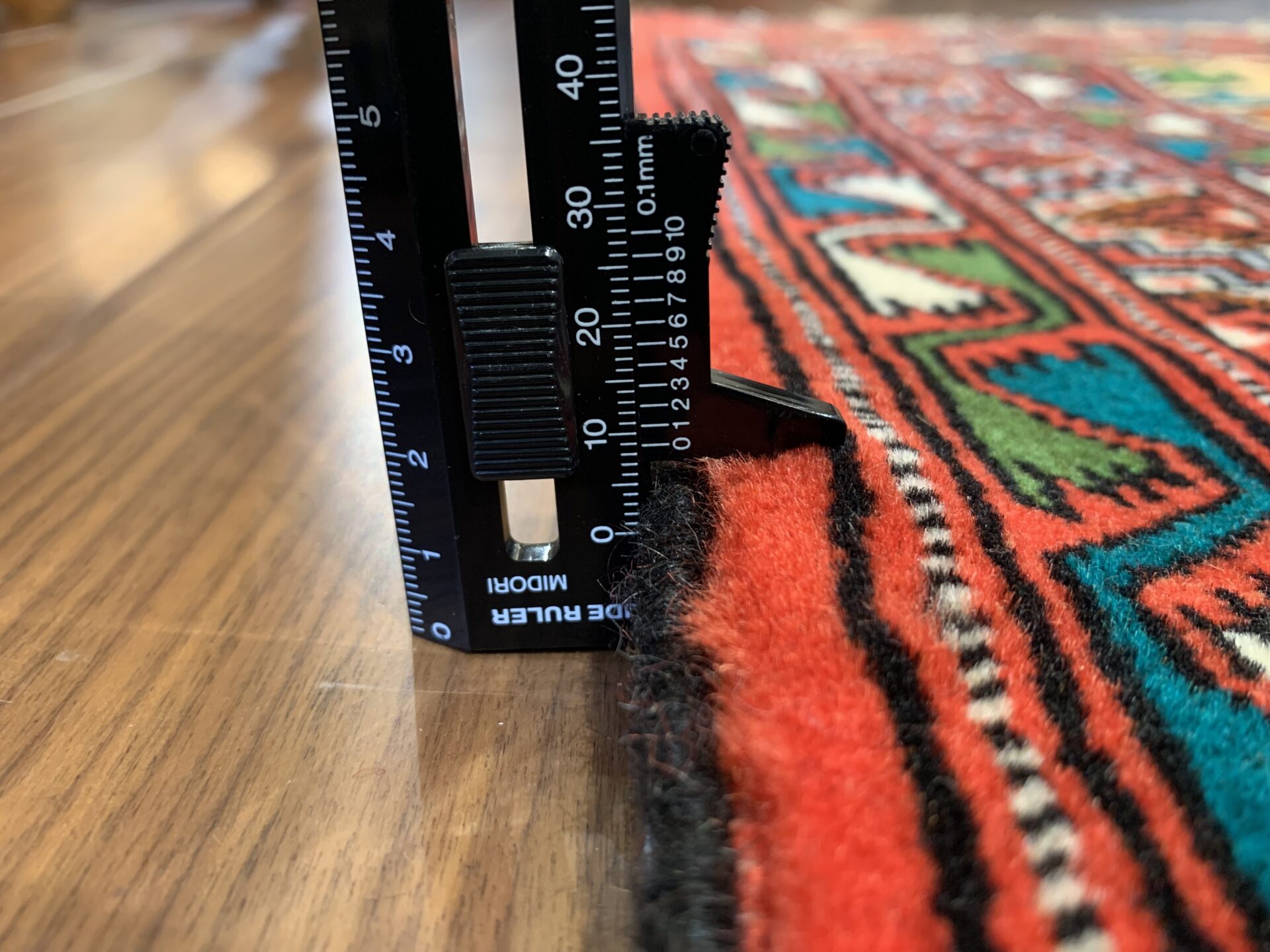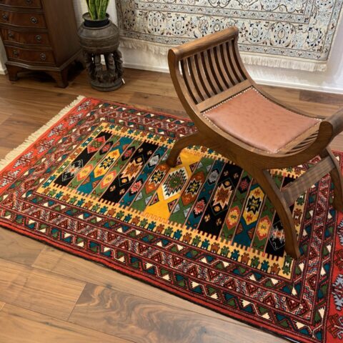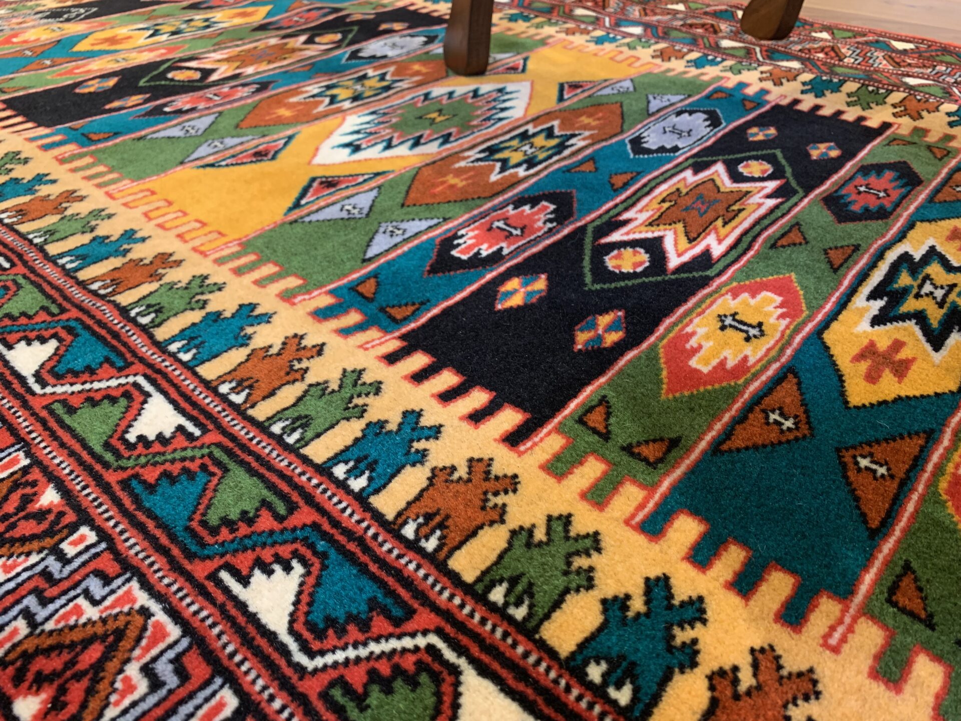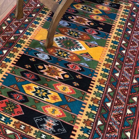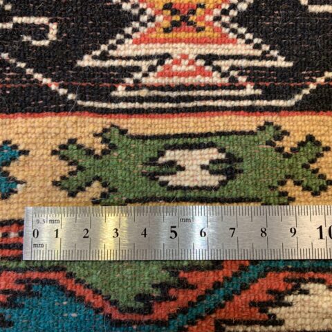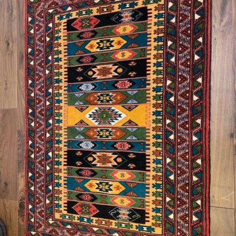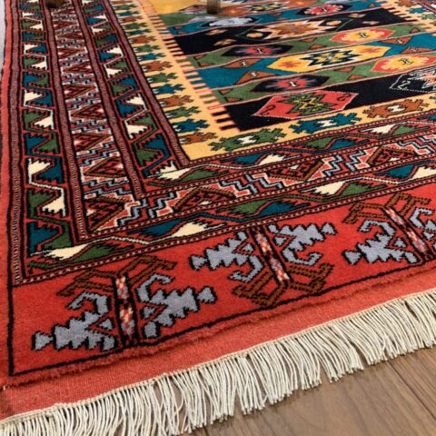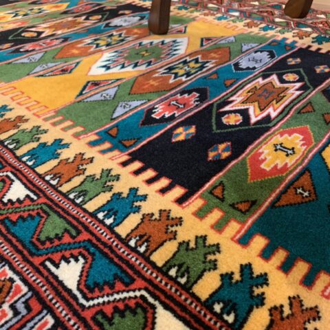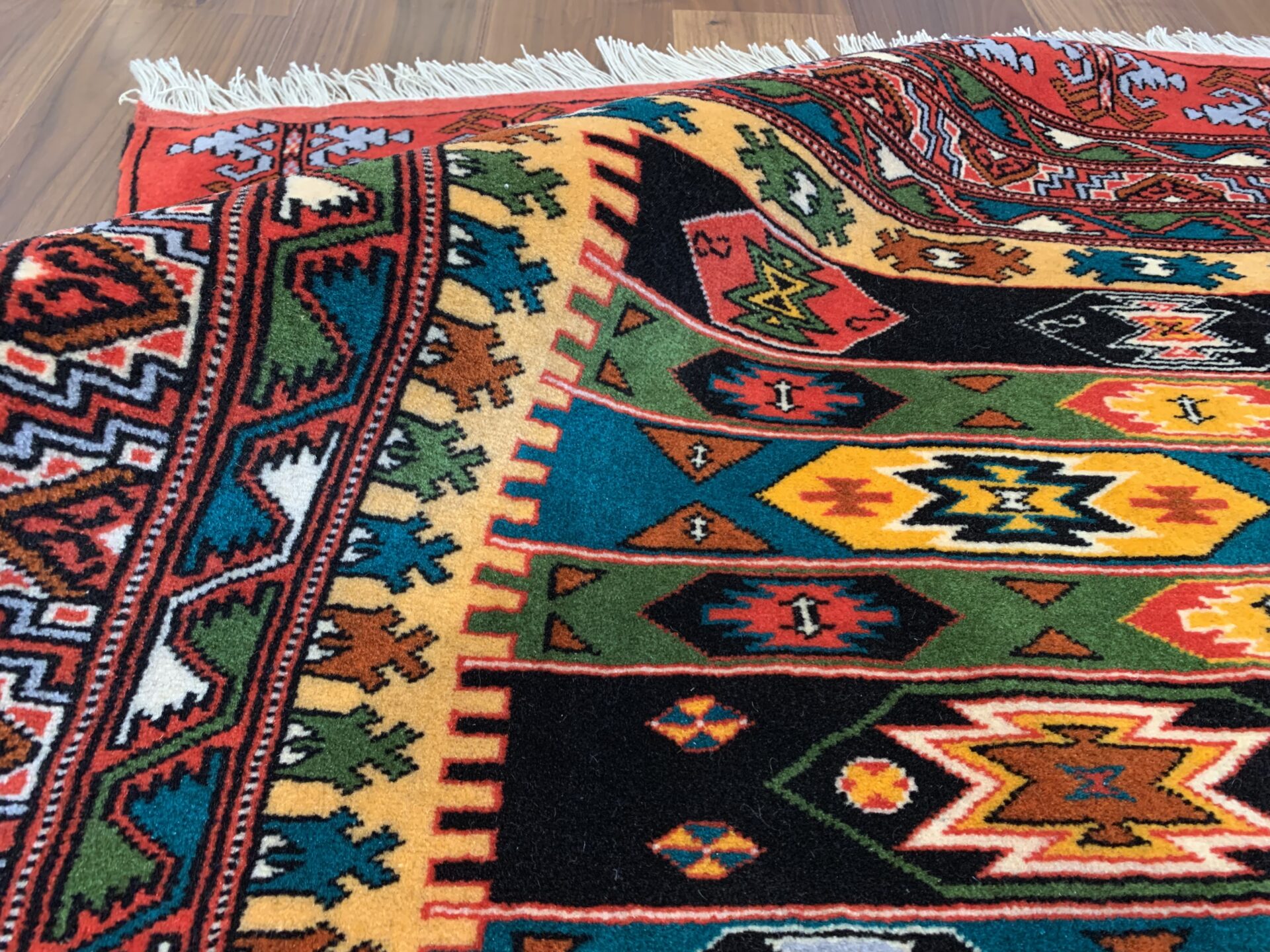 伝統のトルクメンらしい規律の中に、自由な色彩のリズムが踊る、アートのような一枚です。