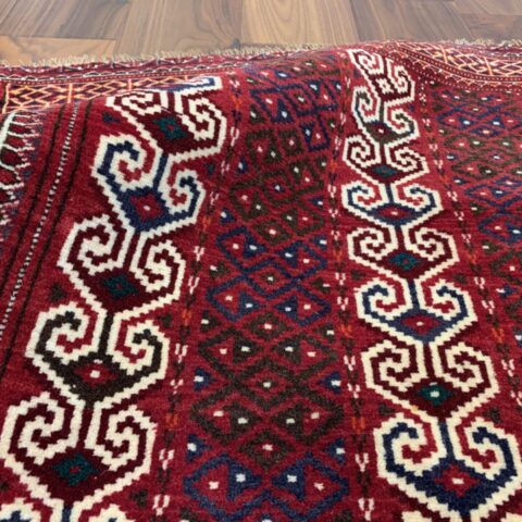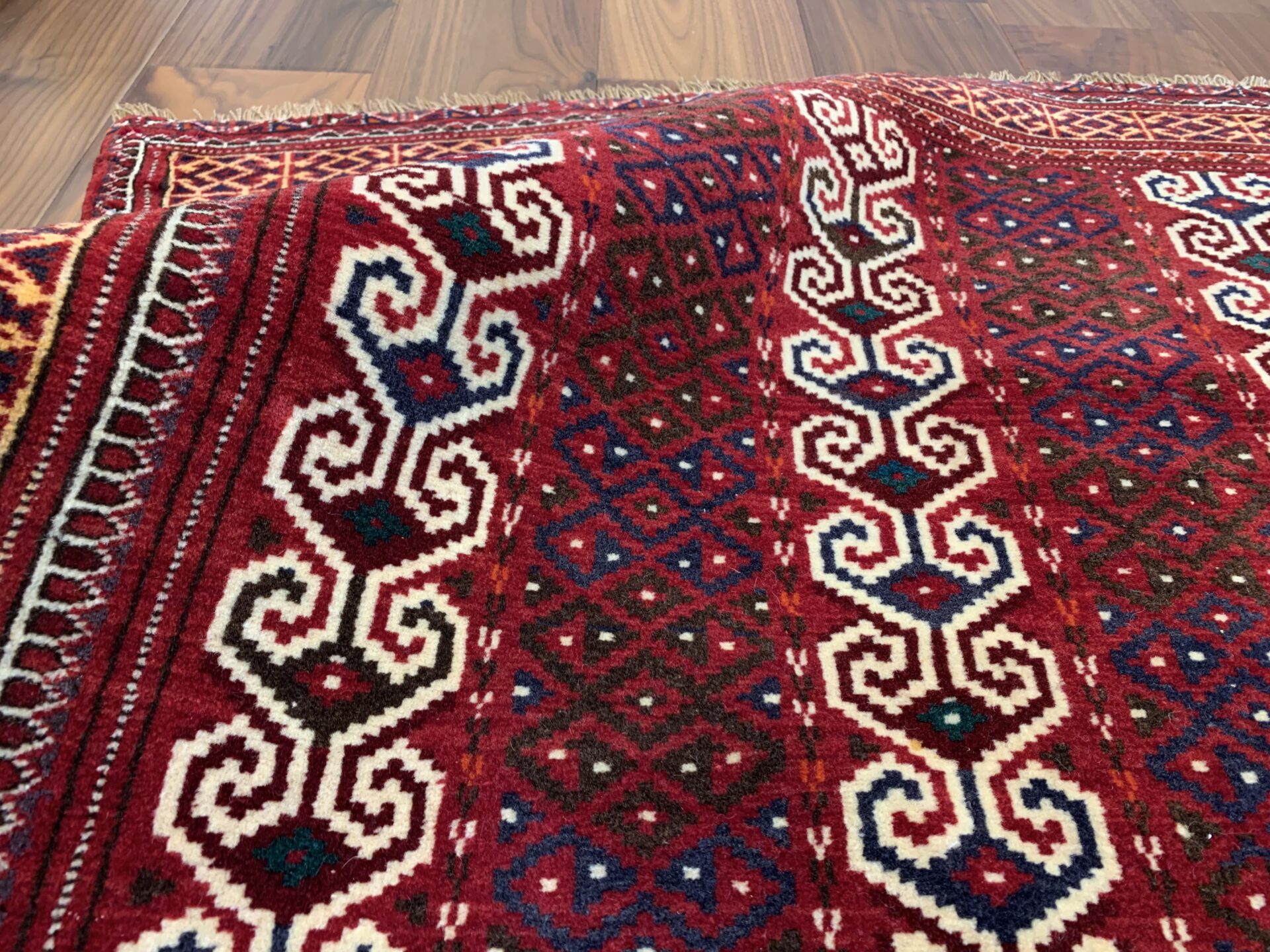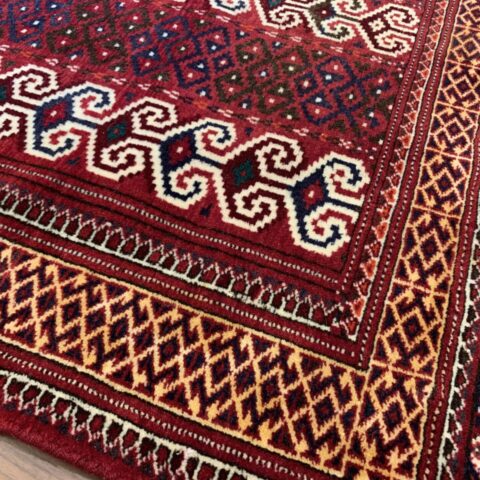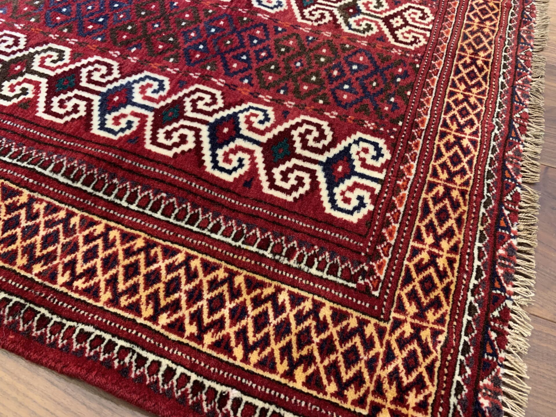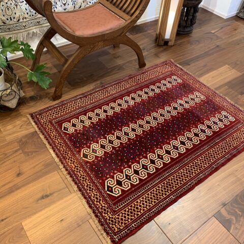 この一枚は、トルクメン伝統の色——深紅の赤を基調とした、力強くも上品な美しさを放ちます。