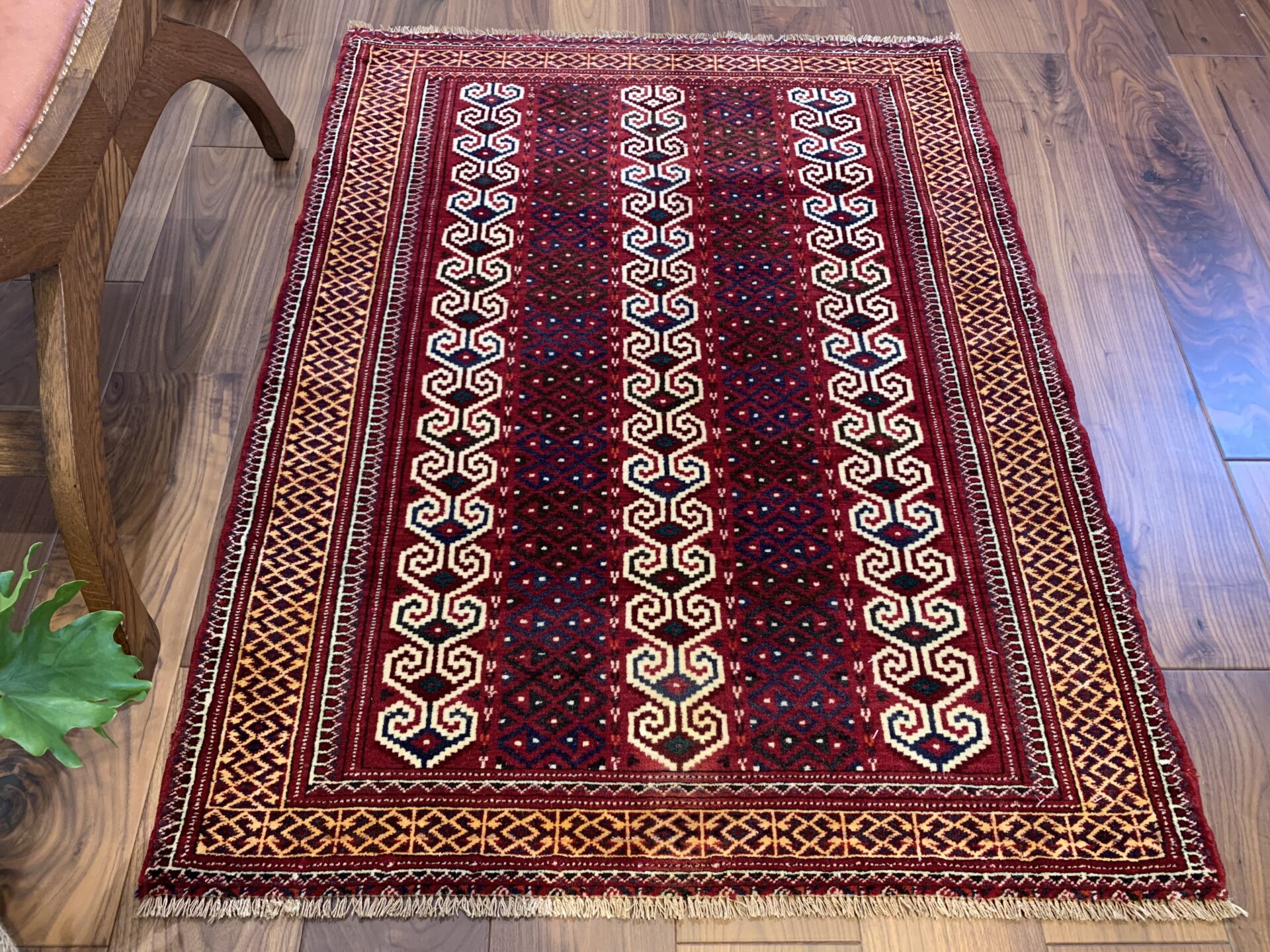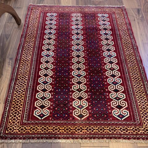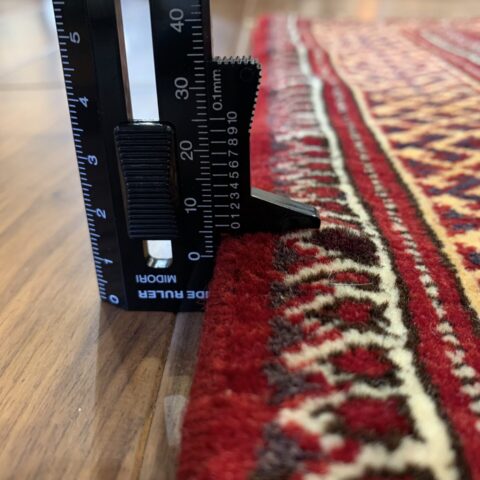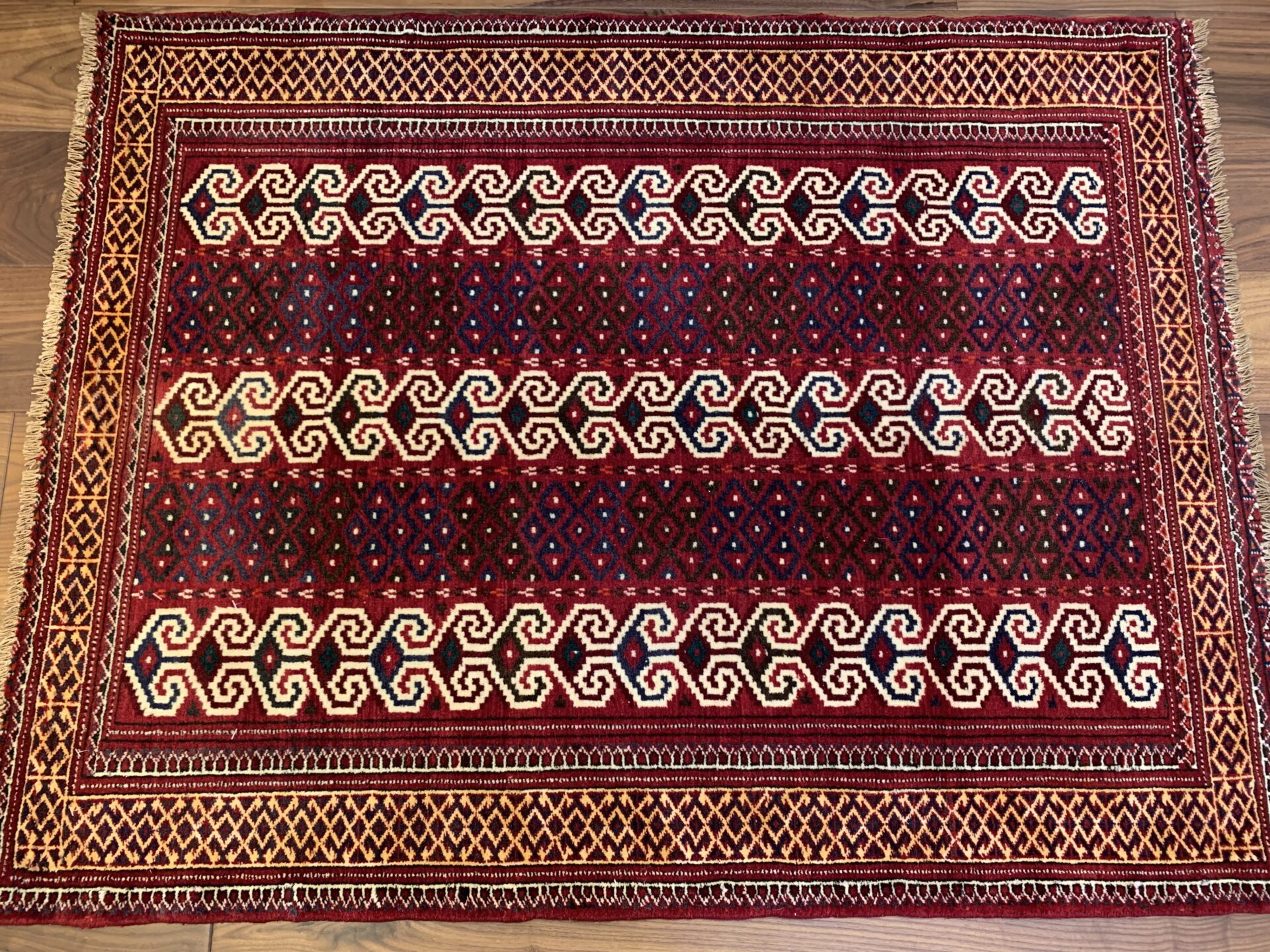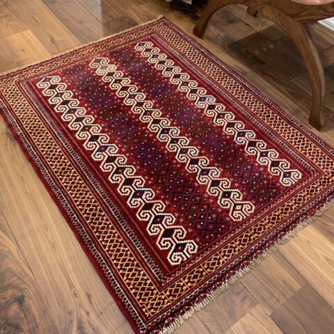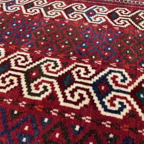 この一枚は、トルクメン伝統の色——深紅の赤を基調とした、力強くも上品な美しさを放ちます。