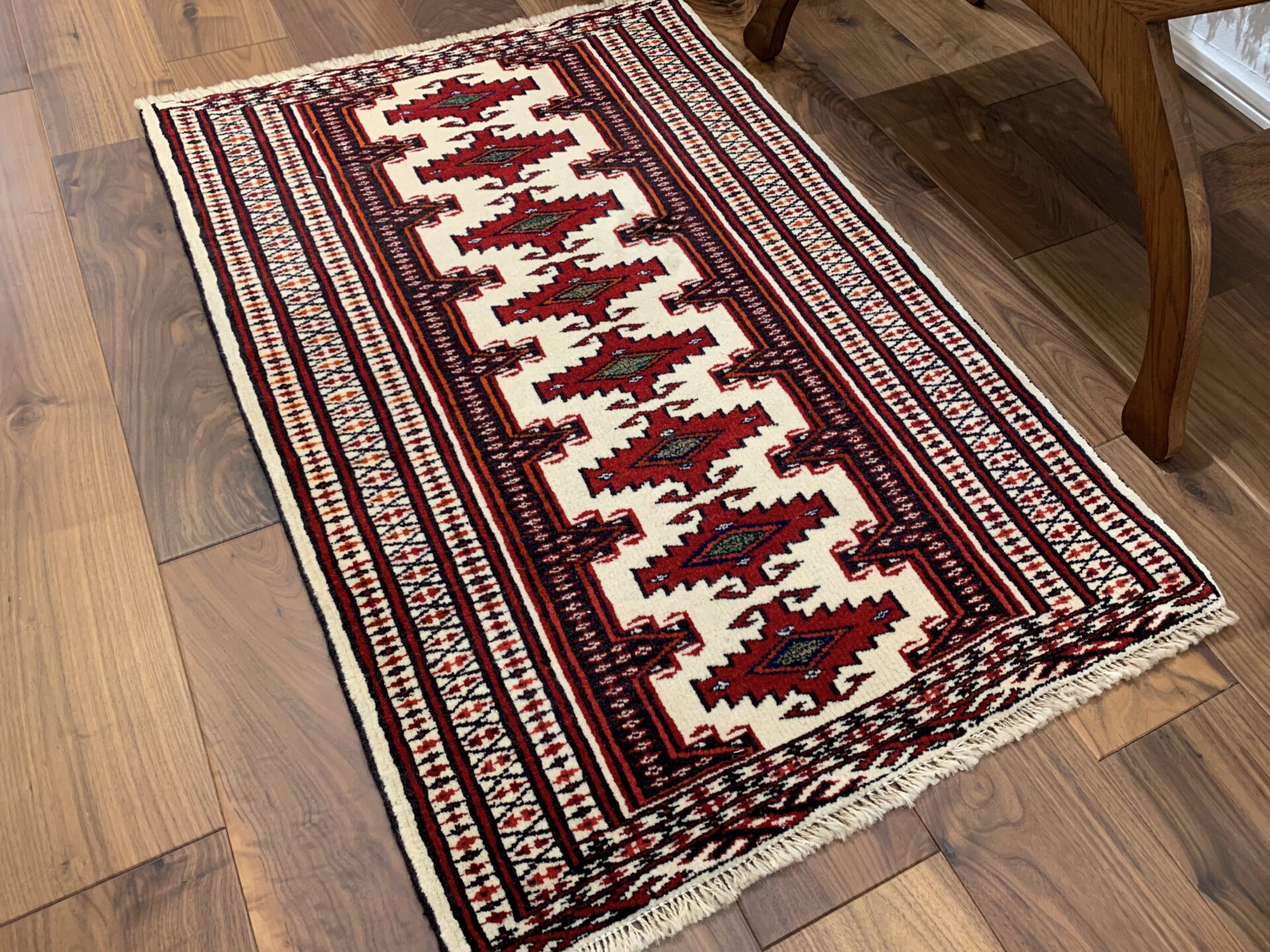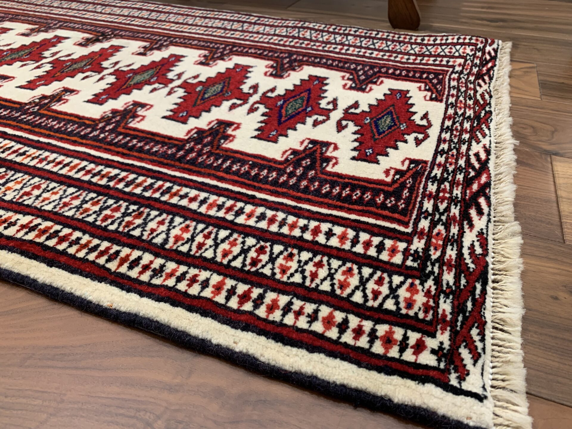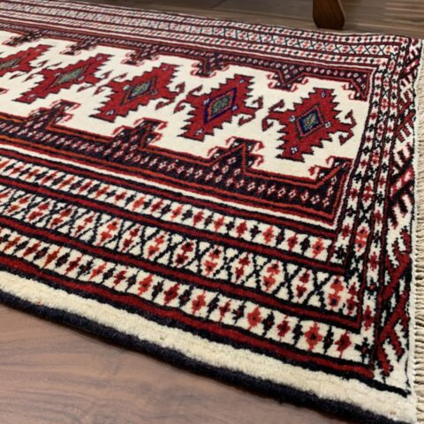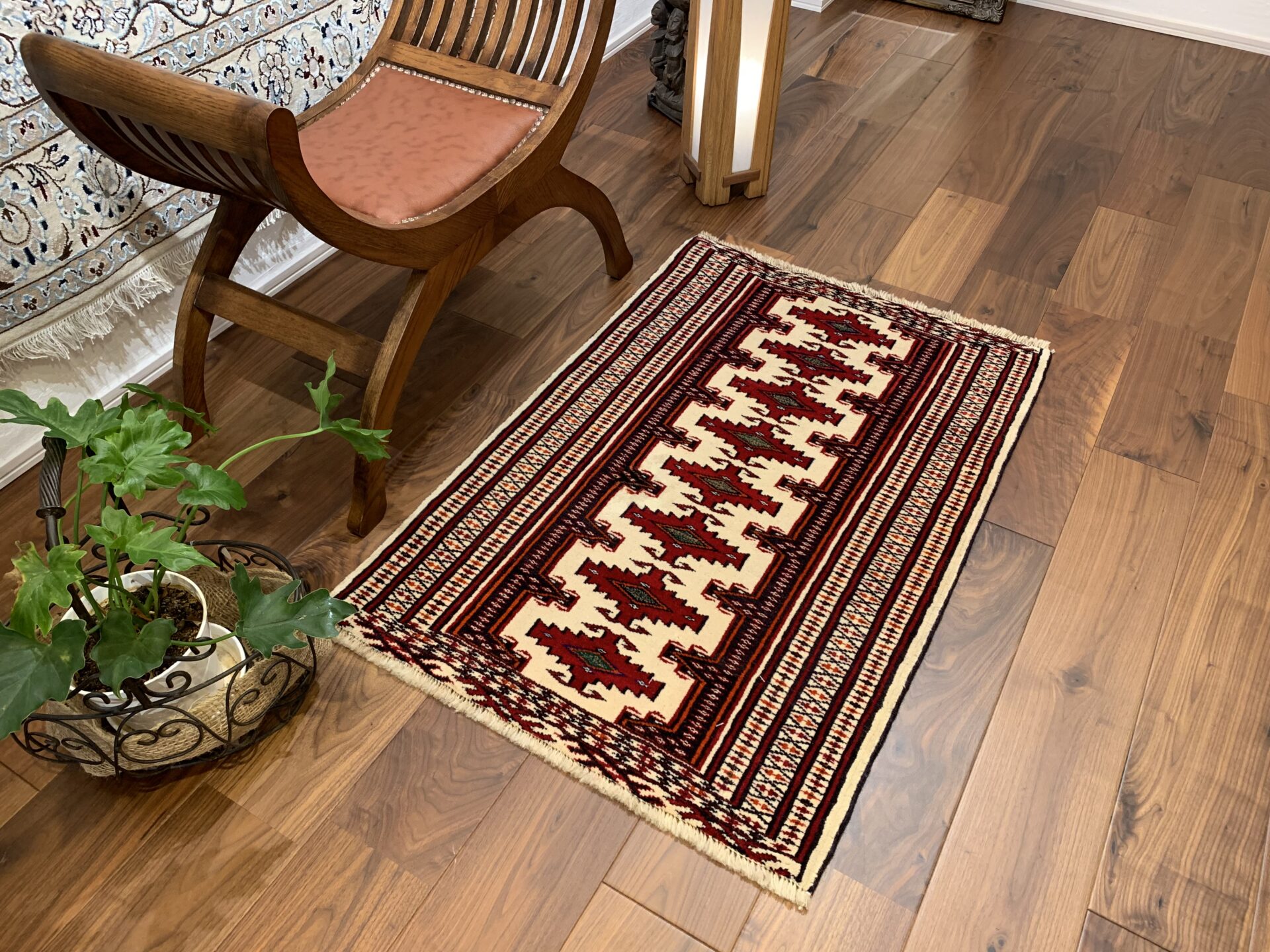 何重にも縁取りされた華やかなボーダーが目を引くトルクメン絨毯。