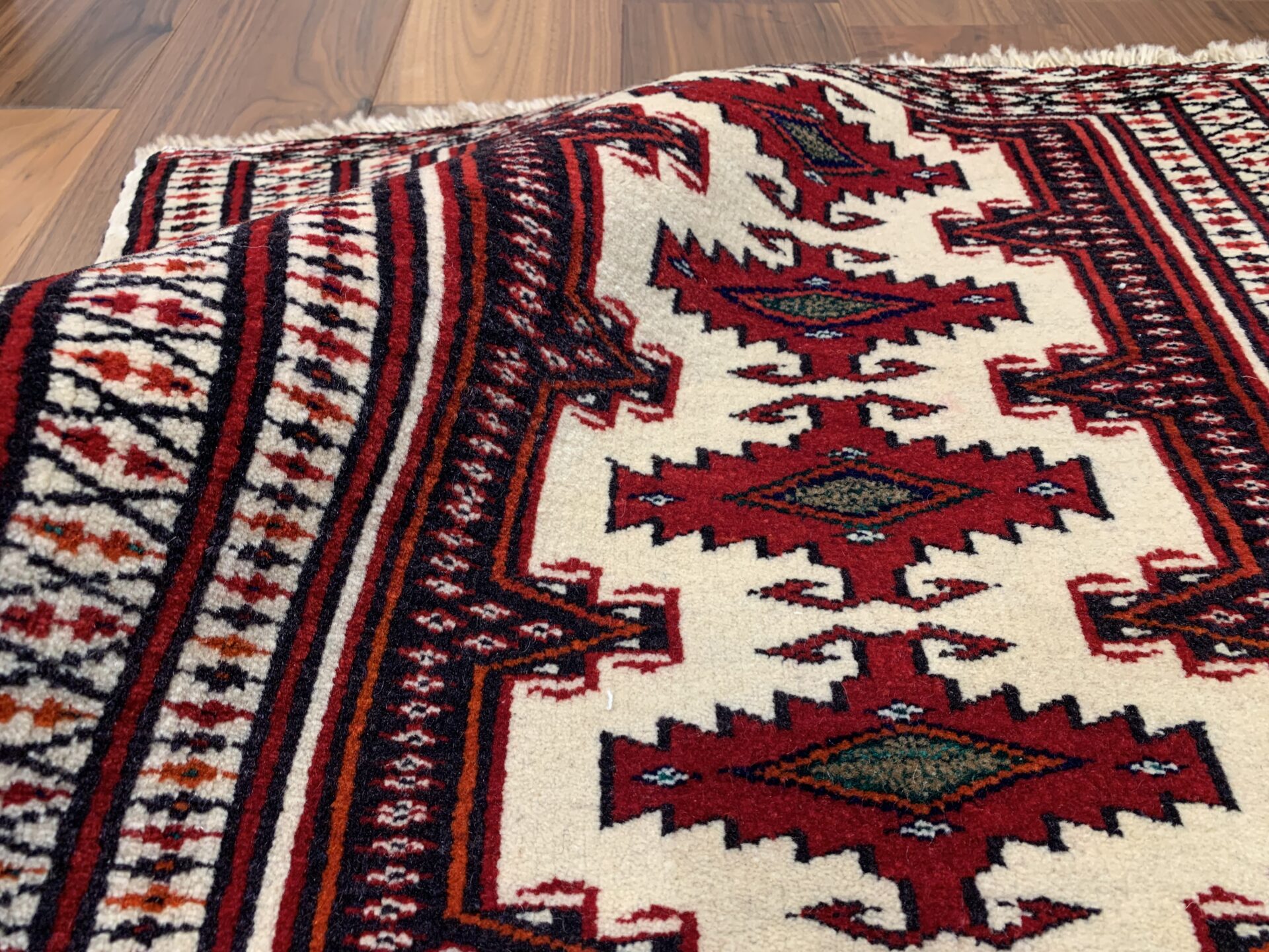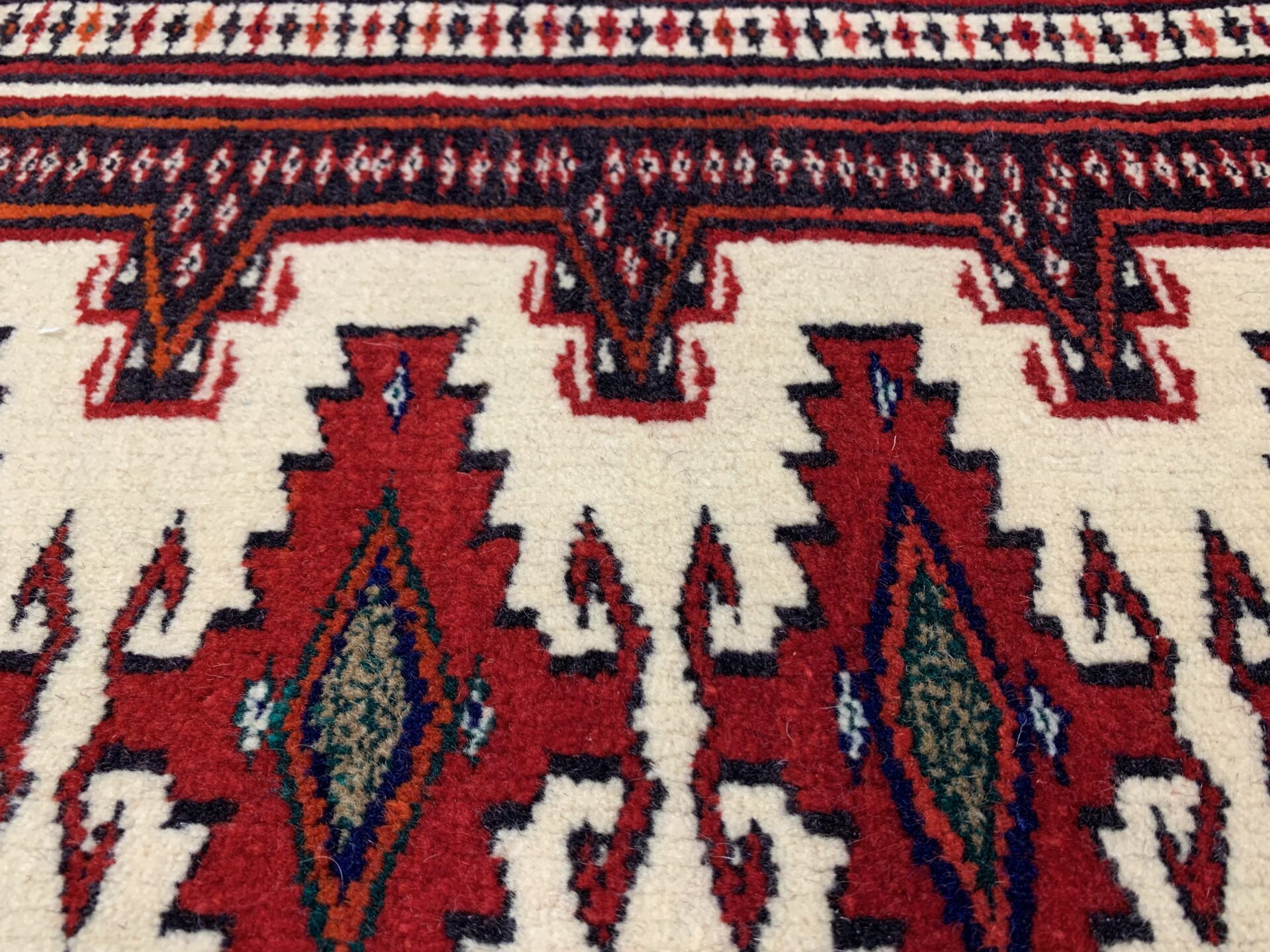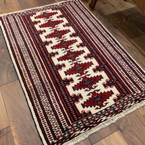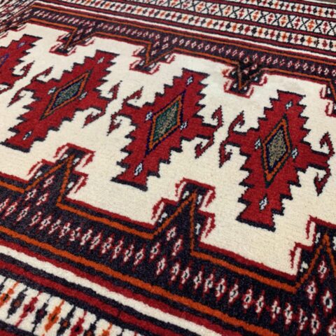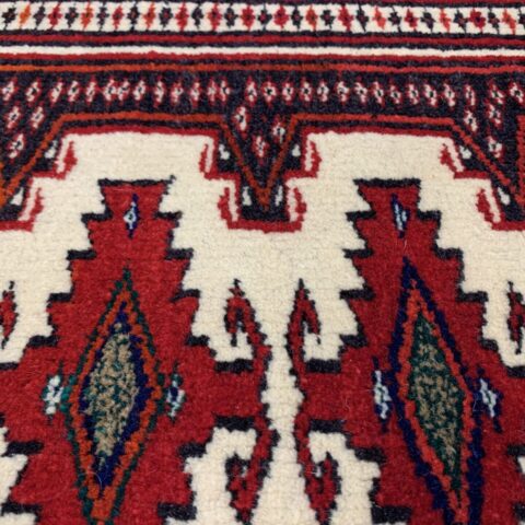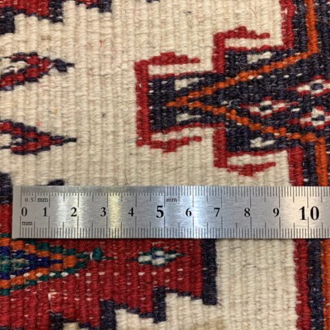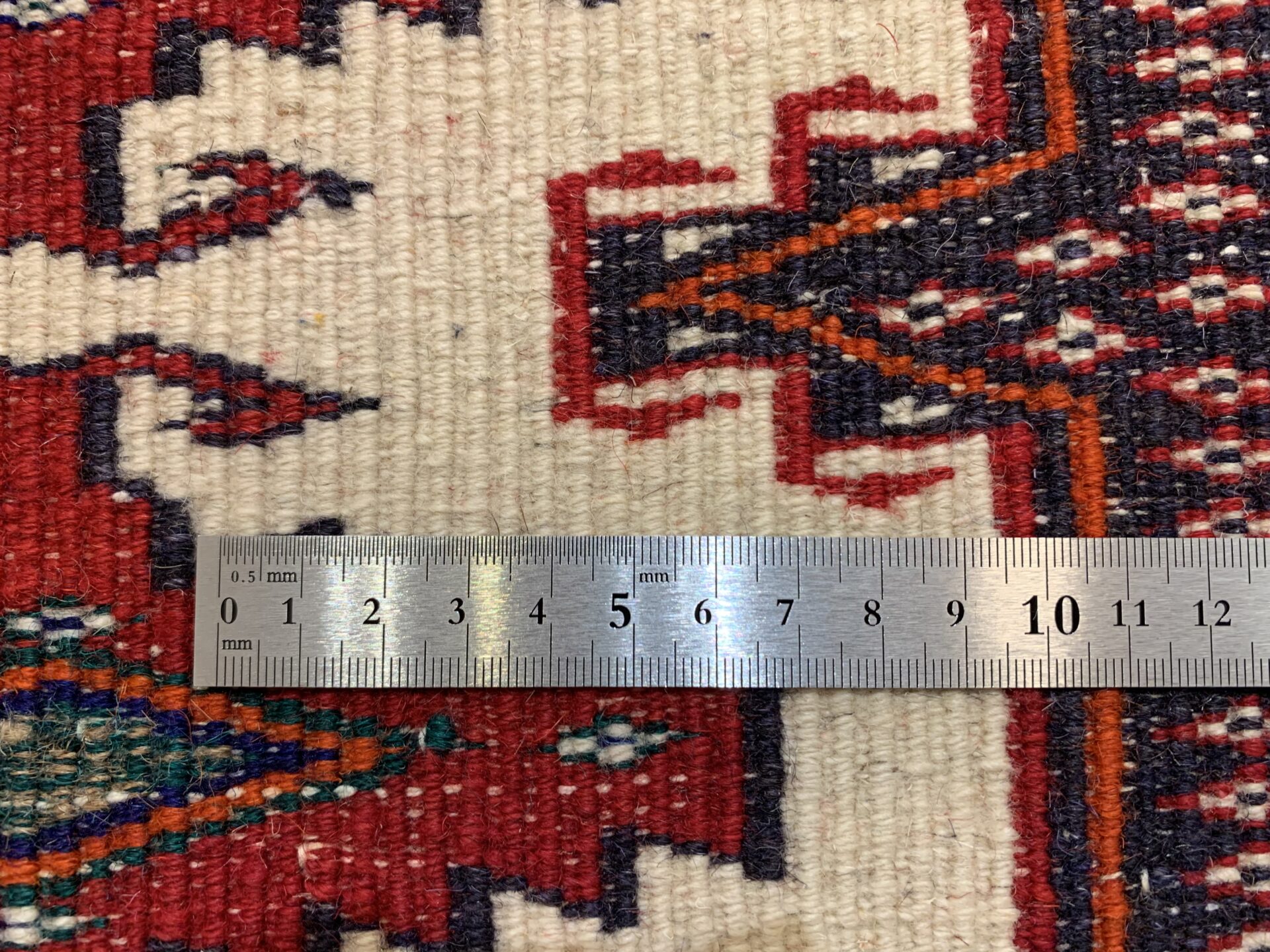 中央には大きな幾何学的な【ギュル(Gul)】紋様が整然と並び、部族の誇りと祈りを象徴するデザイン。