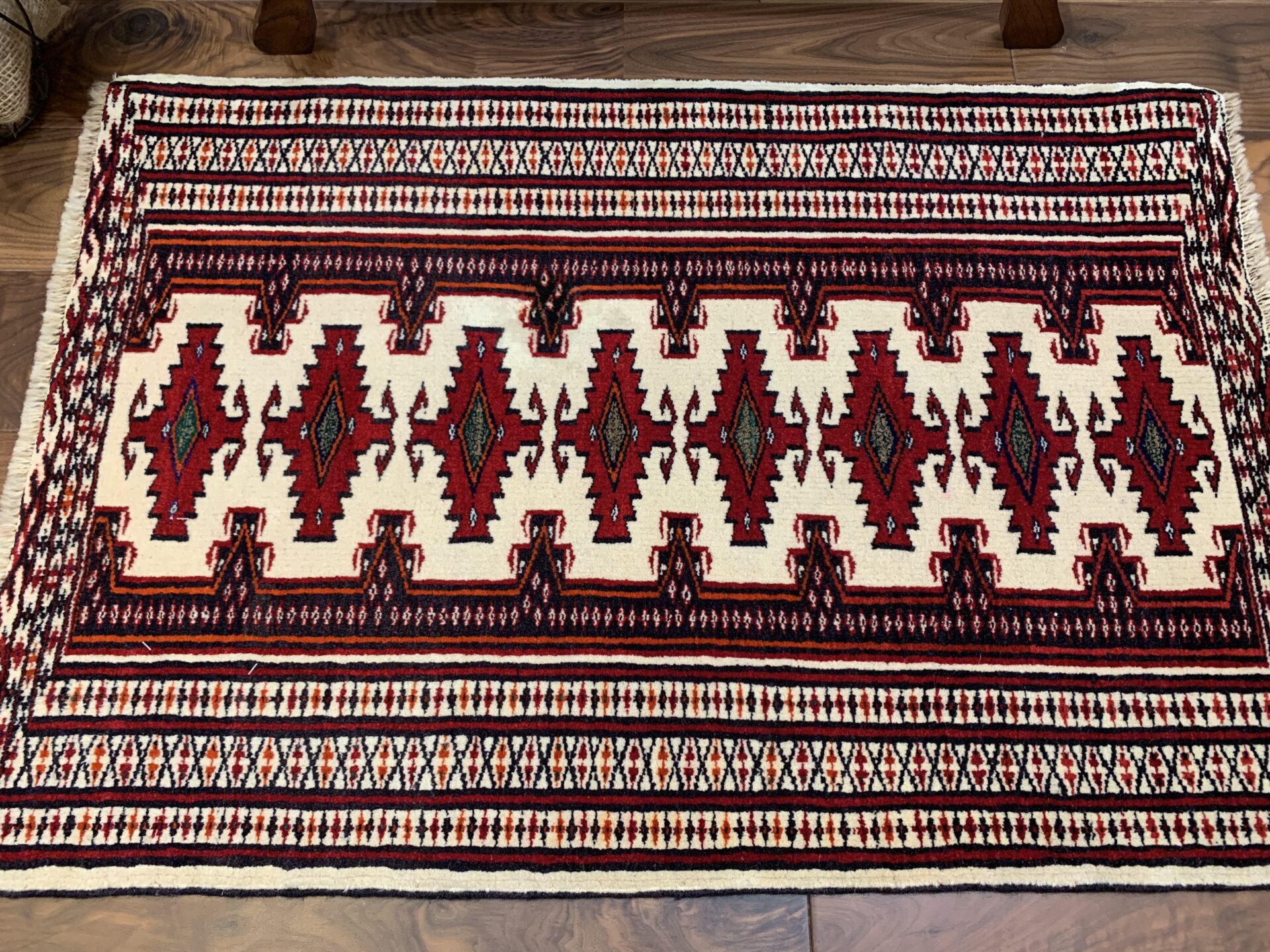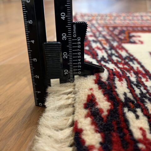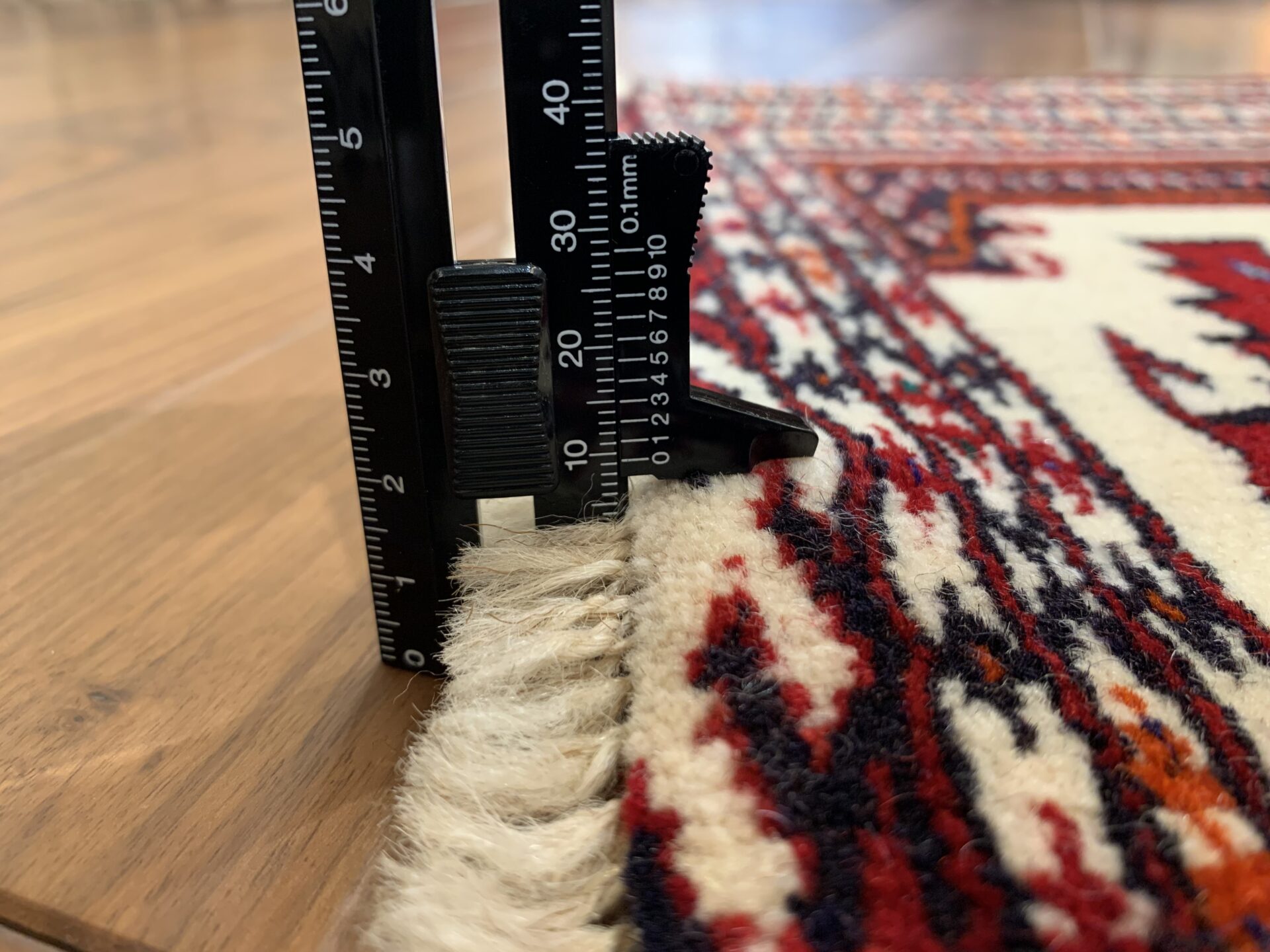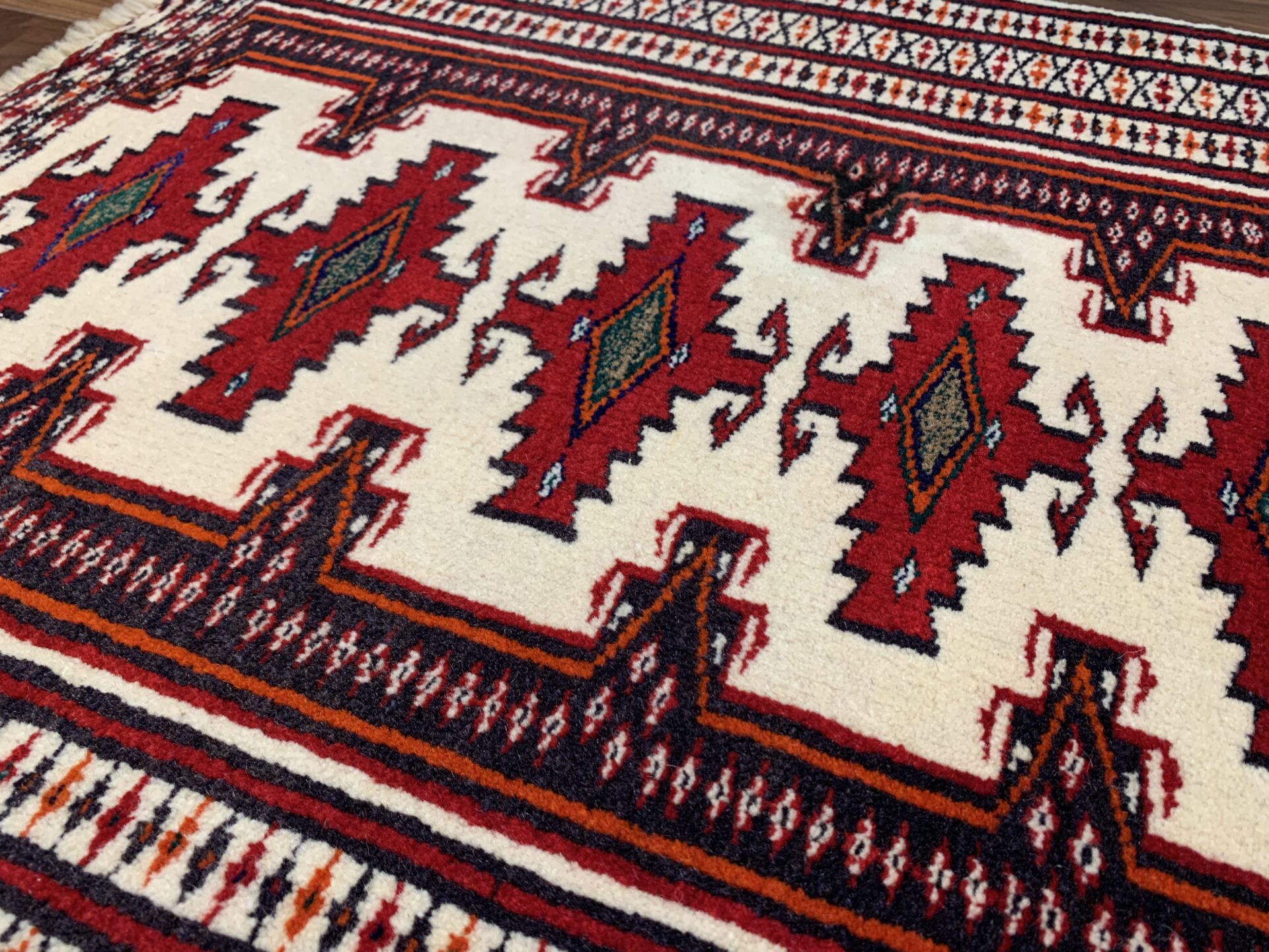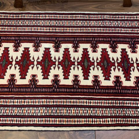 中央には大きな幾何学的な【ギュル(Gul)】紋様が整然と並び、部族の誇りと祈りを象徴するデザイン。