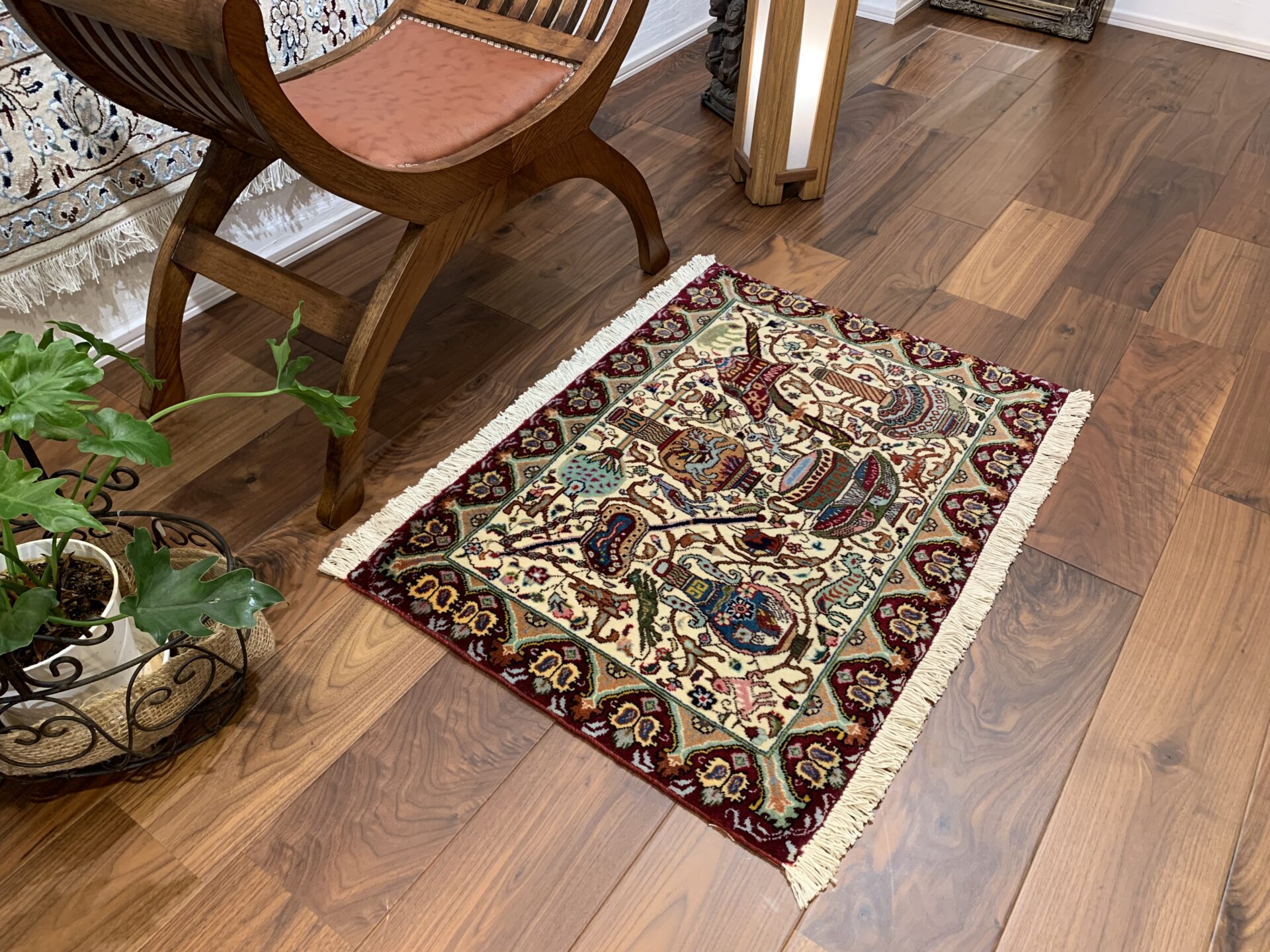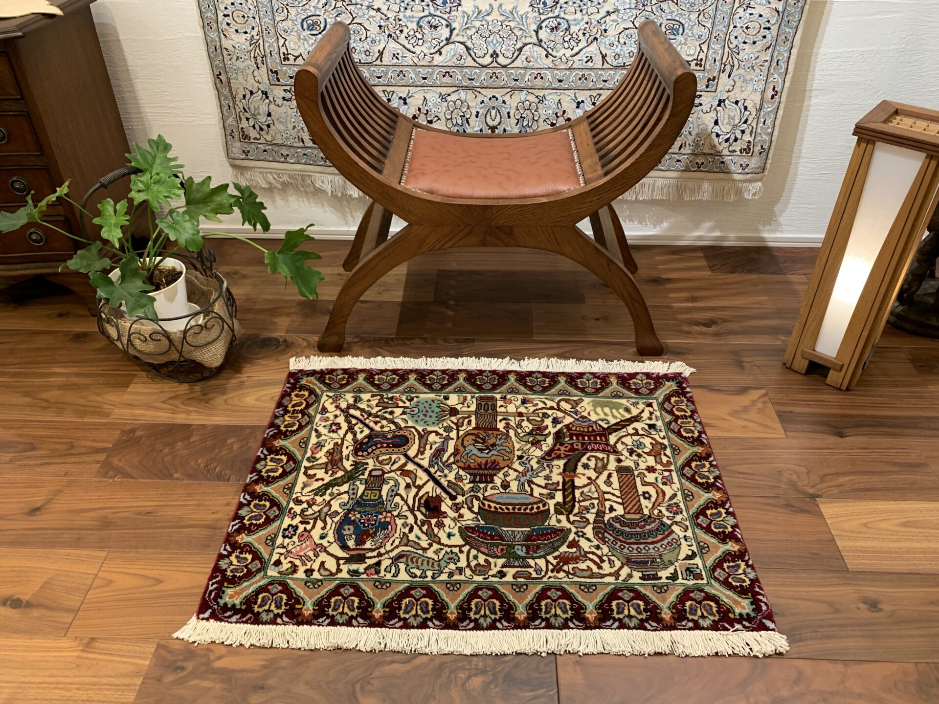 中央には、水差しや花瓶、動物、咲き誇る草花が対称的に配置され、それらをつなぐように唐草紋様が全体に流れるように展開されています。水差しや花瓶は生命・豊穣・祝福の意味を持ちます。様々な紋様と絡み合う唐草模様は、自然の調和と永続する命の流れを表現しており、一枚の織物に詩情と哲学が宿る作品となっています。