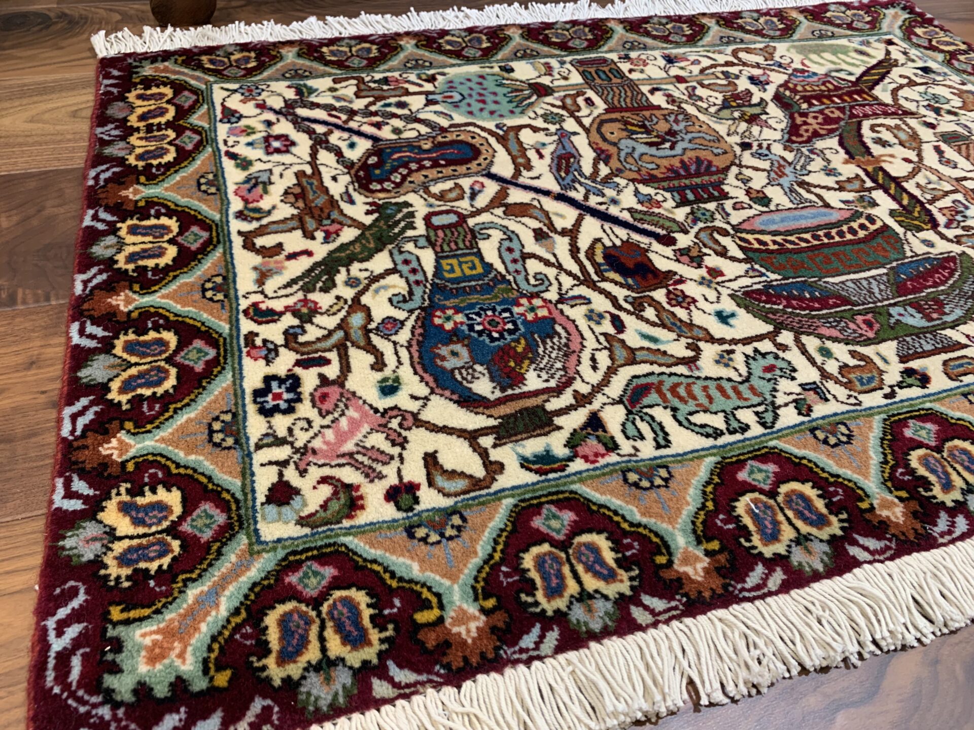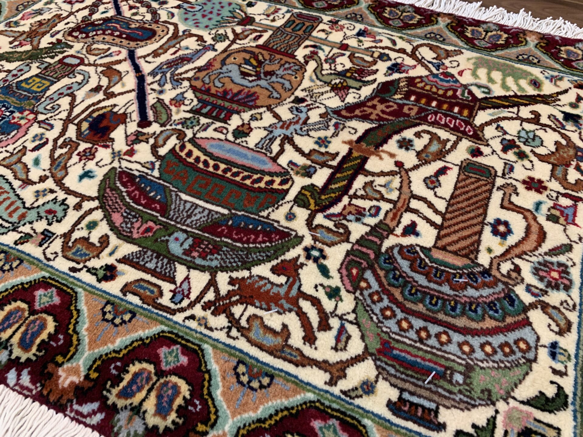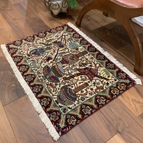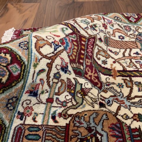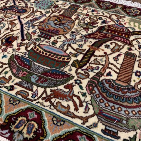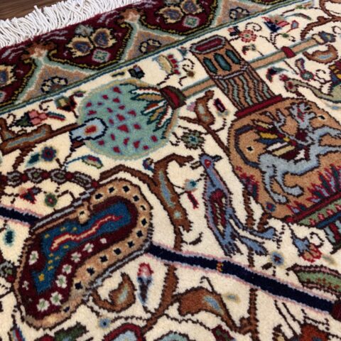 物語絵画のように構成された細密な図像が特徴のカシャーン産のペルシャ絨毯。