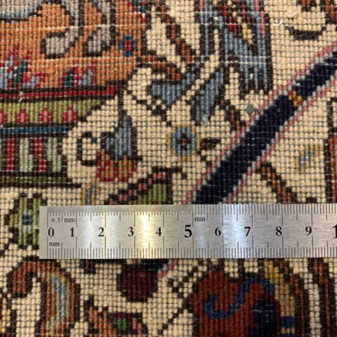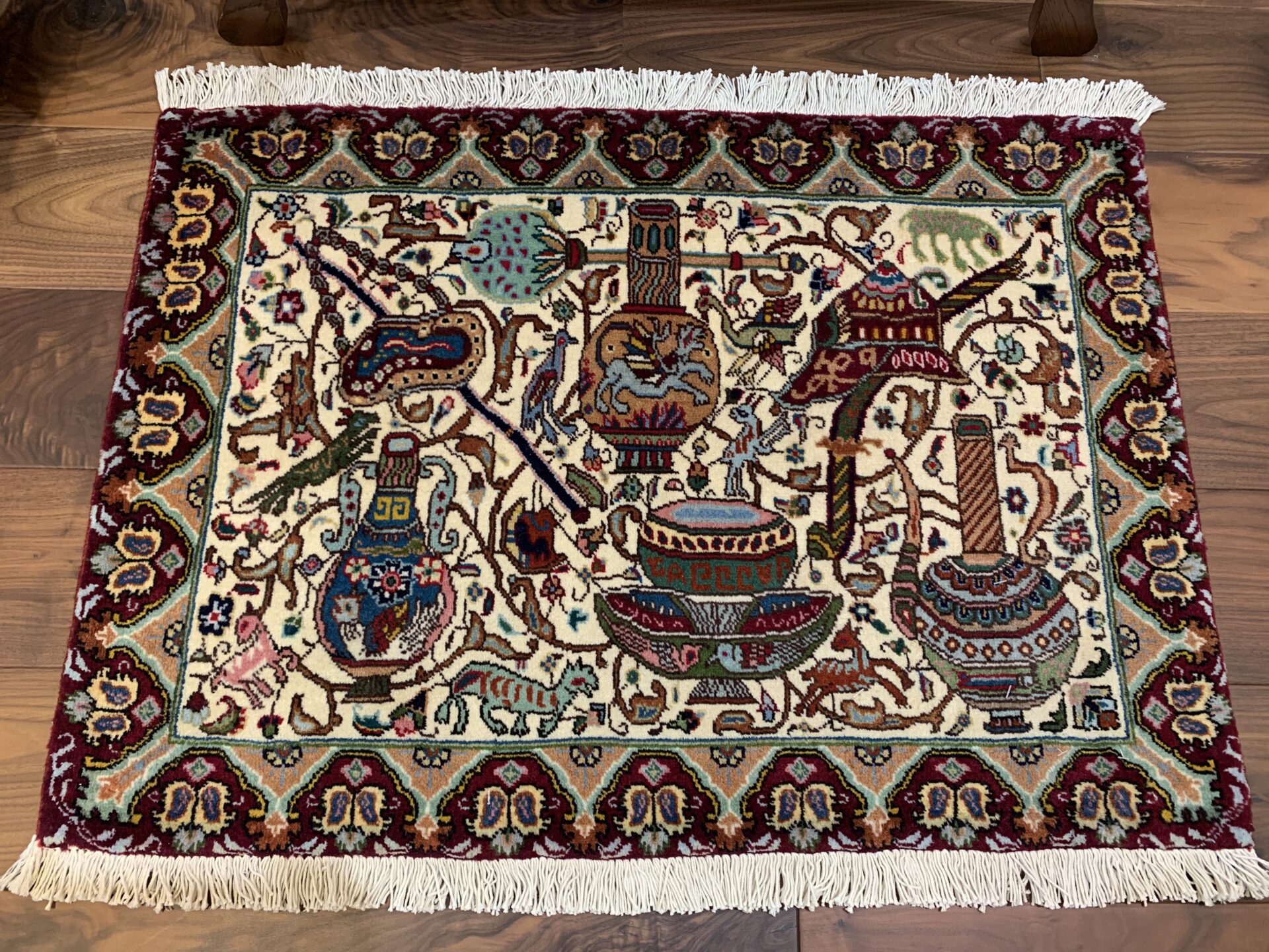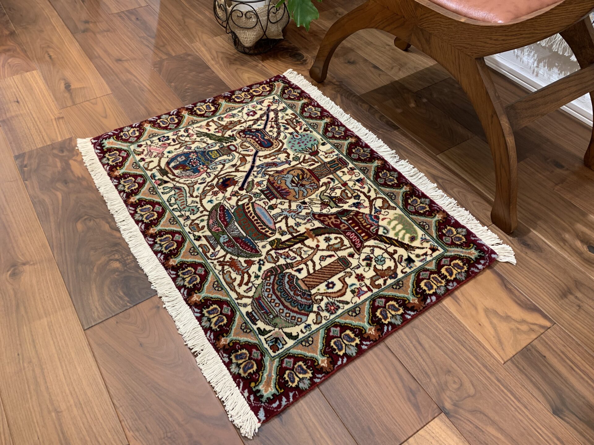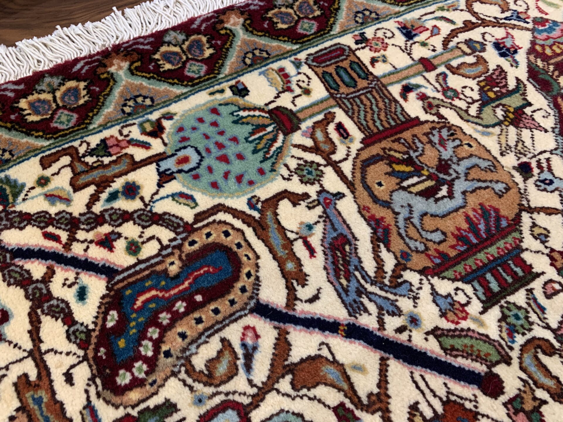 物語絵画のように構成された細密な図像が特徴のカシャーン産のペルシャ絨毯。