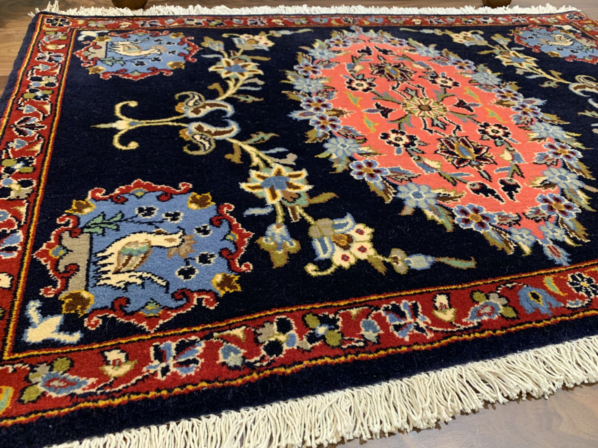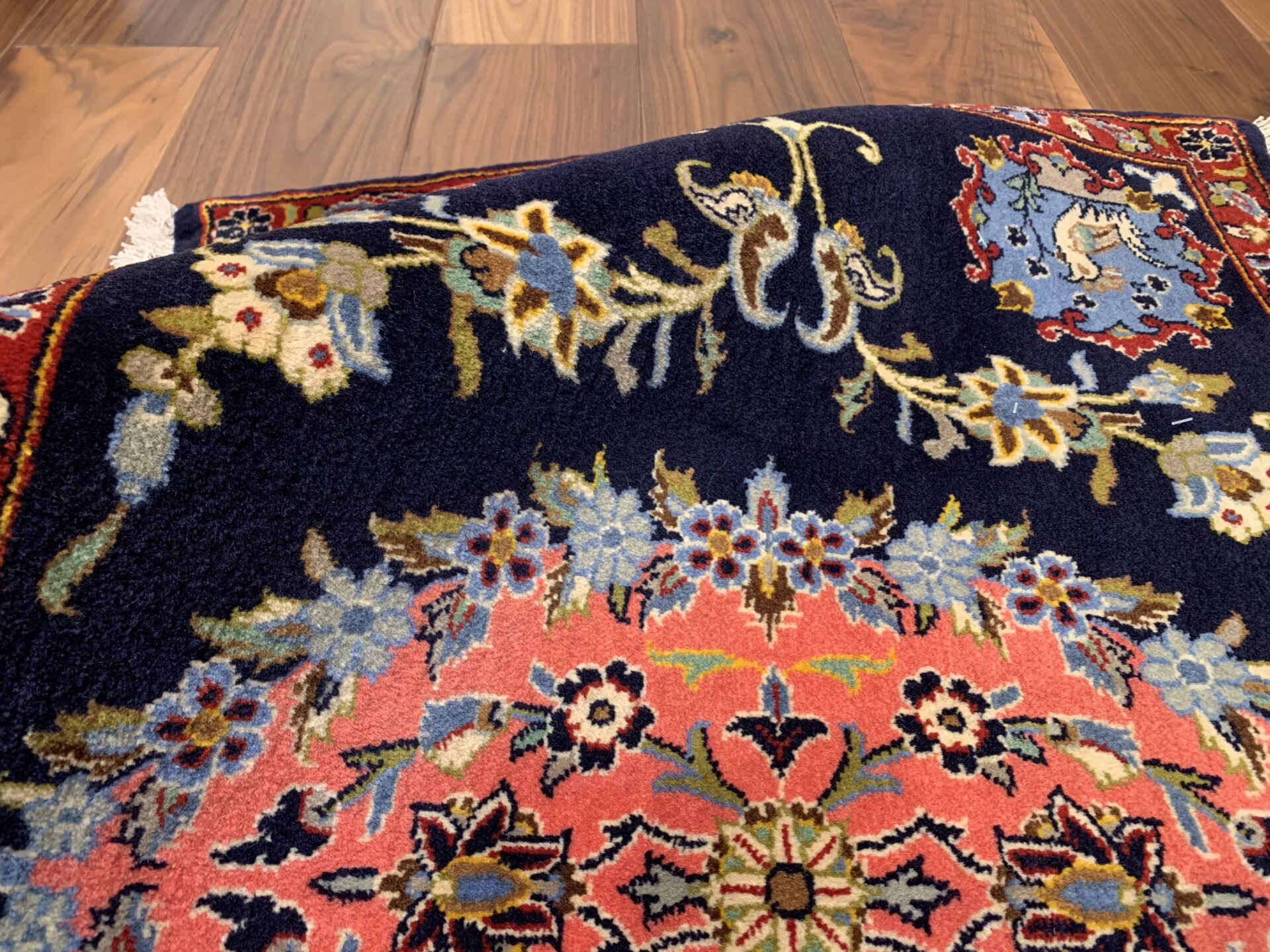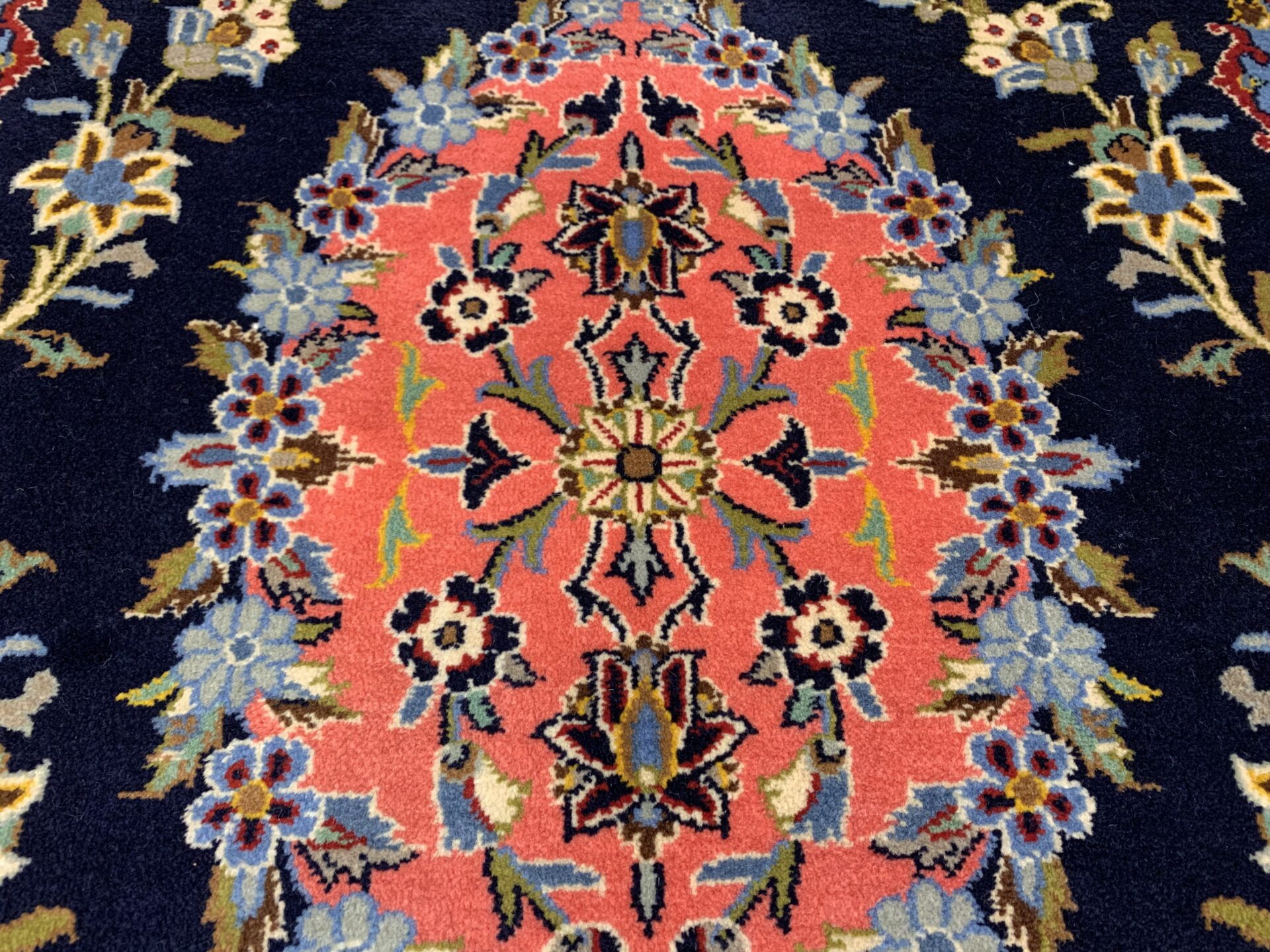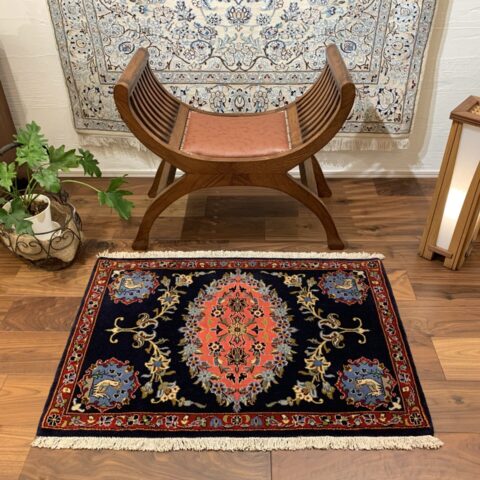 こちらはイラン・カシャーンで織られた、クラシックかつ華やかさを湛えたペルシャ絨毯。暗色背景に明るい中央モチーフを配した構成は、カシャーン絨毯の中でも非常に印象的で、空間の主役として強い存在感を放つ一枚です。