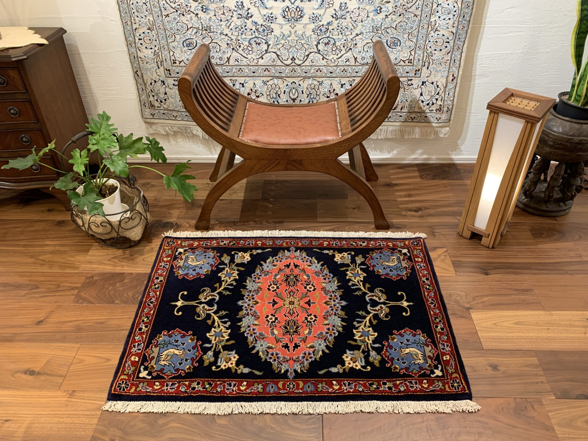 これはペルシャ絨毯において非常に象徴的な構成であり、自然・生命・調和・祝福などの意味を持つ意匠として古くから用いられてきました。中央から伸びるアラベスクが、空間に動きを与え、伝統と優美さを感じさせる作品です。