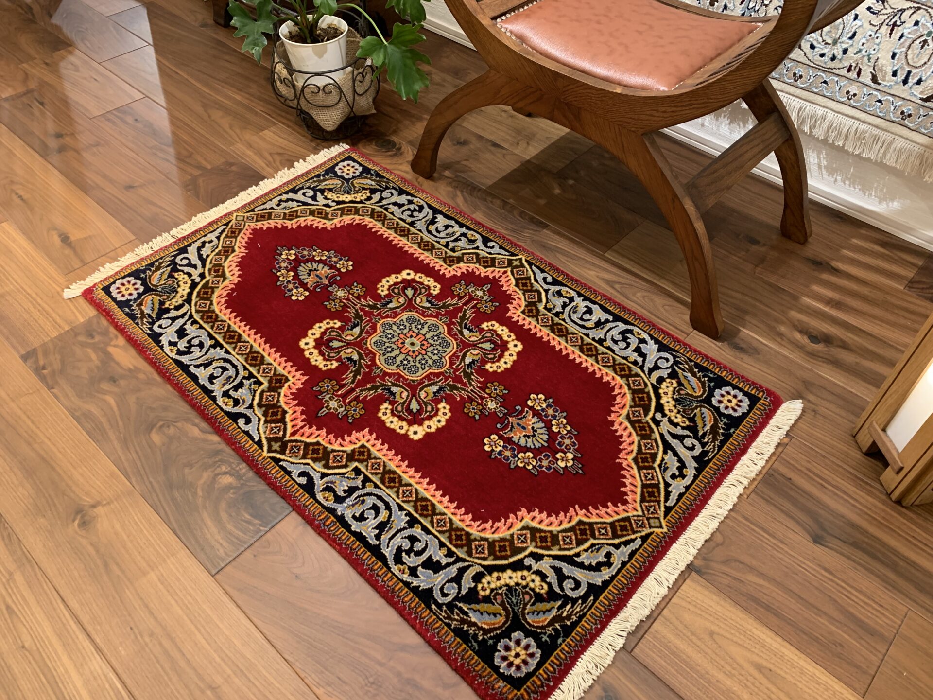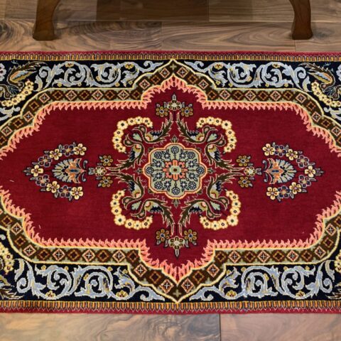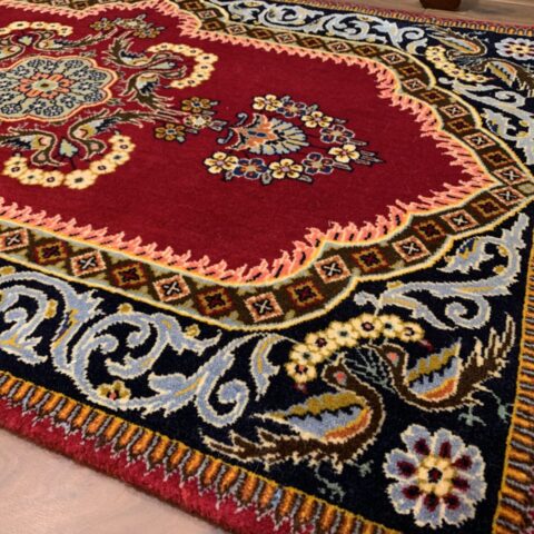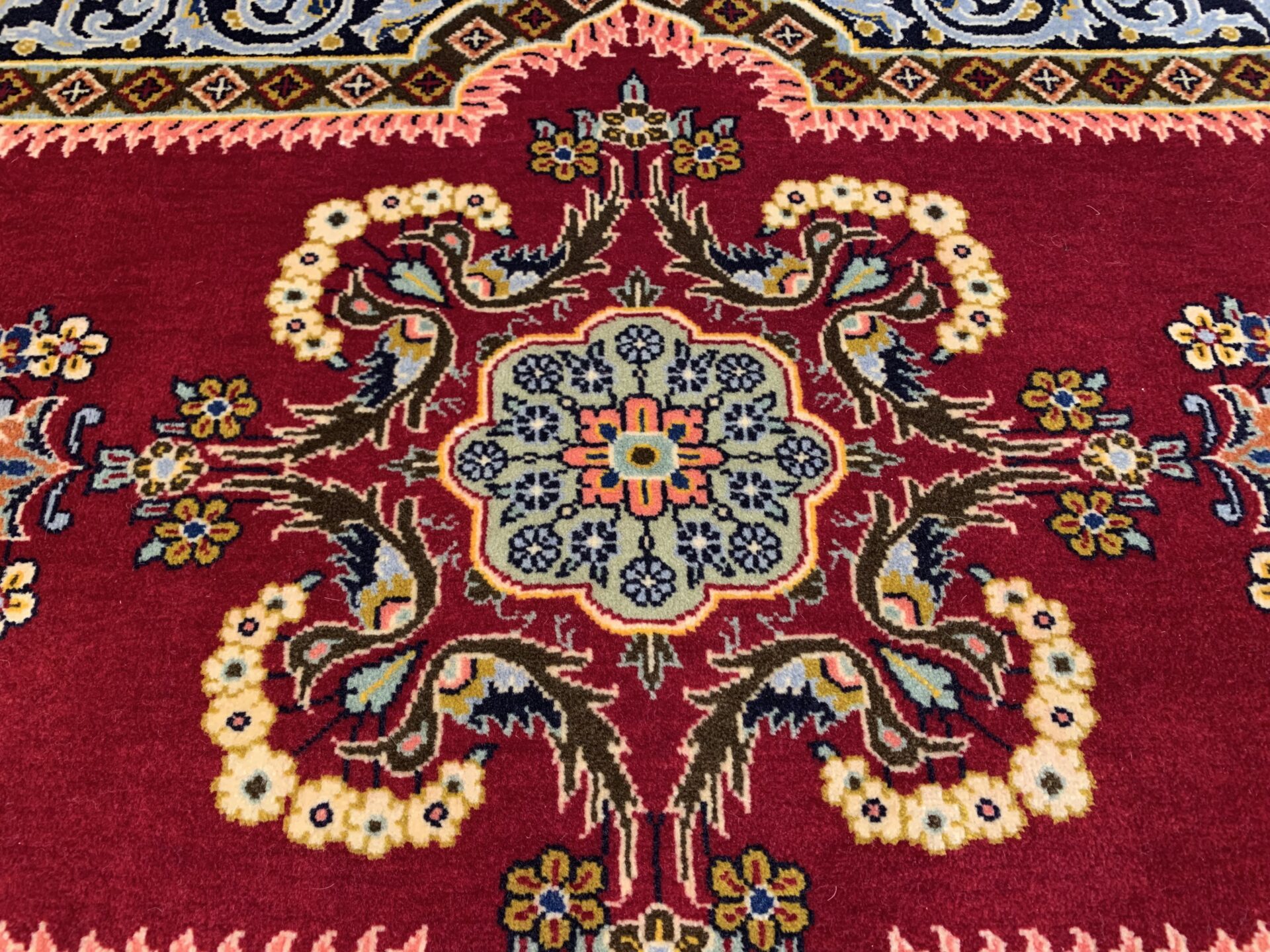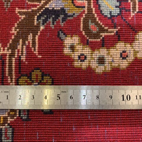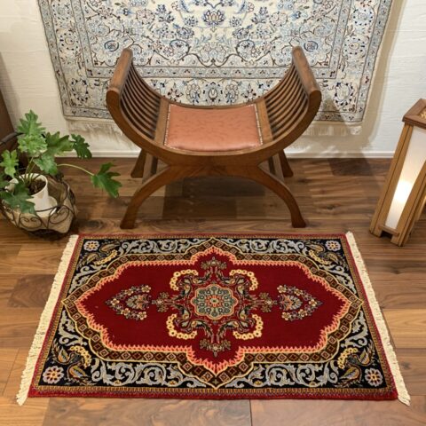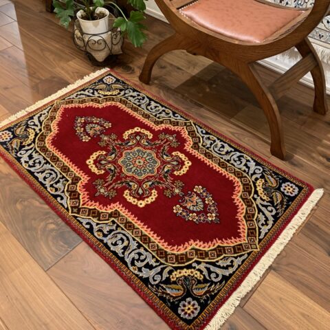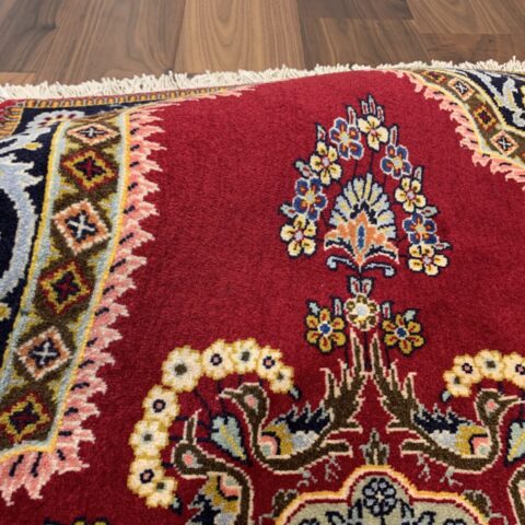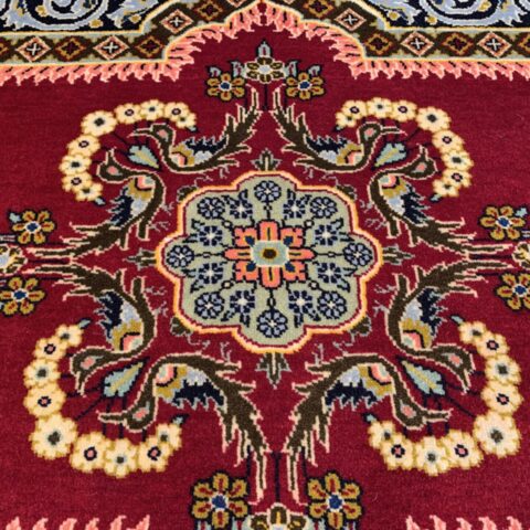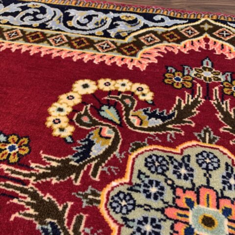 絨毯全体の中心には、複雑かつ華やかなメダリオン(中央装飾)が堂々と配置され、その周囲を囲むように、花々や蔓草の意匠がリズミカルに織り込まれています。その深みのある赤のフィールドの間に設けられたしなやかな余白が調和し、全体に柔らかさと落ち着きをもたらしています。高い密度の中に生まれる余白の美しさが、このラグの魅力をより一層引き立てています。
