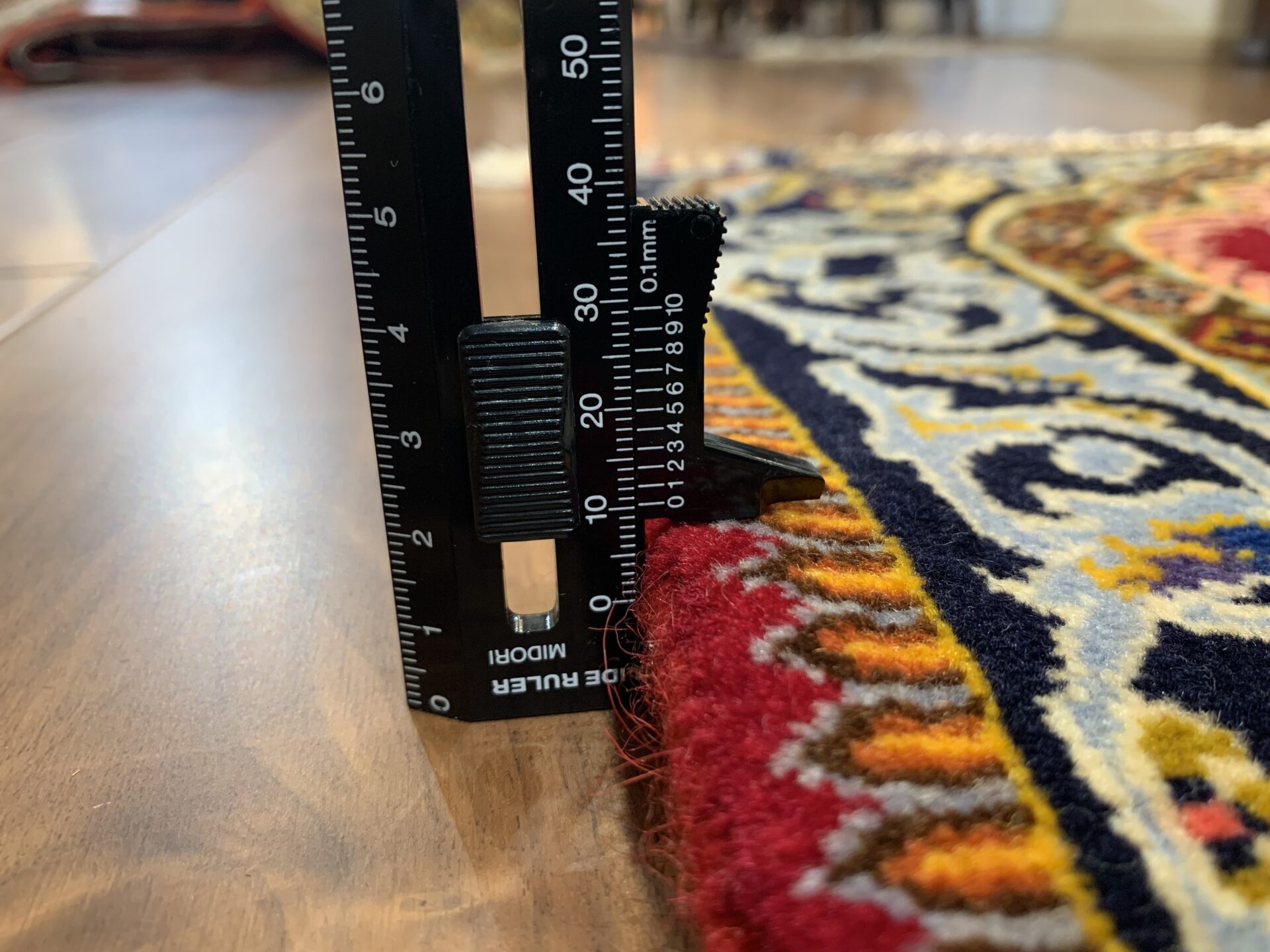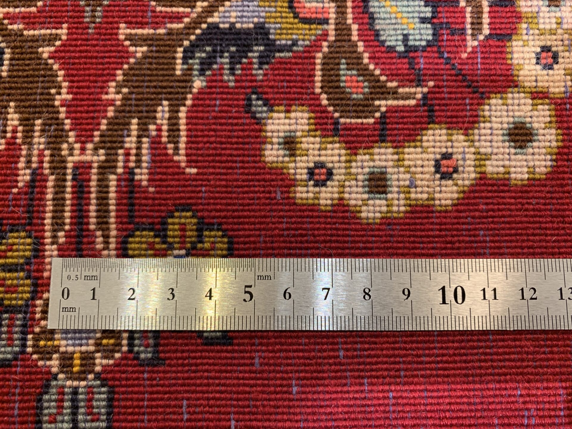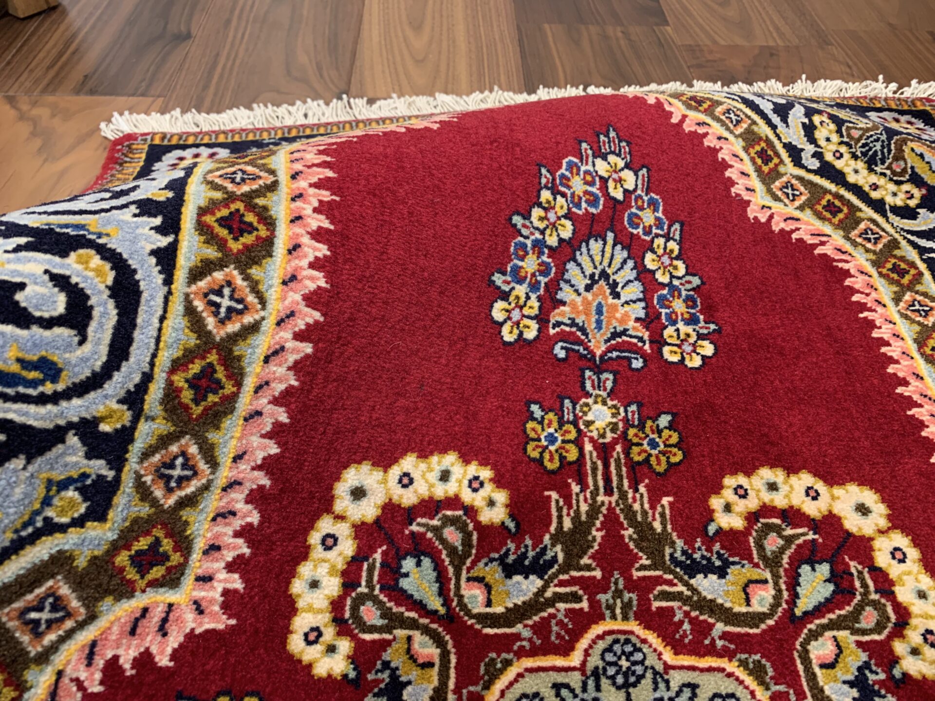 絨毯全体の中心には、複雑かつ華やかなメダリオン(中央装飾)が堂々と配置され、その周囲を囲むように、花々や蔓草の意匠がリズミカルに織り込まれています。その深みのある赤のフィールドの間に設けられたしなやかな余白が調和し、全体に柔らかさと落ち着きをもたらしています。高い密度の中に生まれる余白の美しさが、このラグの魅力をより一層引き立てています。