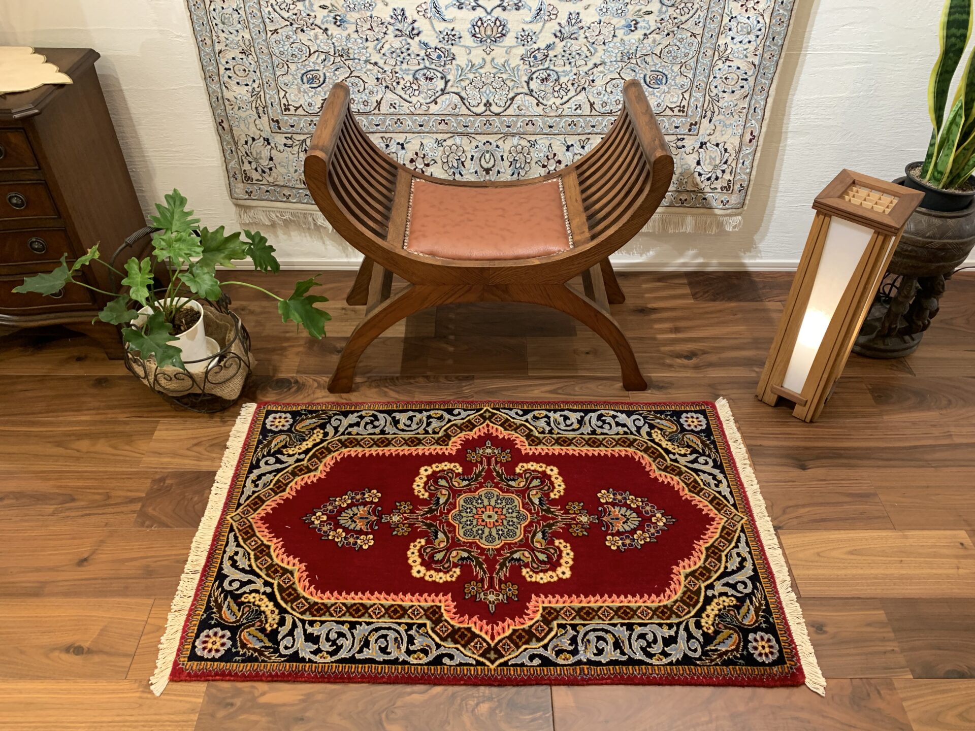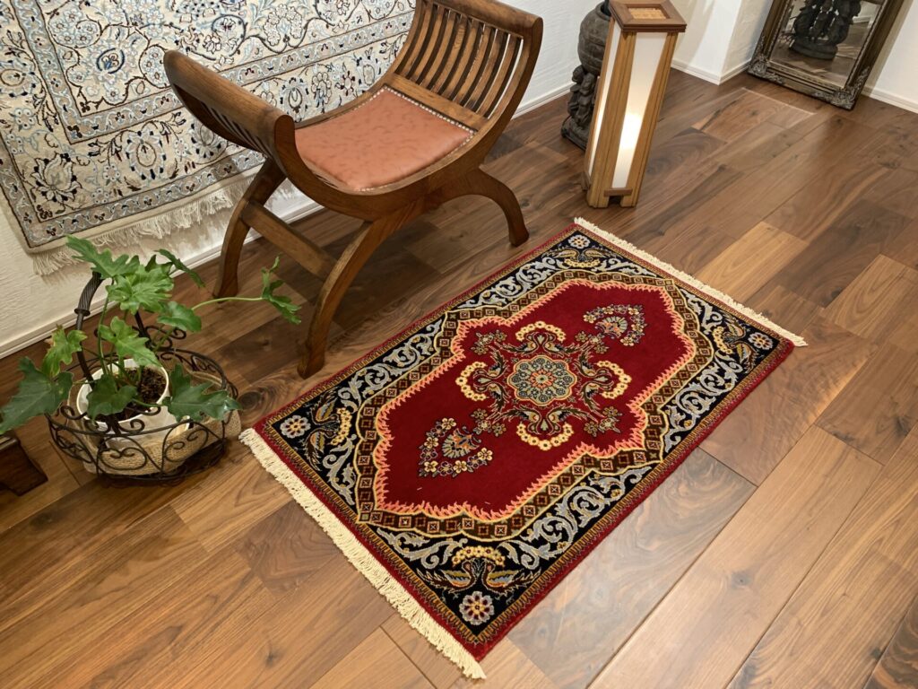 また、深みのある赤のフィールドと、濃紺・アイボリー・金色系の縁取りのコントラストが非常に印象的です。この配色が、空間に格調高いアクセントを与え、視線を自然に中央へと誘います。