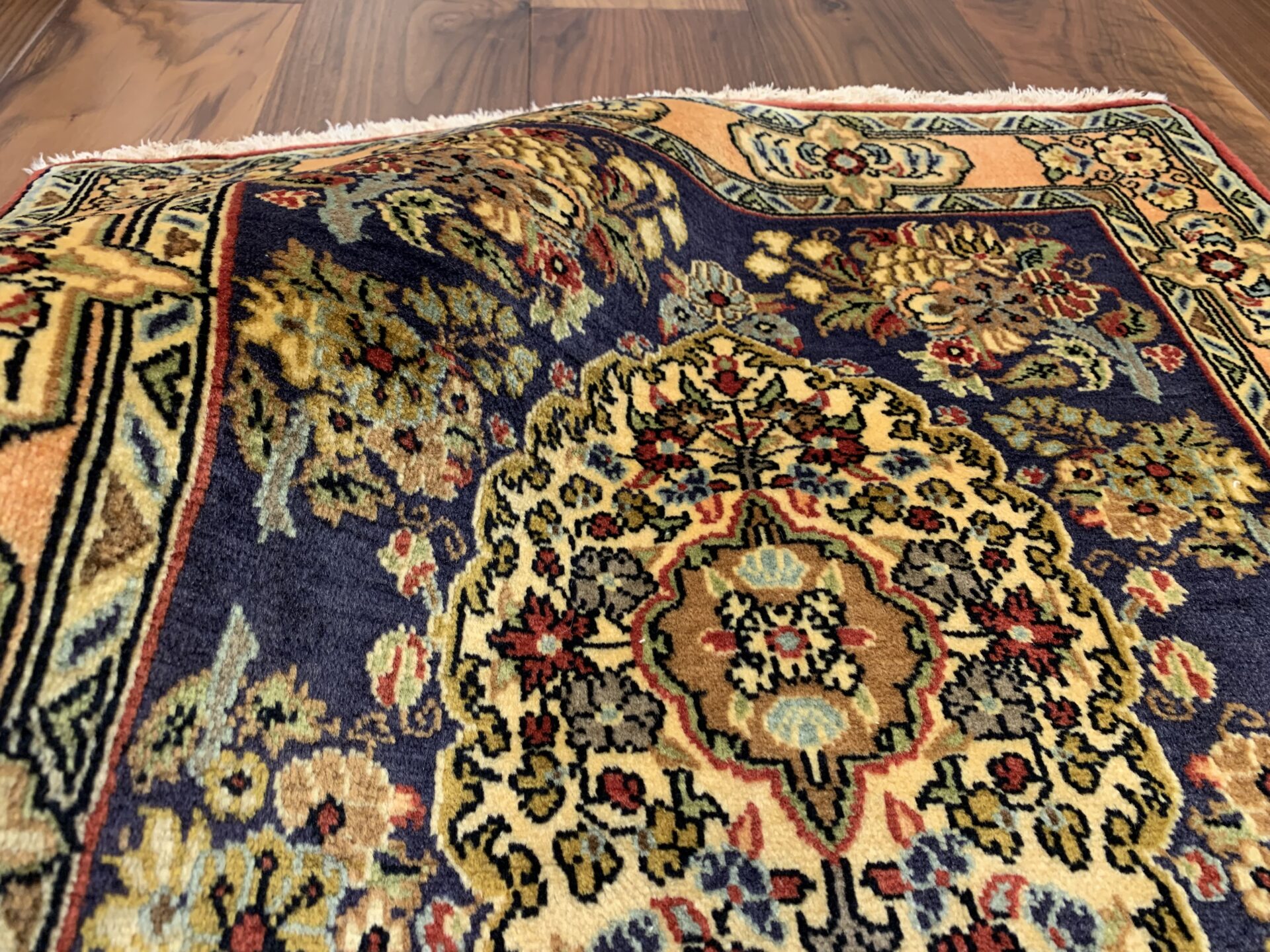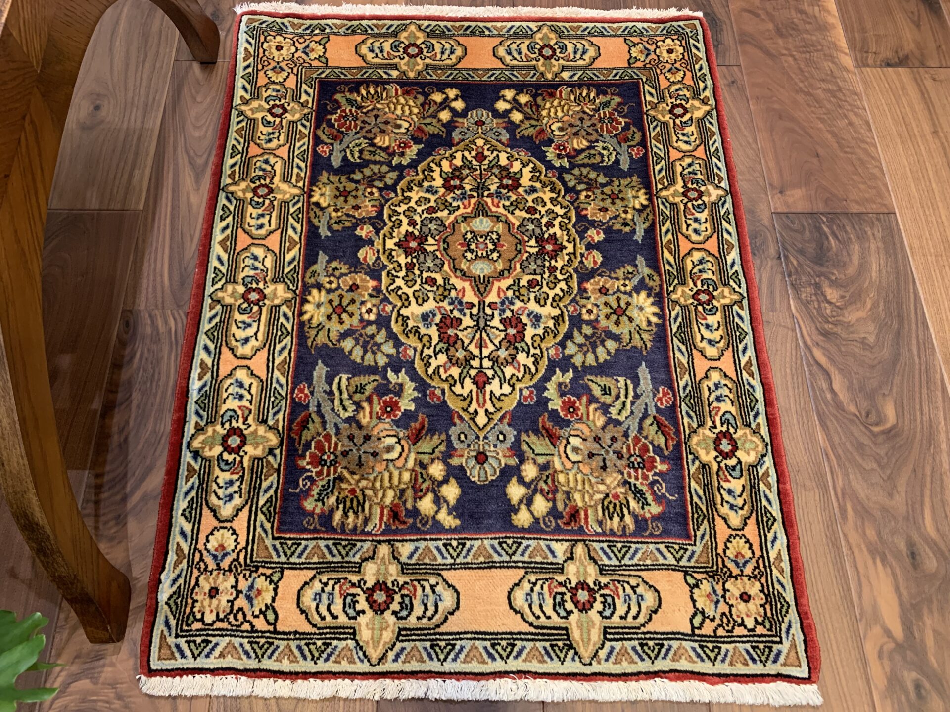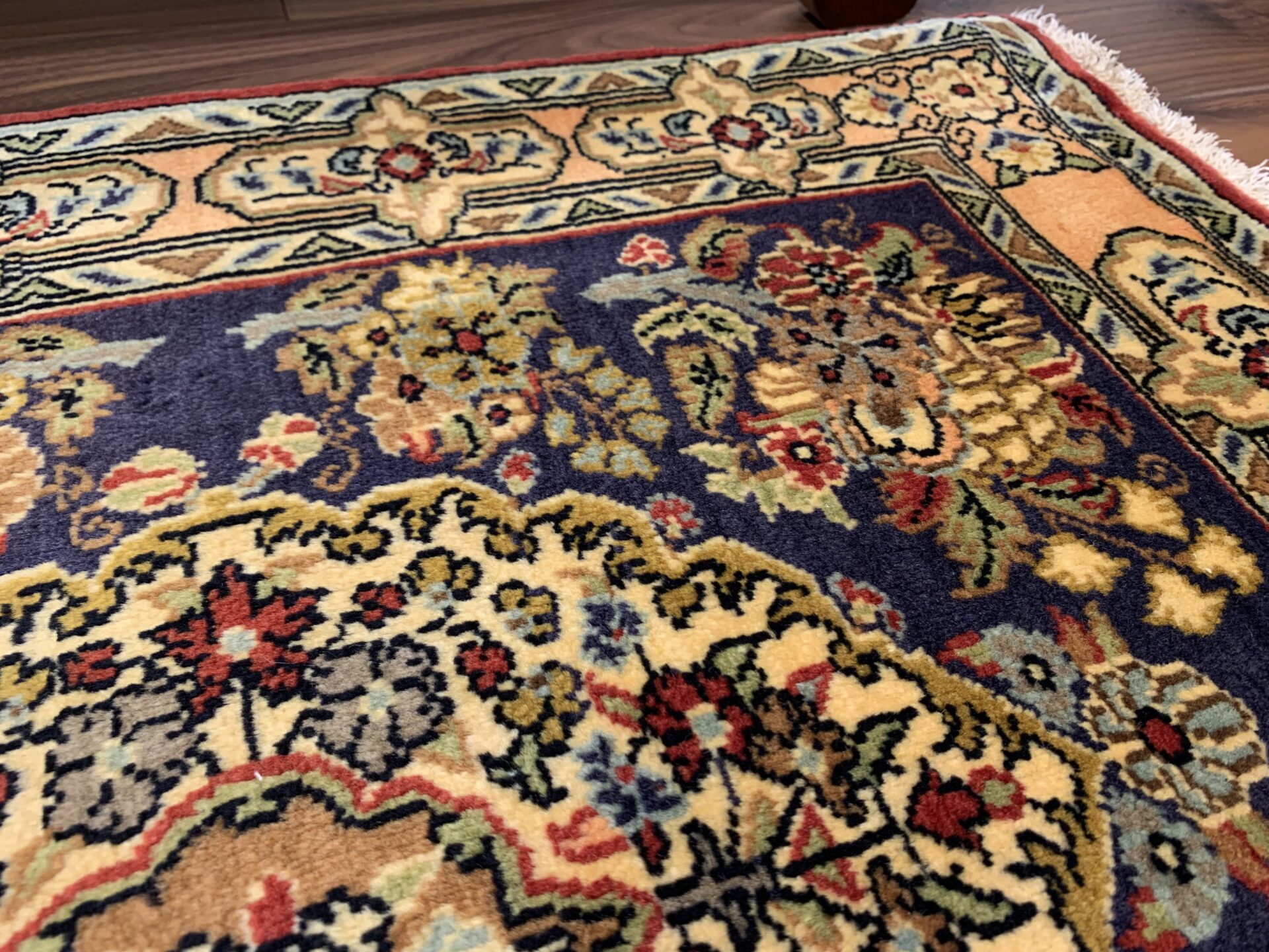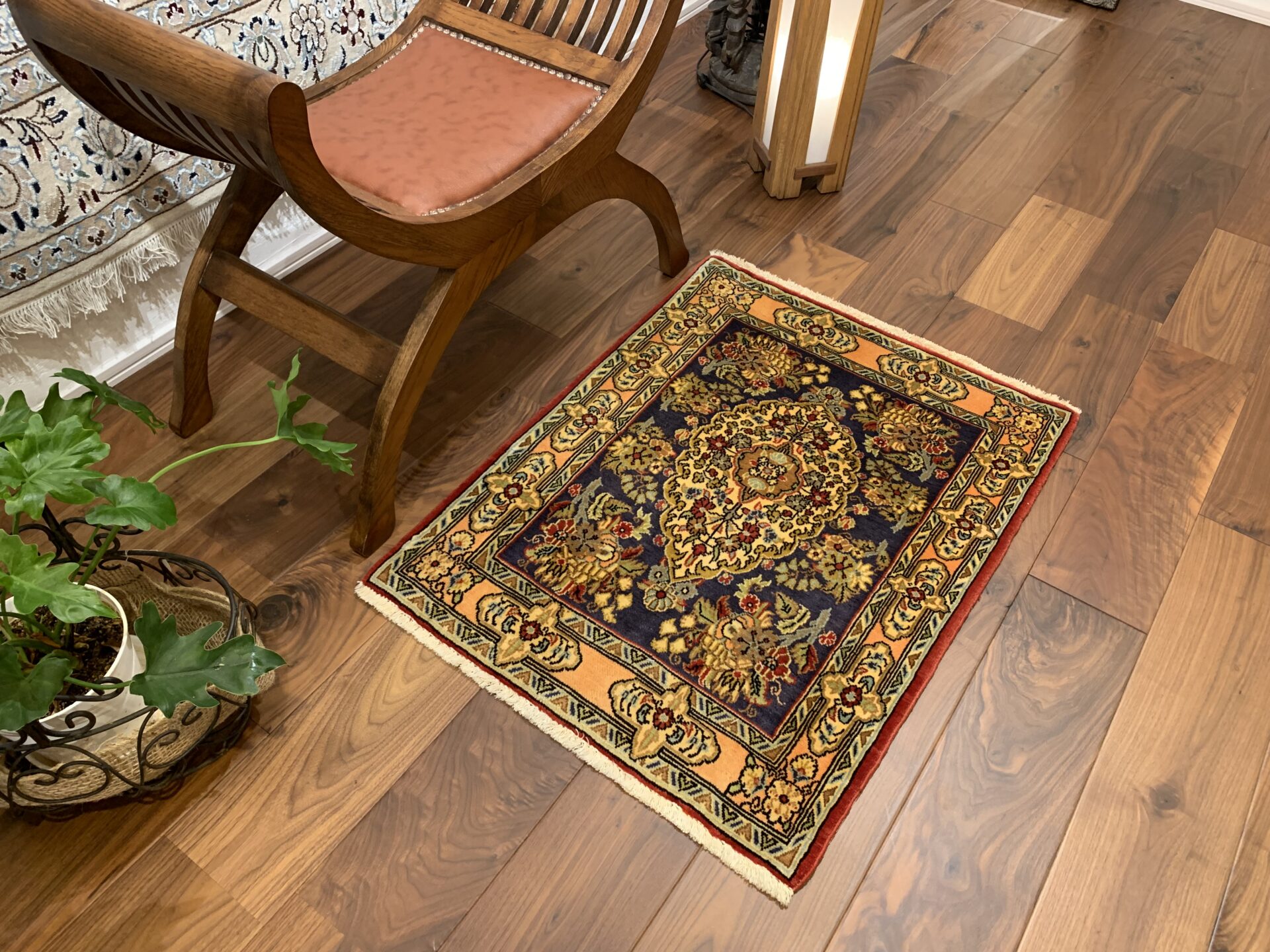四隅にあしらわれた植物文様とリズミカルな配色が、クラシックでありながら新鮮な印象を与え、空間に「格式」と「華やぎ」をもたらしてくれる一枚です。