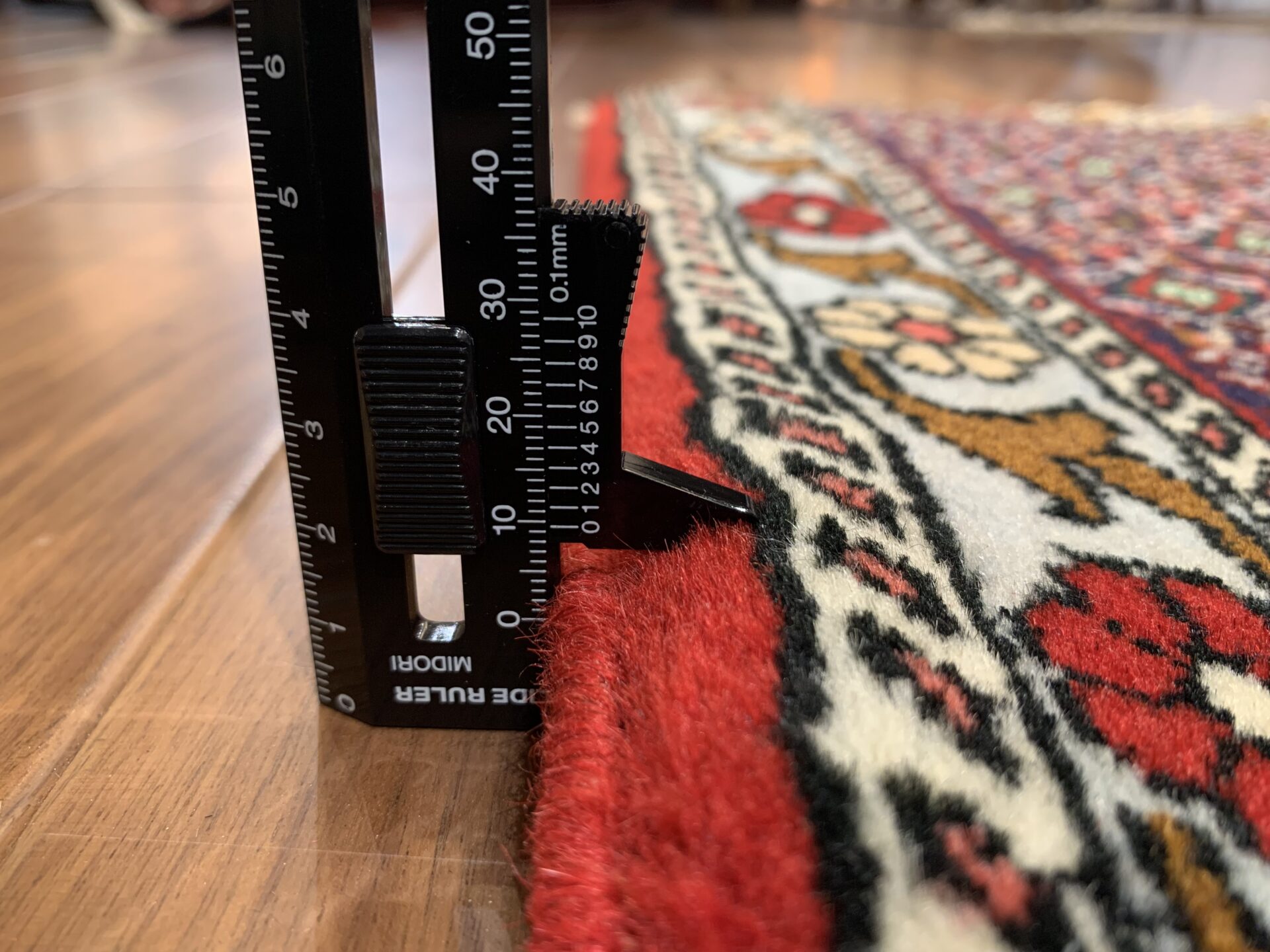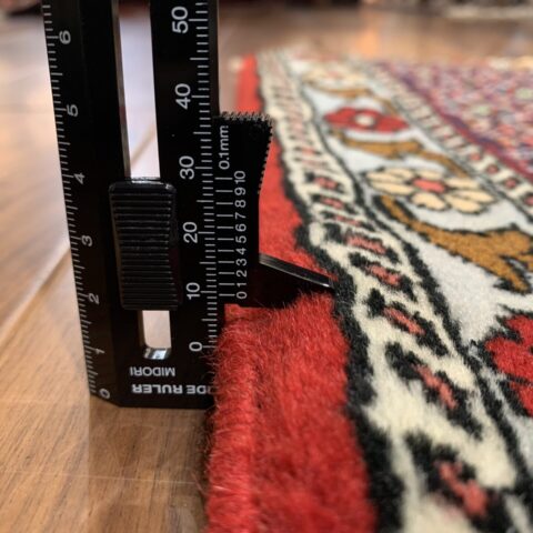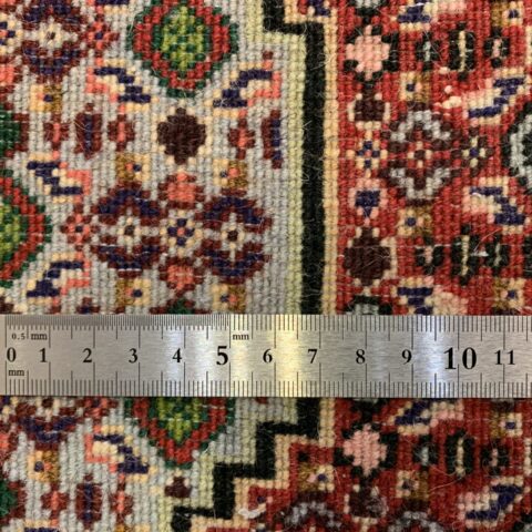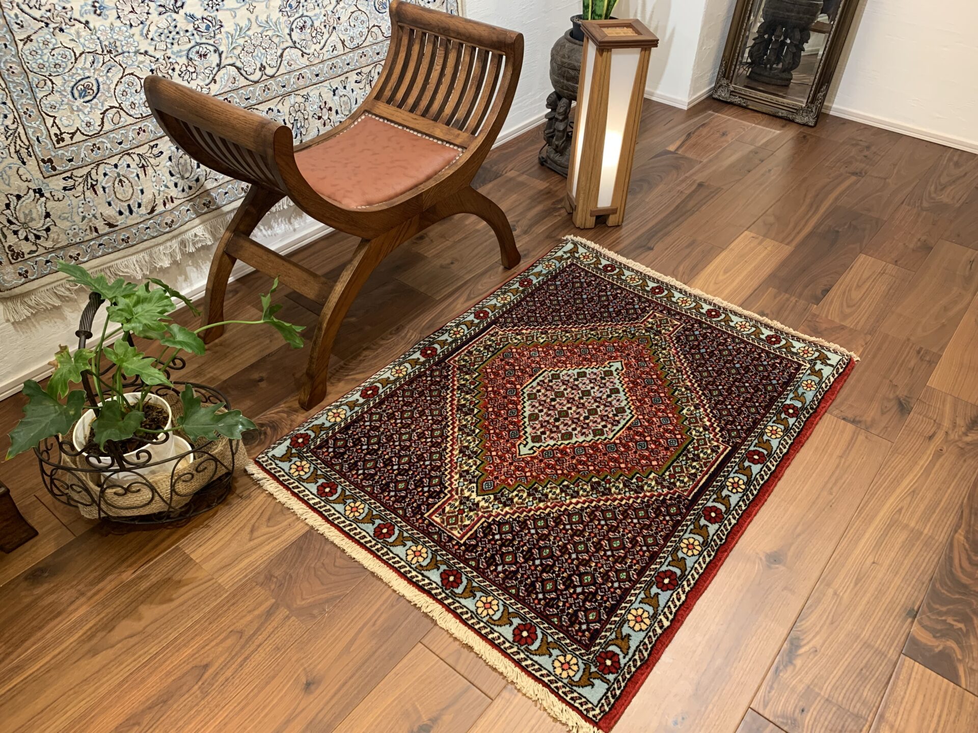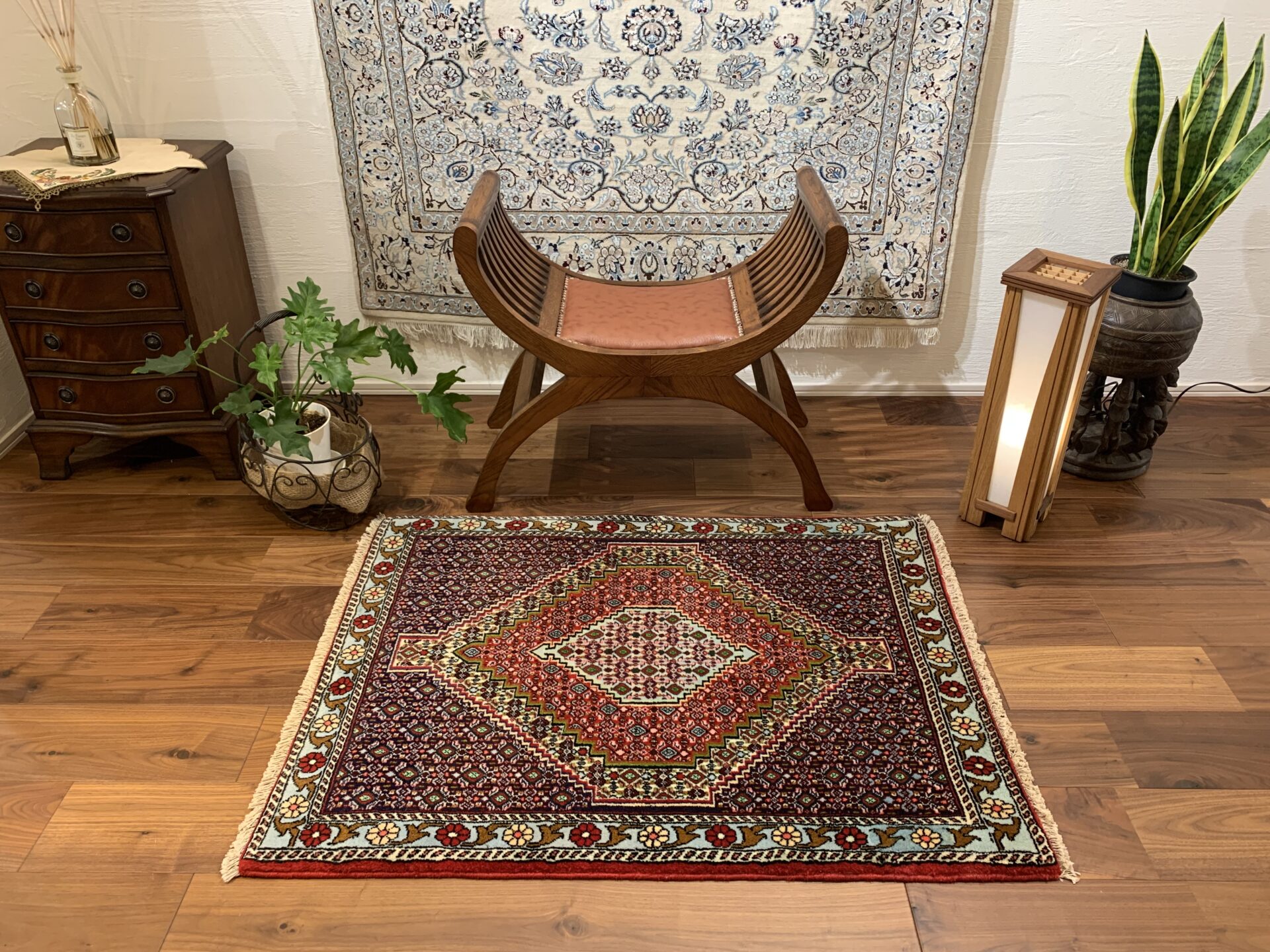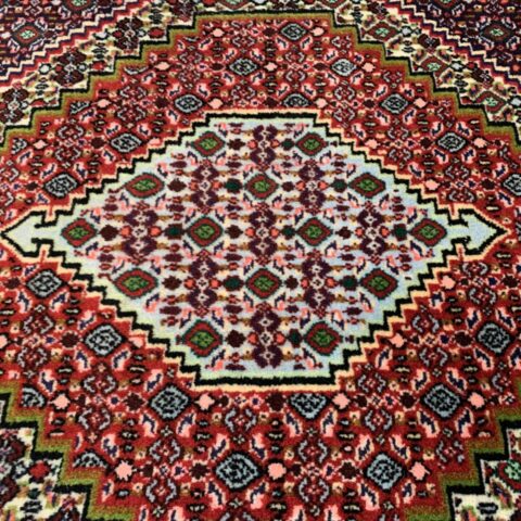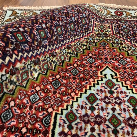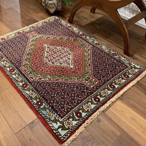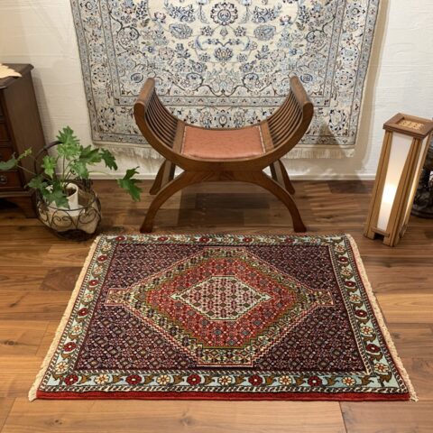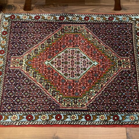 イラン西部・サナンダジ(Sanandaj)産のペルシャ絨毯で、上品な幾何学構成と緻密な紋様、透明感のある色使いが魅力の一枚です。サナンダジは旧称「セネ(Senneh)」とも呼ばれ、極めて細やかな織りとシャープな意匠で高く評価されています。