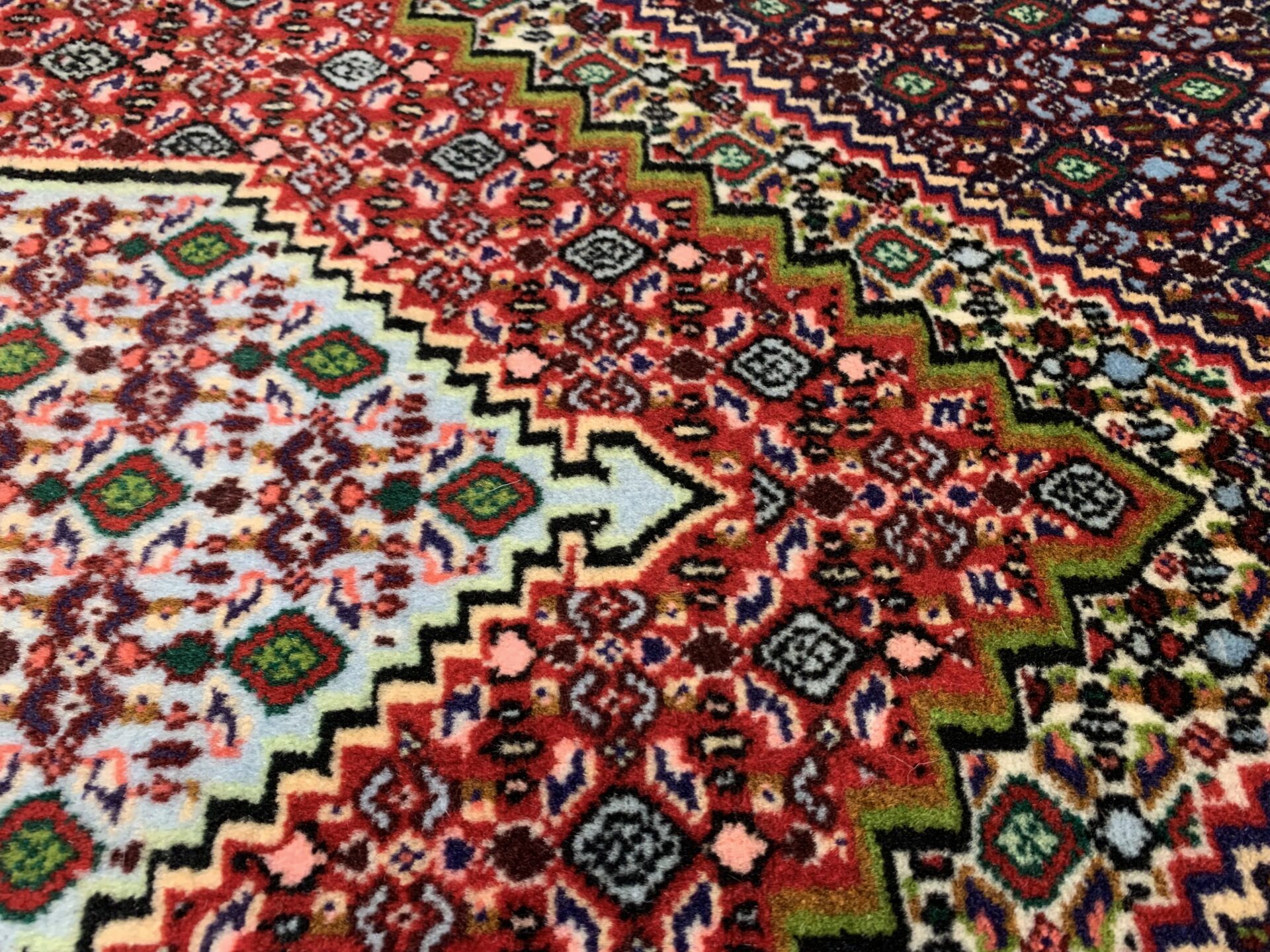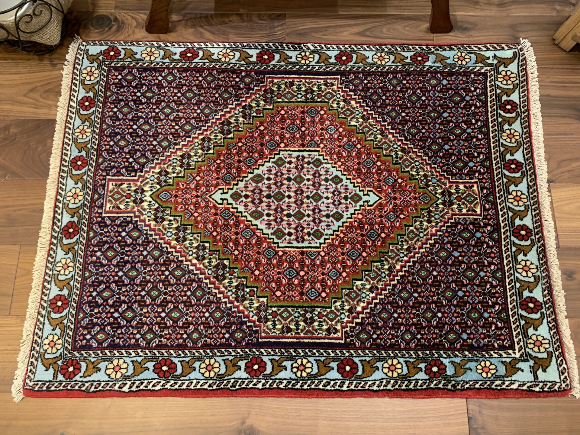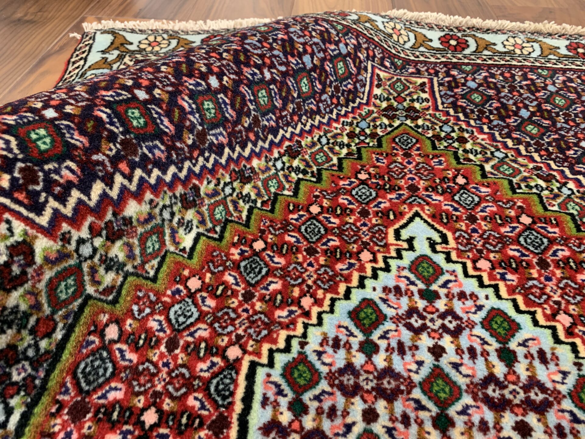 縁取り(ボーダー)にやわらかな水色が使用されており、全体の色調に明るさと洗練された抜け感を与えています。このような色づかいは、重厚な幾何学構成に軽やかさを加える効果があり、サナンダジ絨毯における配色の妙を感じさせる美しいディテールです。