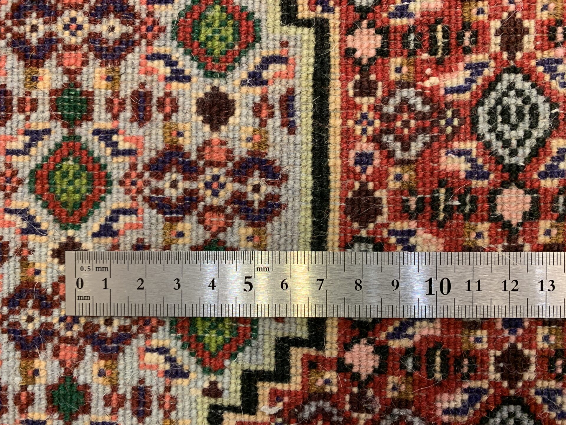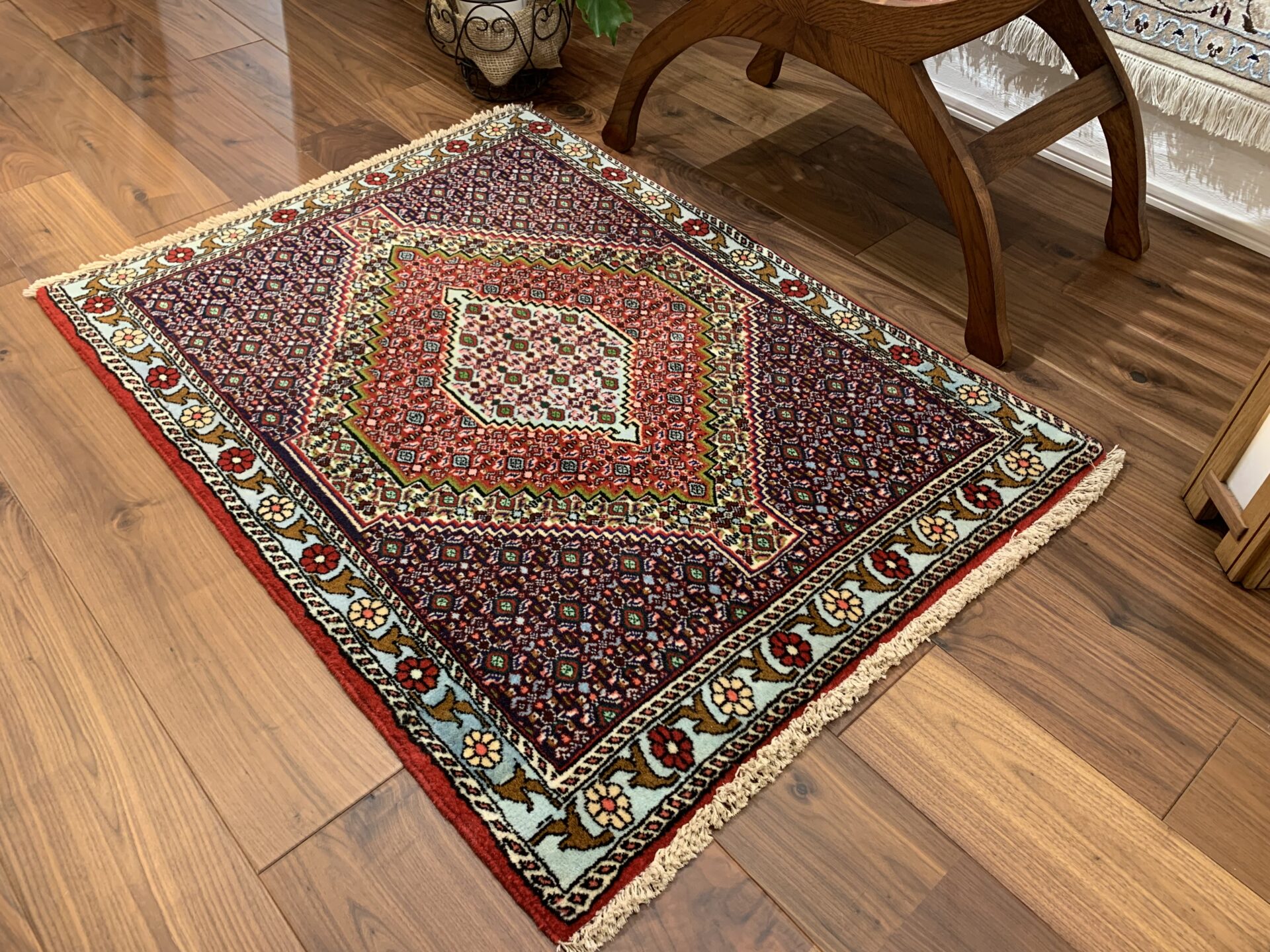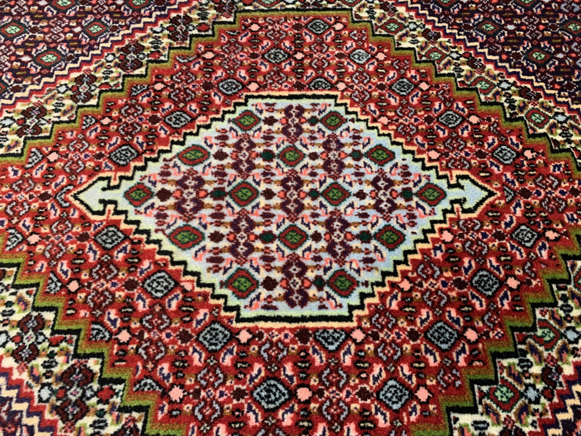 縁取り(ボーダー)にやわらかな水色が使用されており、全体の色調に明るさと洗練された抜け感を与えています。このような色づかいは、重厚な幾何学構成に軽やかさを加える効果があり、サナンダジ絨毯における配色の妙を感じさせる美しいディテールです。