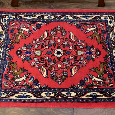 華やかな赤をベースに、中央には八角形のメダリオン、まわりには唐草や草花文様が生き生きと織り込まれた一枚。藍と生成りの対比が効いた縁取りが、構図を引き締めつつ、全体にリズムを与えています。