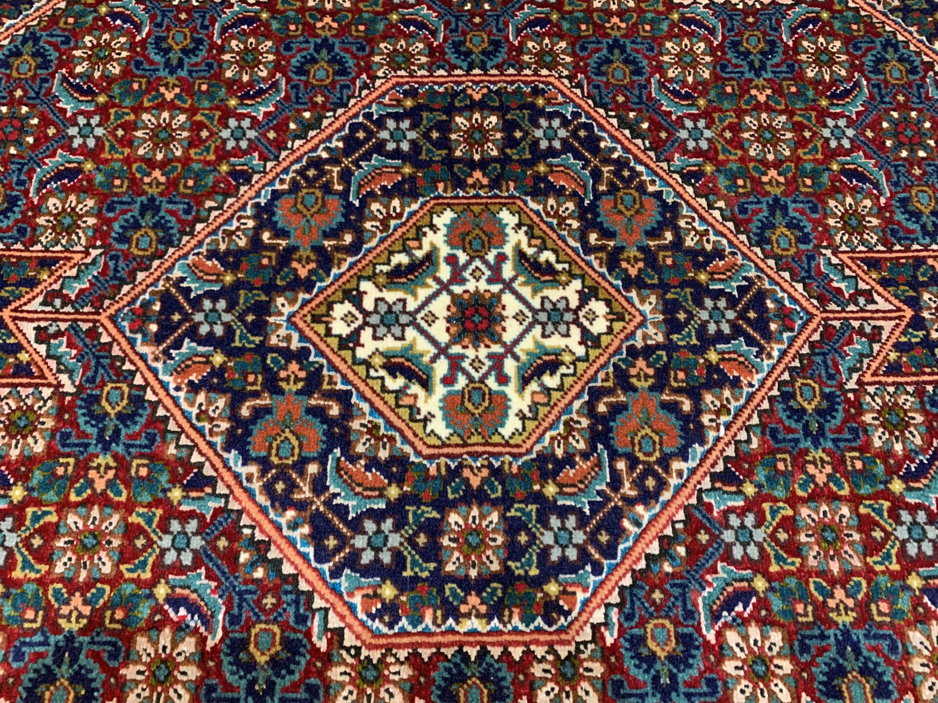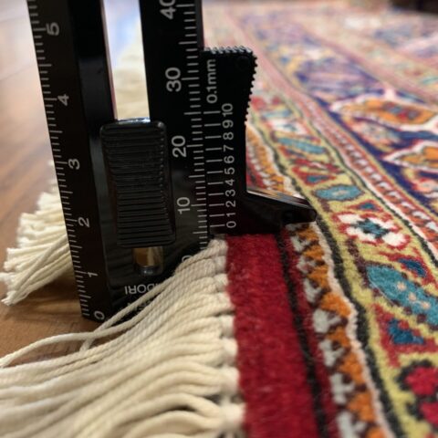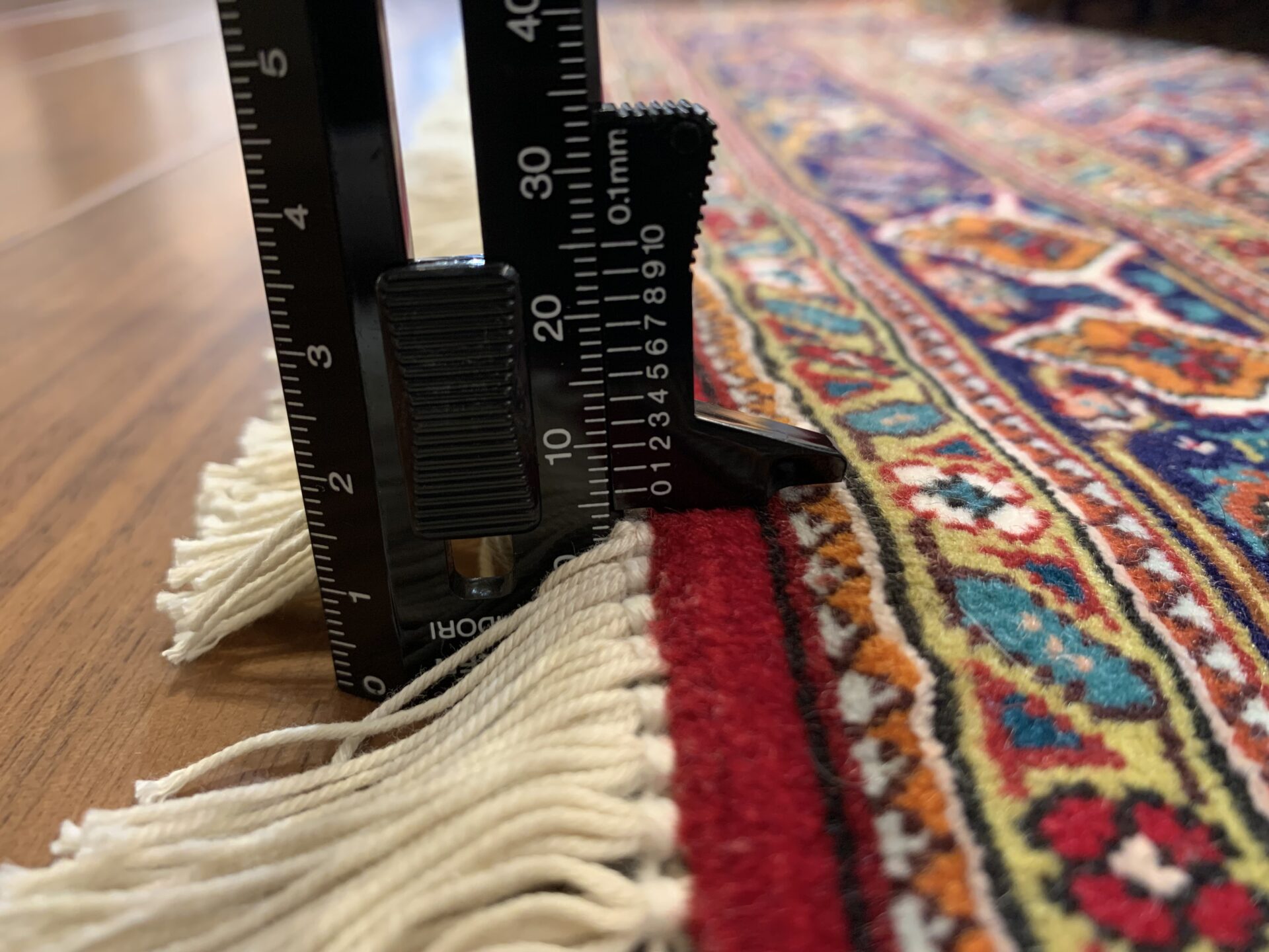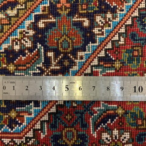 中心にクラシカルなメダリオンが配され、全体を囲むように繊細な花唐草紋様やロゼット(中心から放射状に広がる花弁を持ち、丸く広がる花の姿を表現したもの)などの植物モチーフがびっしりと配置されています。タブリーズ絨毯ならではの線の細さ・色使いの品格・構図の完成度が際立つ逸品です。
