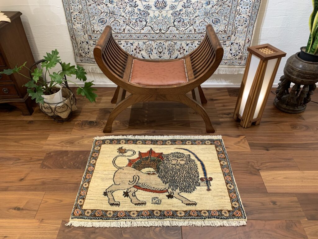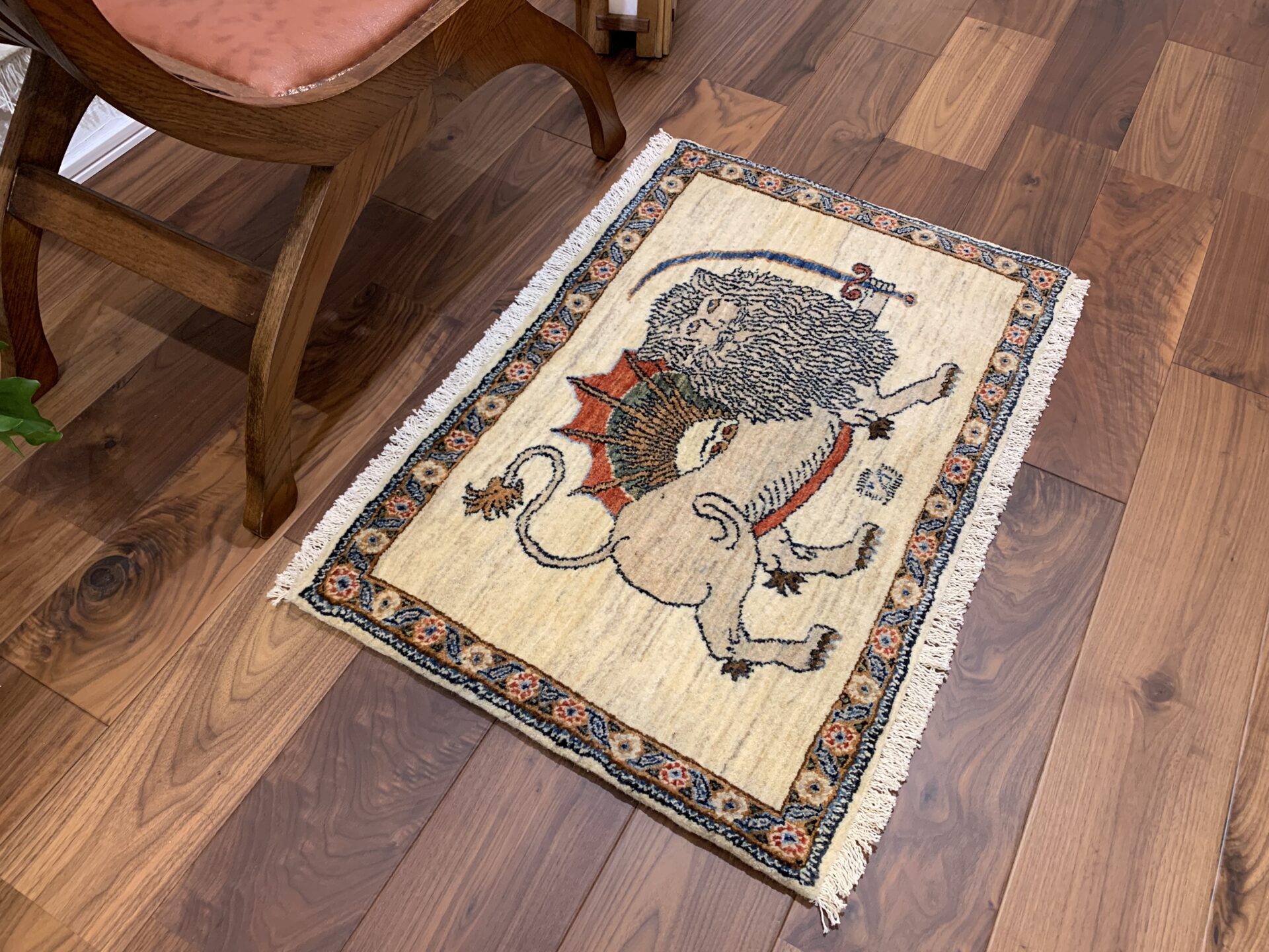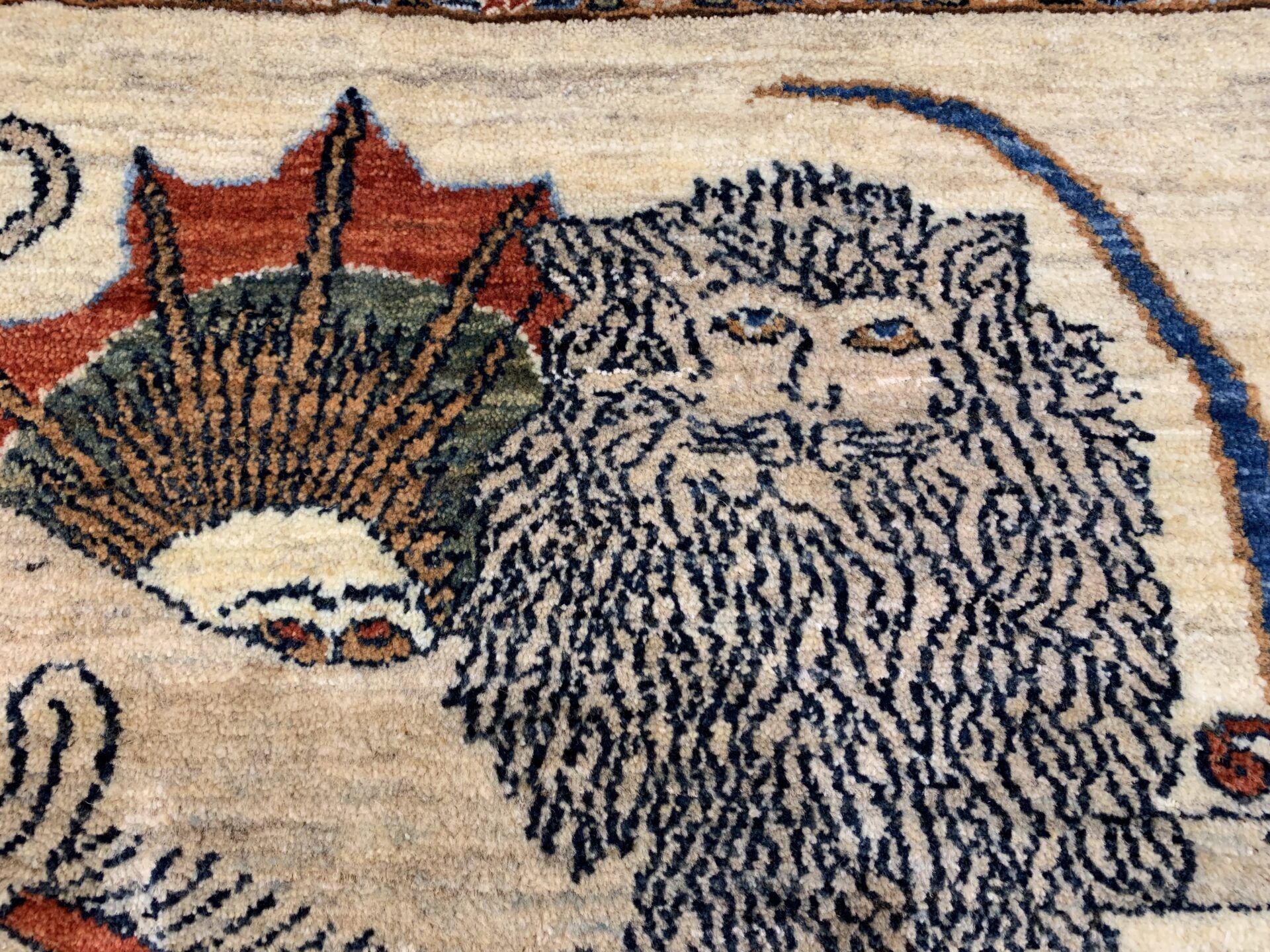 遊牧民の暮らすザグロス山脈の麓で織られた、存在感ある一枚。原毛の白を背景に、中央には青い目をもつサーベルライオン、その背後には赤い目を輝かせる太陽神が力強く描かれています。