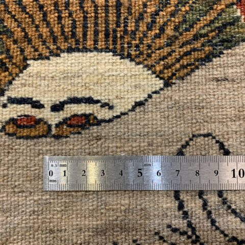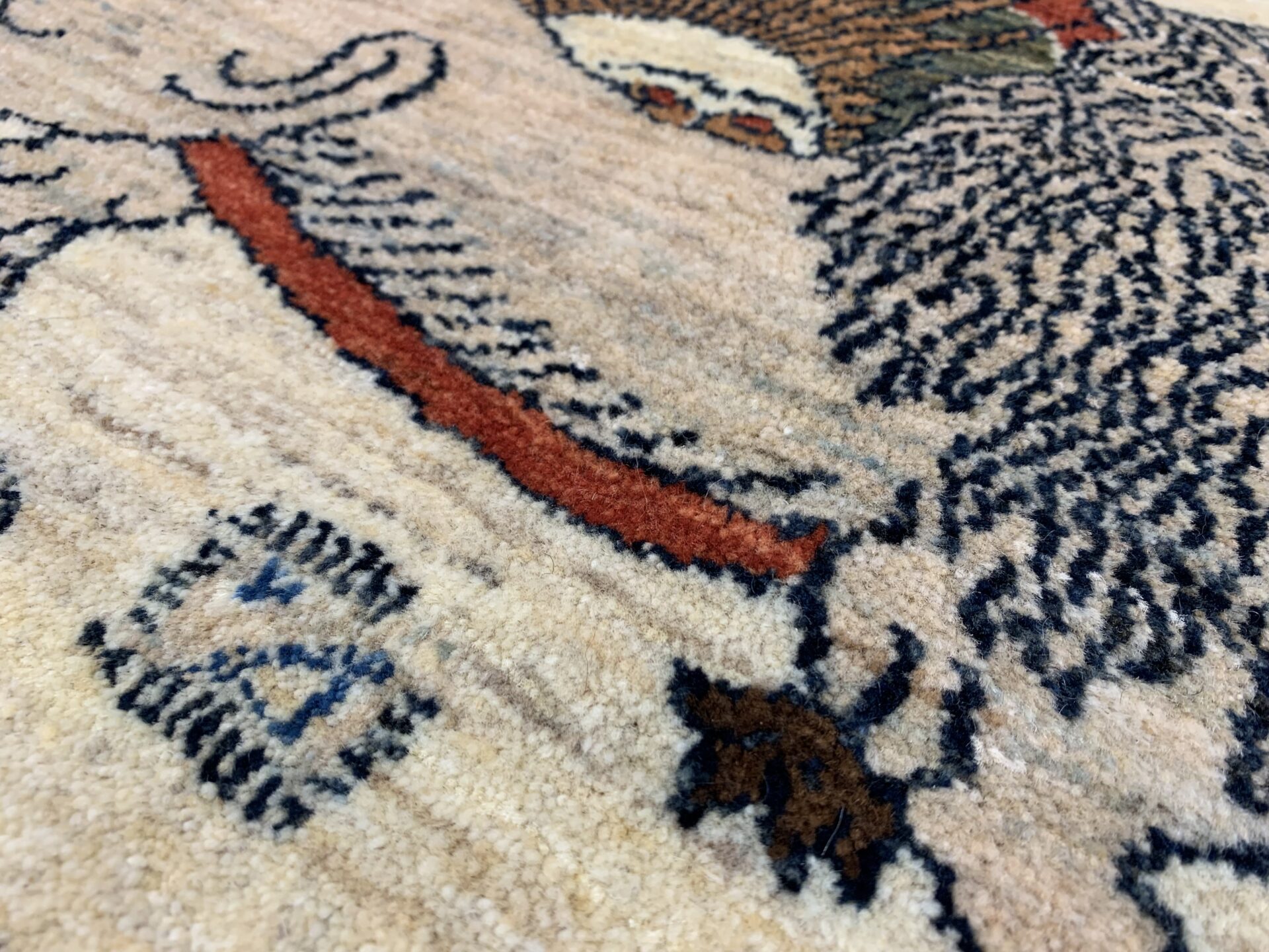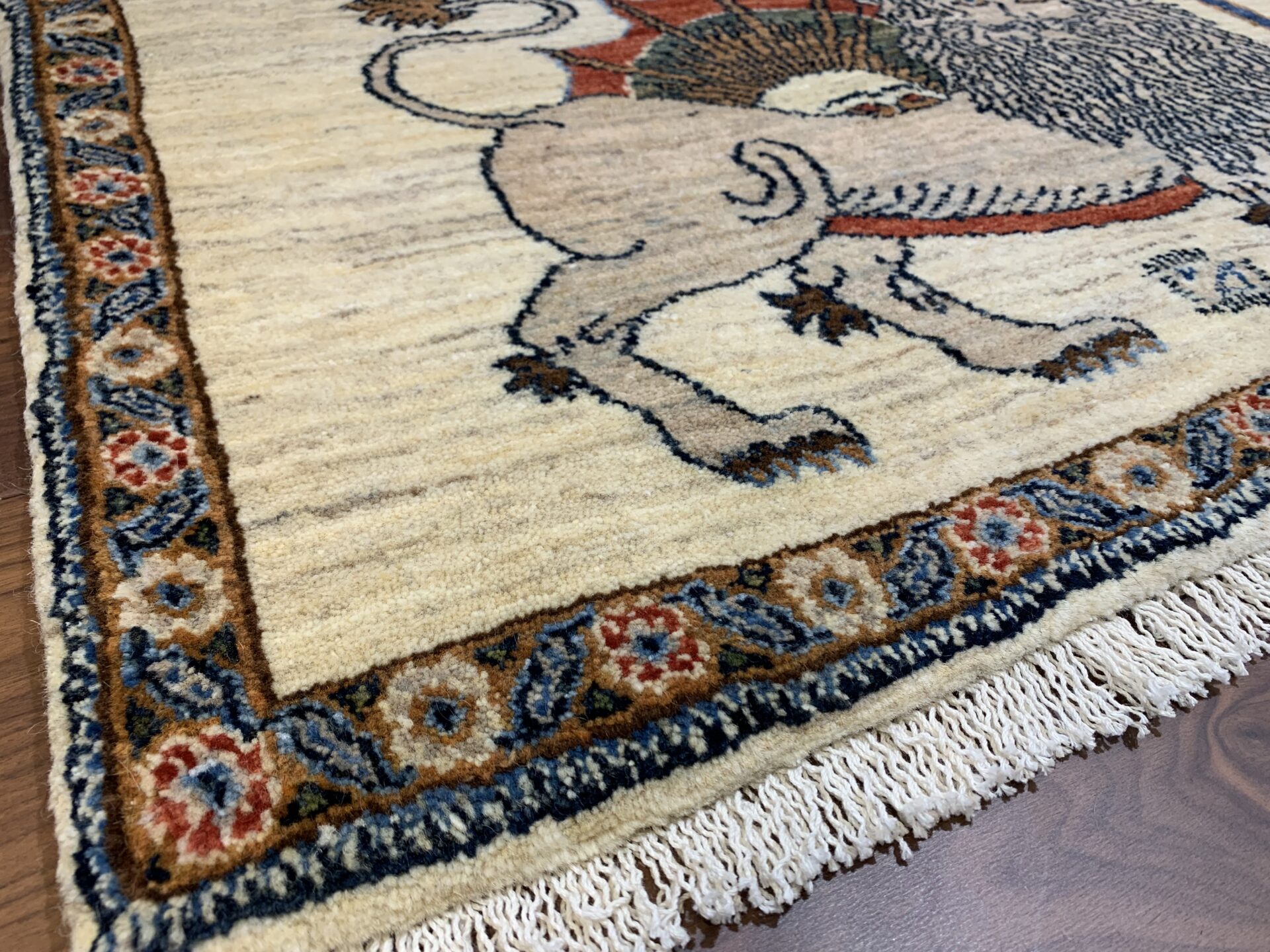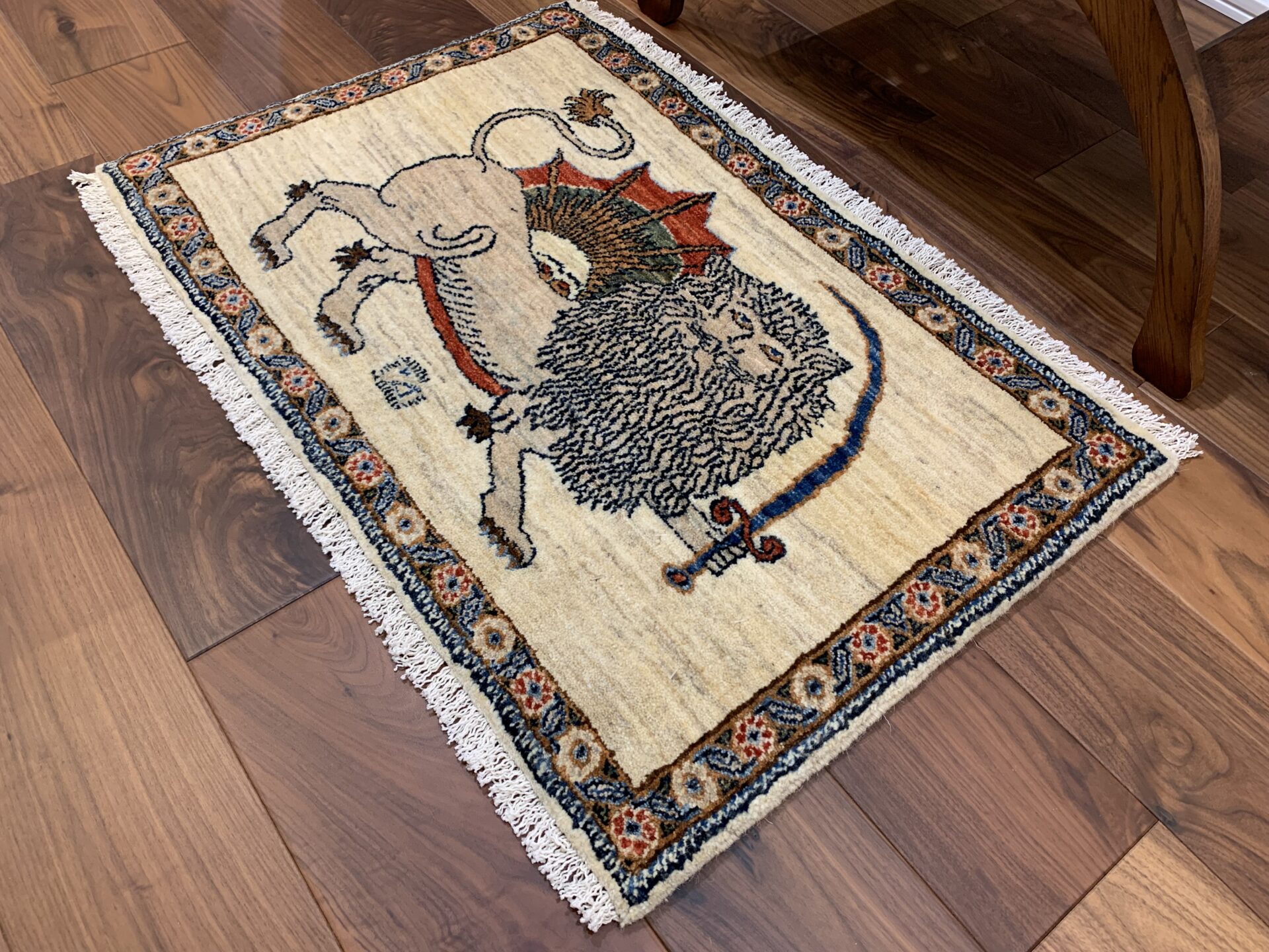 遊牧民の暮らすザグロス山脈の麓で織られた、存在感ある一枚。原毛の白を背景に、中央には青い目をもつサーベルライオン、その背後には赤い目を輝かせる太陽神が力強く描かれています。