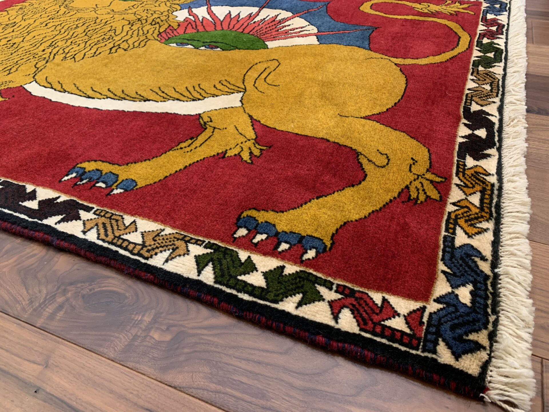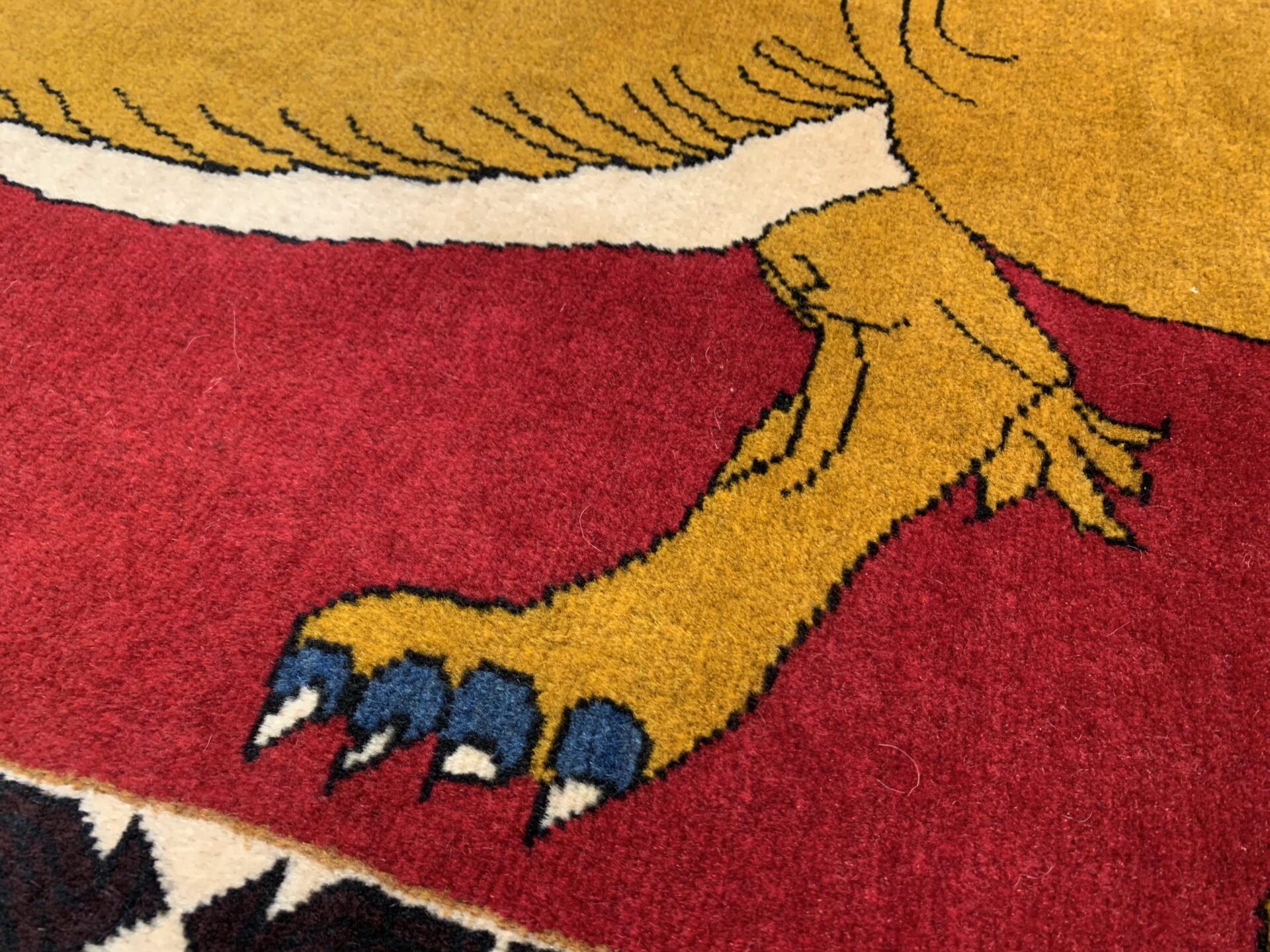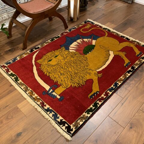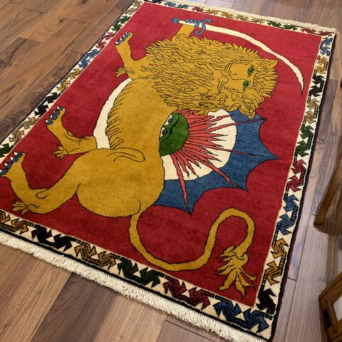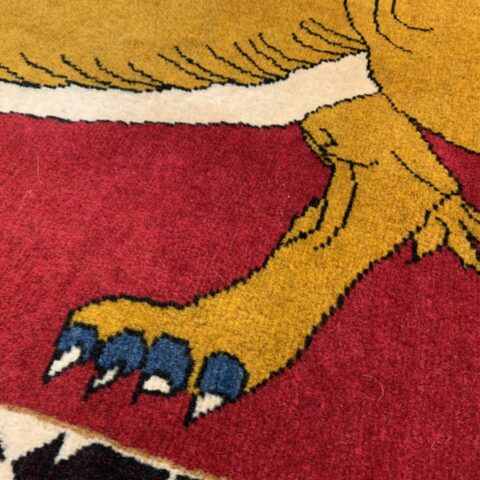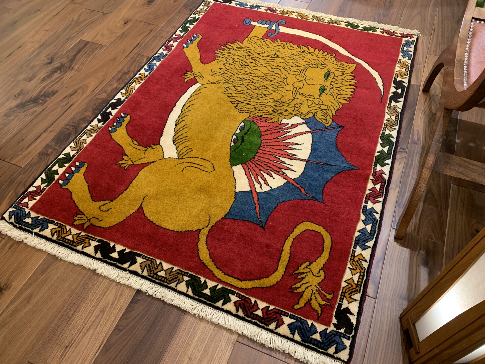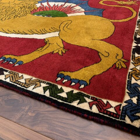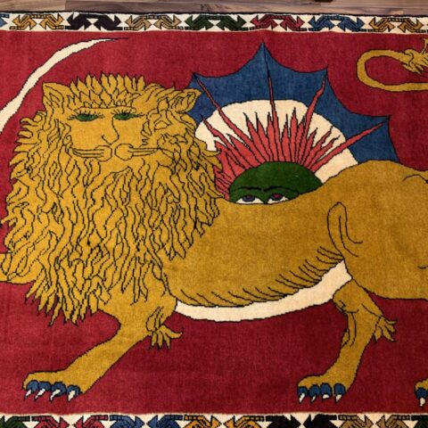 深紅のフィールドに描かれた、背後に太陽を従えたサーベルライオンが描かれた、特別なギャッベ。