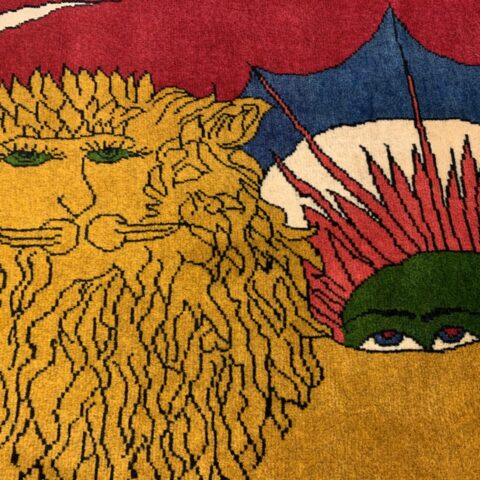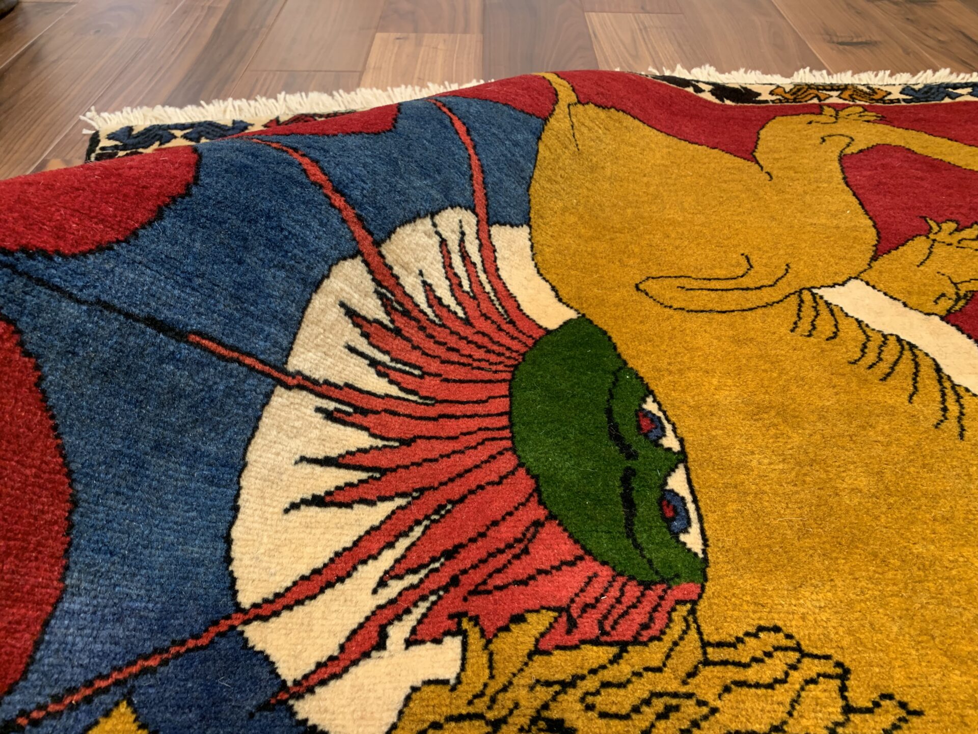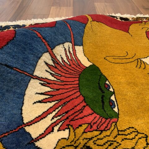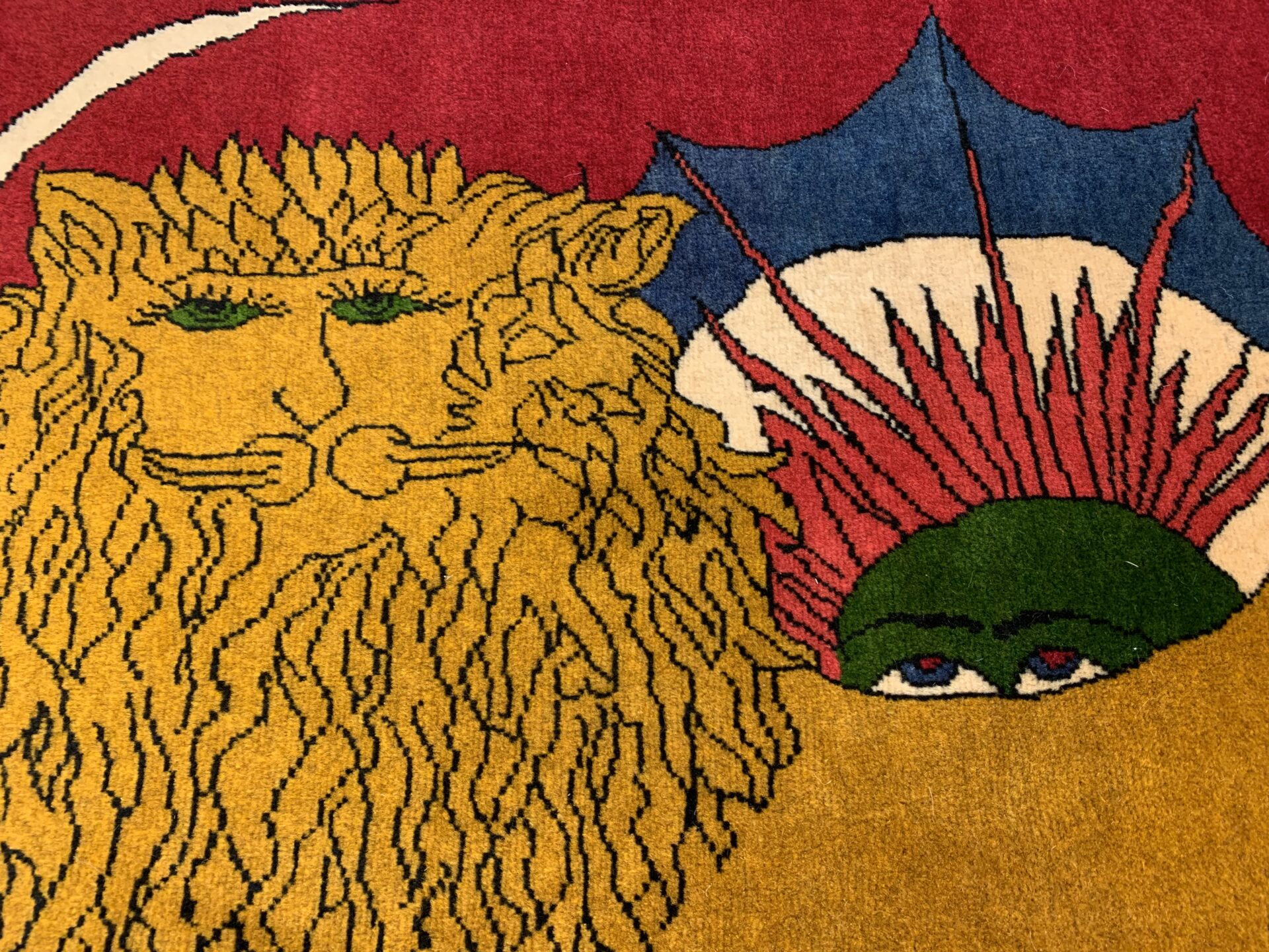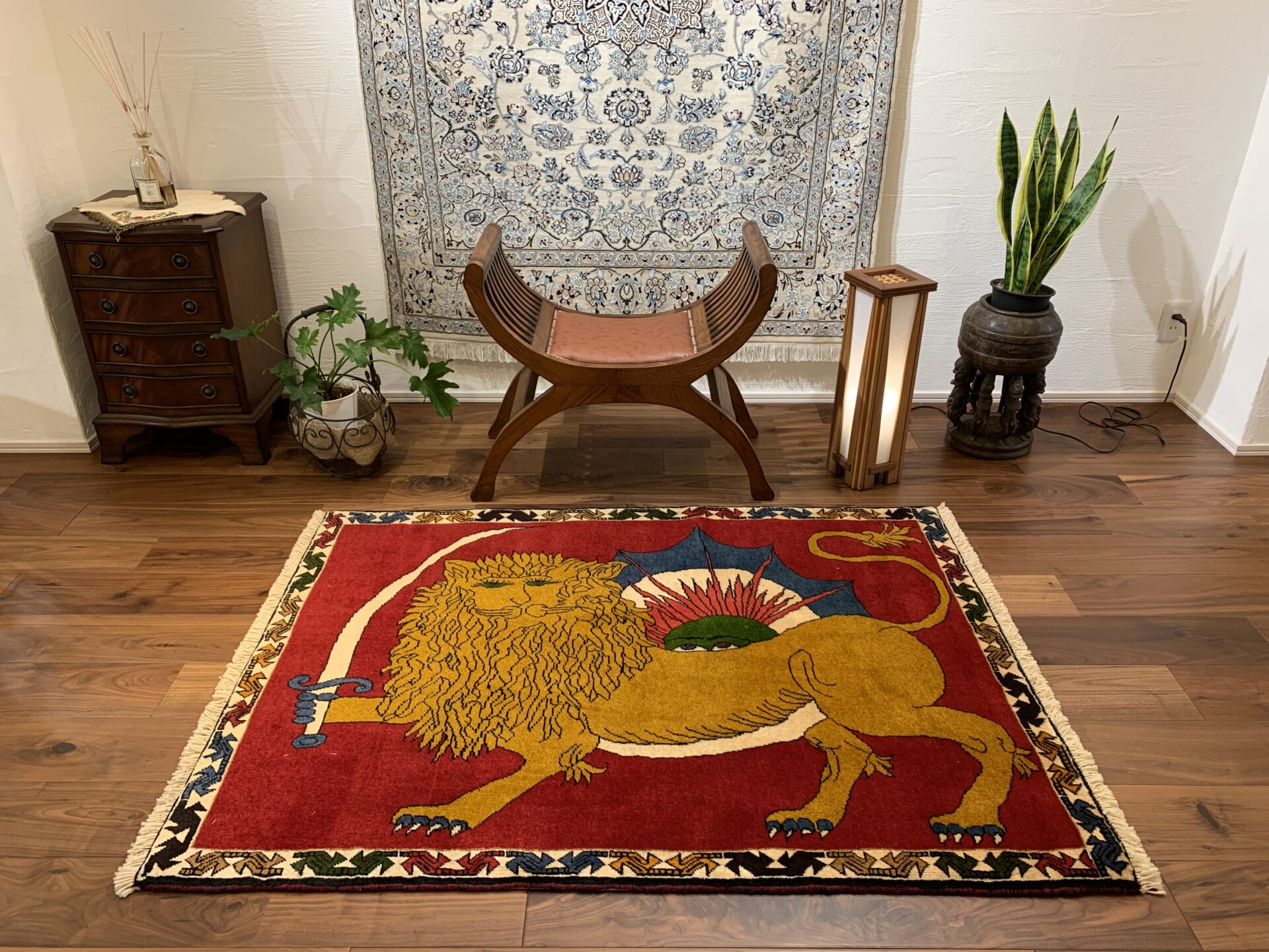 深紅のフィールドに描かれた、背後に太陽を従えたサーベルライオンが描かれた、特別なギャッベ。