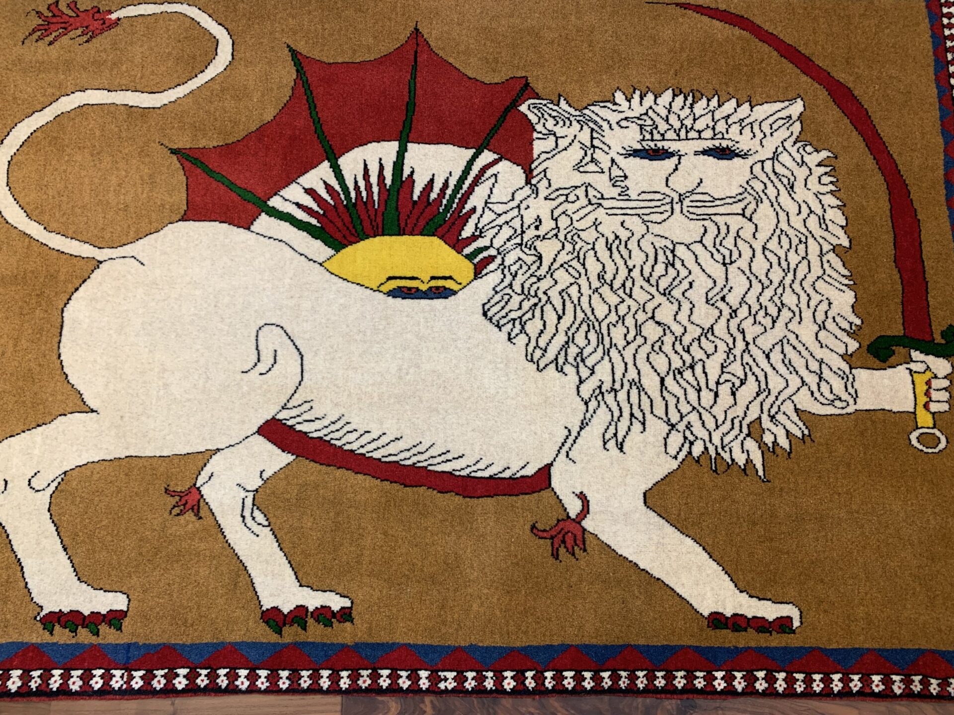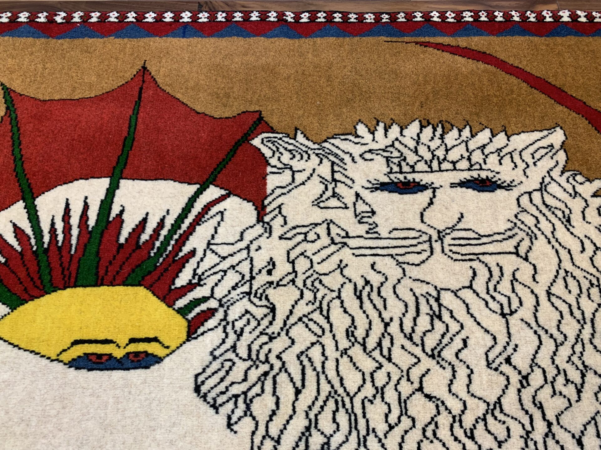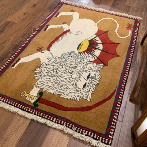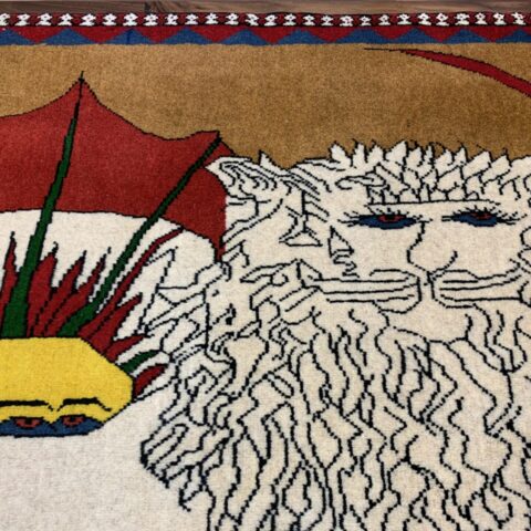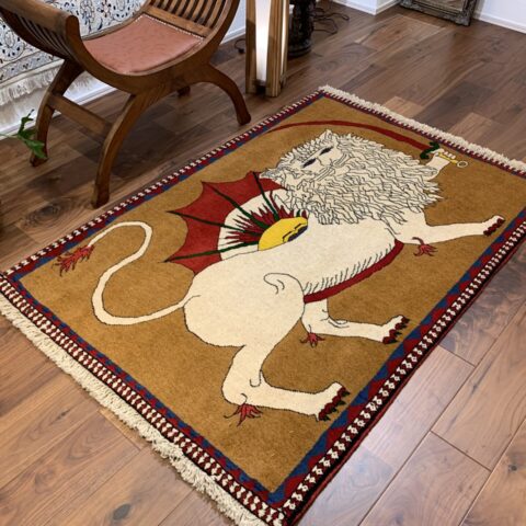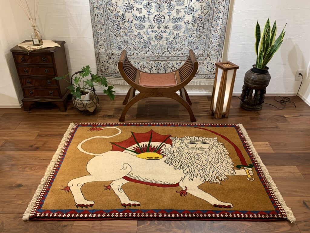 ライオンを囲むのは、織り手が祈りを込めて織り上げた魔除けの紋様。ひし形や稲妻を思わせる連続模様が、邪気を払う護符のように全体を包み込みます。まるで見えない守りの結界のように、空間に静かな安堵をもたらします。