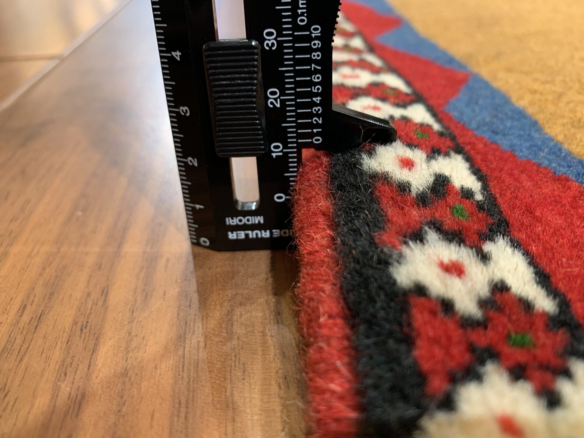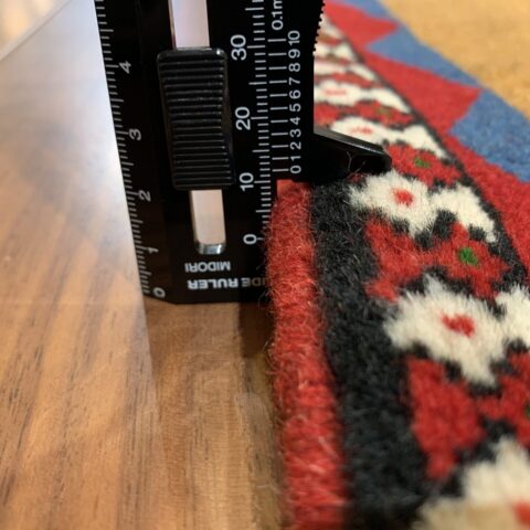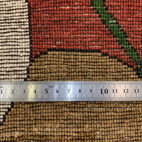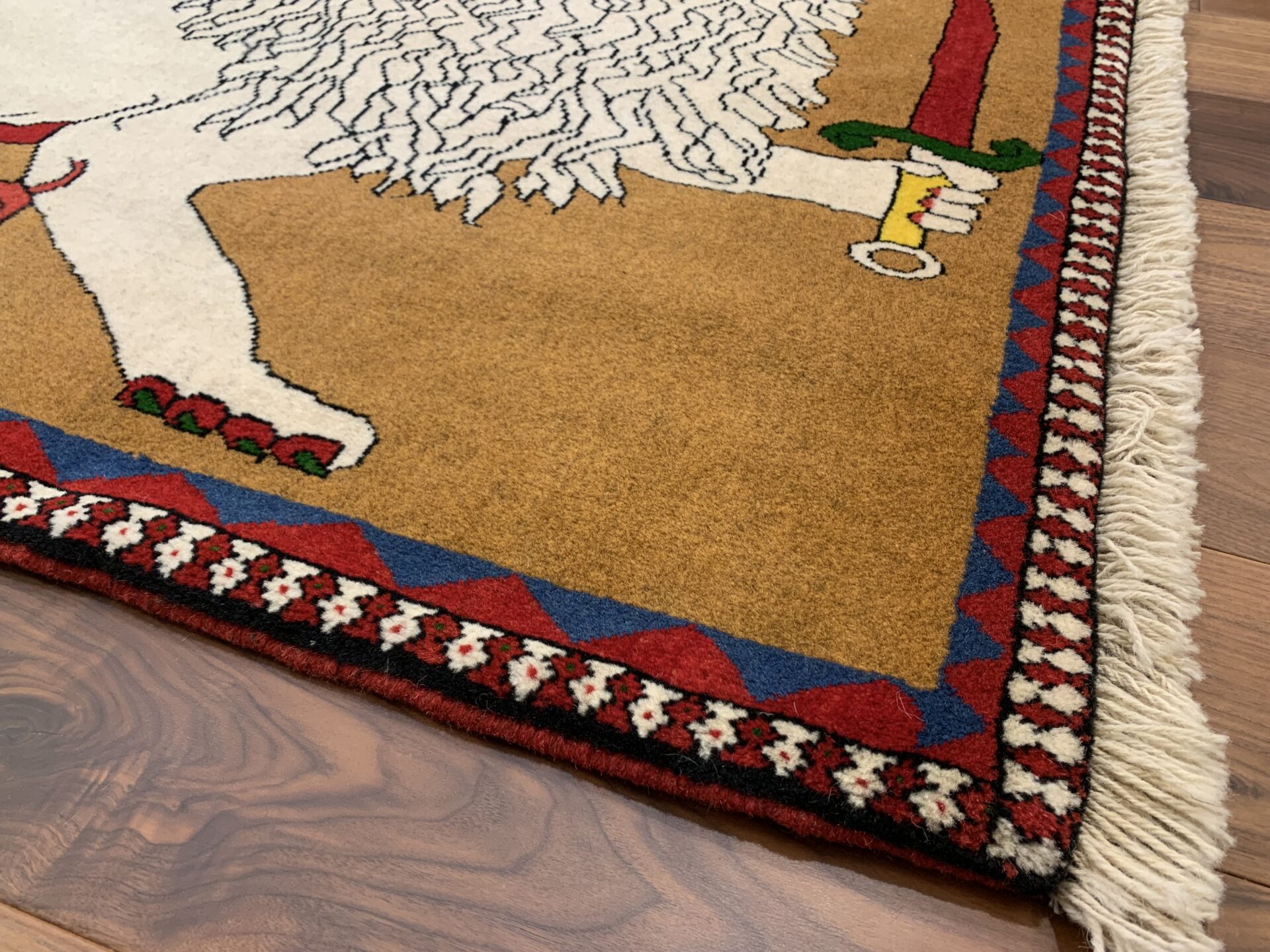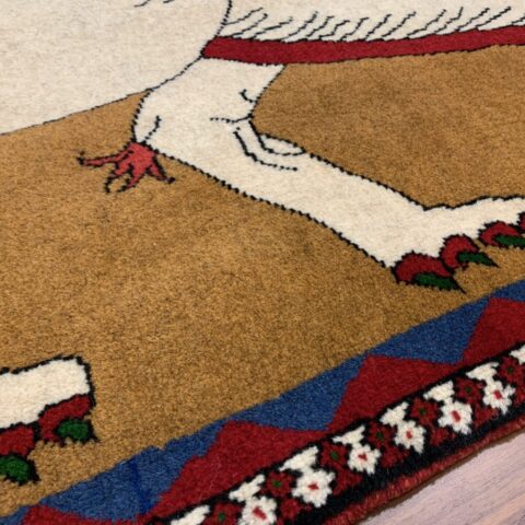 ライオンを囲むのは、織り手が祈りを込めて織り上げた魔除けの紋様。ひし形や稲妻を思わせる連続模様が、邪気を払う護符のように全体を包み込みます。まるで見えない守りの結界のように、空間に静かな安堵をもたらします。