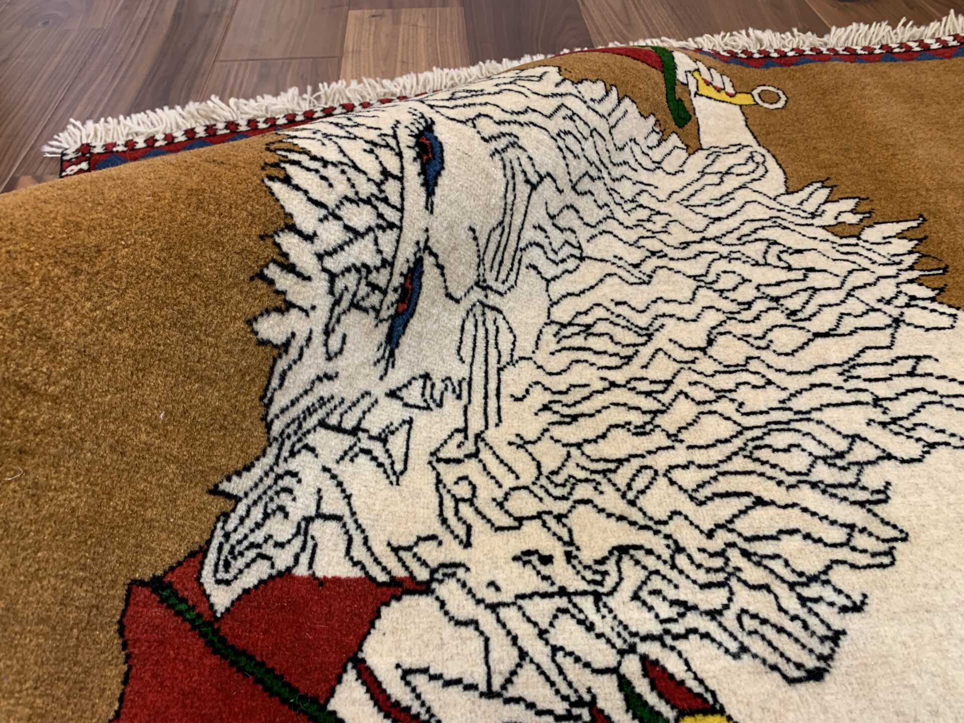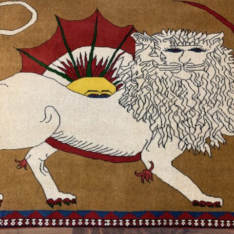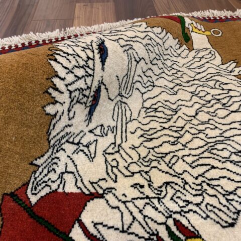 この作品の魅力は、毛足の短い緻密な織り。ライオンの輪郭や毛並みの陰影がくっきりと浮かび上がり、一枚のアートピースのような存在感を放ちます。さらりとした質感で、季節を問わず心地よく使えるのも魅力です。