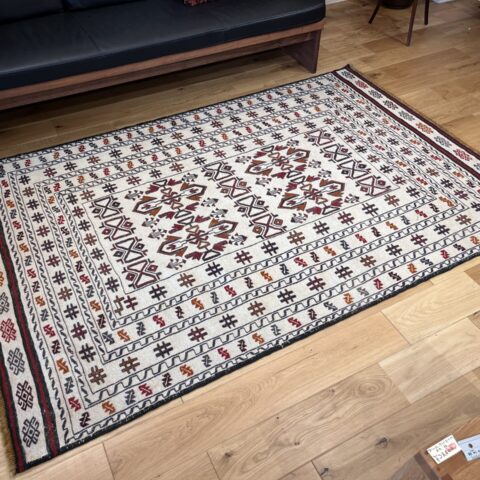 こちらは、生成り(アイボリー)を基調とした、たいへん珍しい配色のクルディスタン・キリム。一般的にキリムには濃い赤や青が多く用いられる中、この一枚は明るくやわらかなベージュトーンでまとめられており、現代の住空間にも自然に溶け込む、洗練された佇まいを見せています。