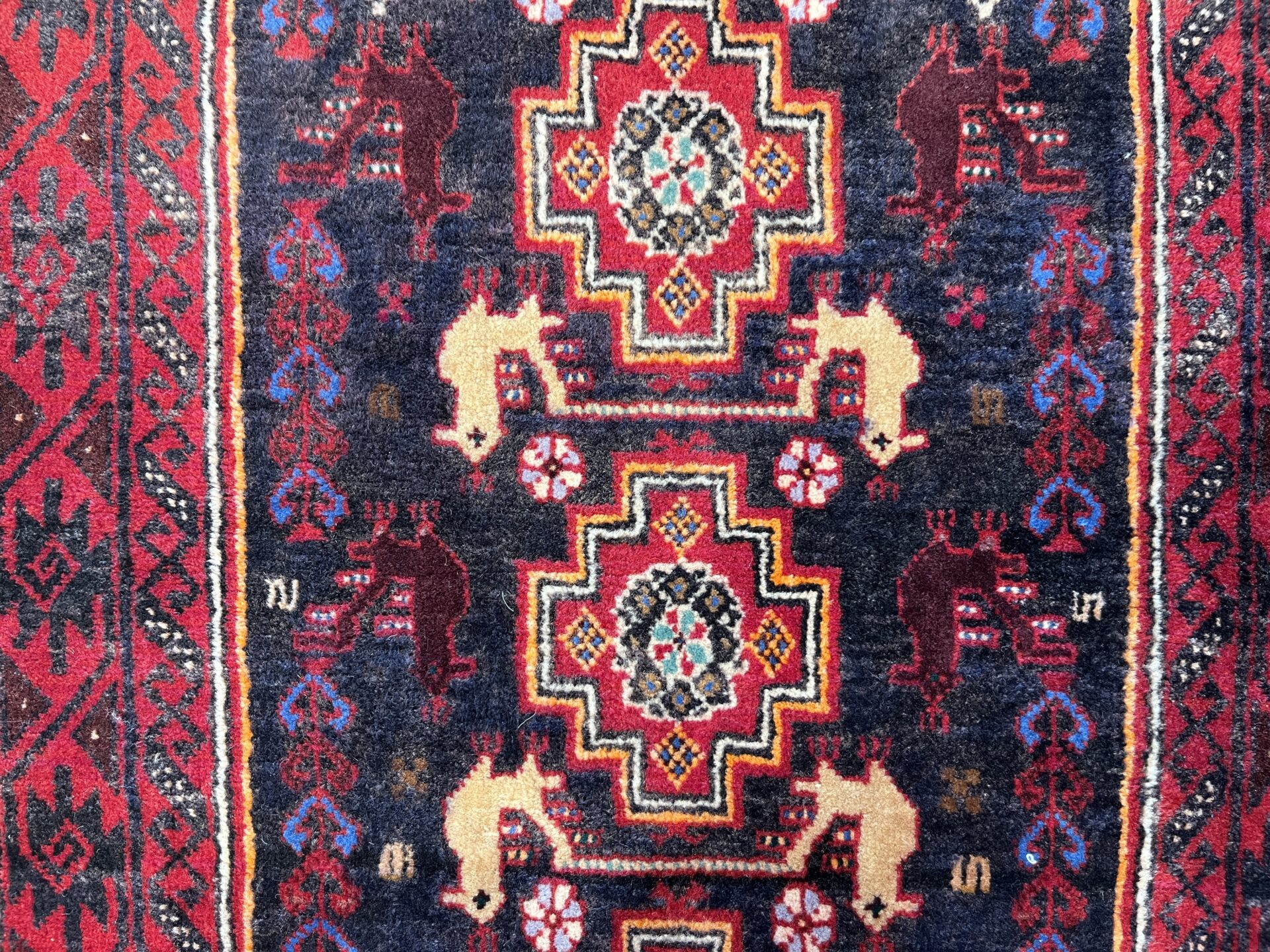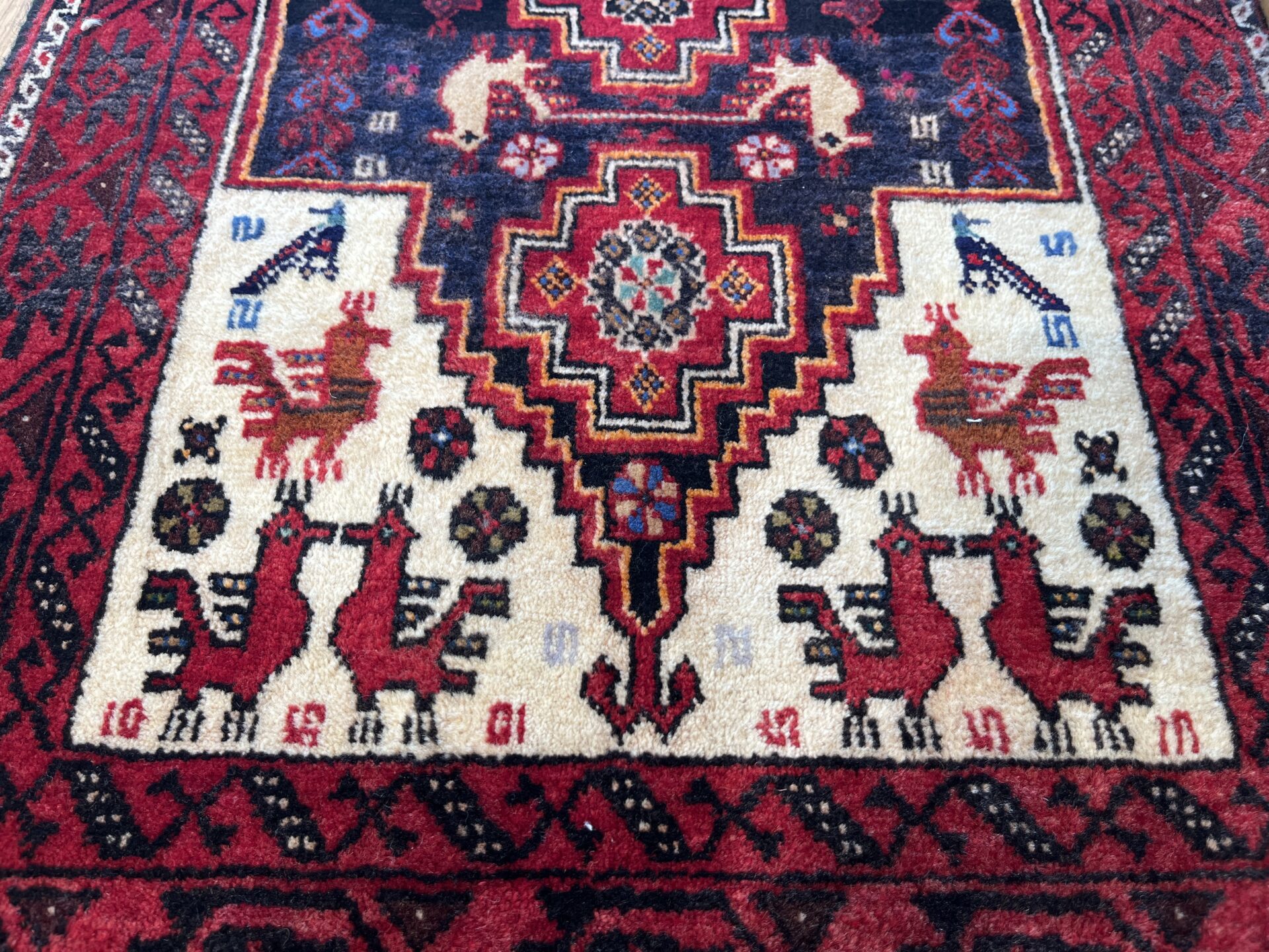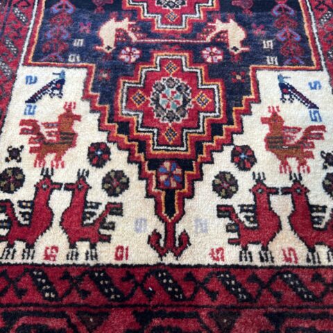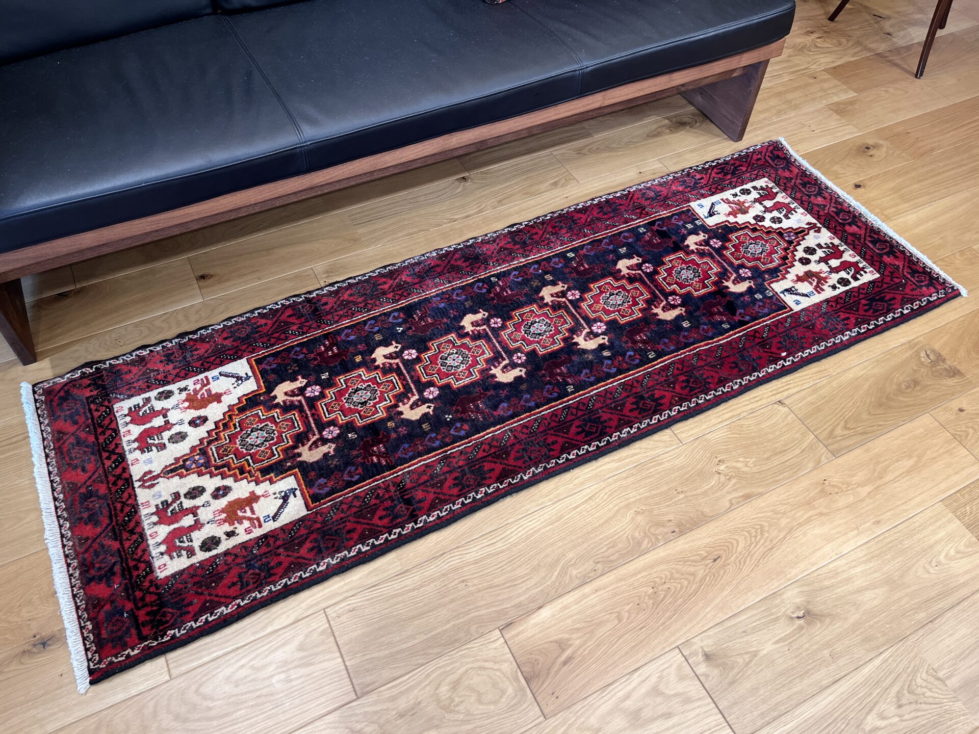 全体を彩るのは、深紅・濃藍・黒・生成りという部族絨毯ならではの落ち着きと力強さを併せ持つ配色。両端に広がる白地フィールドが光を取り込み、全体の印象を軽やかに引き立てる設計となっており、バルーチ絨毯には珍しい明暗の対比が楽しめる逸品です。