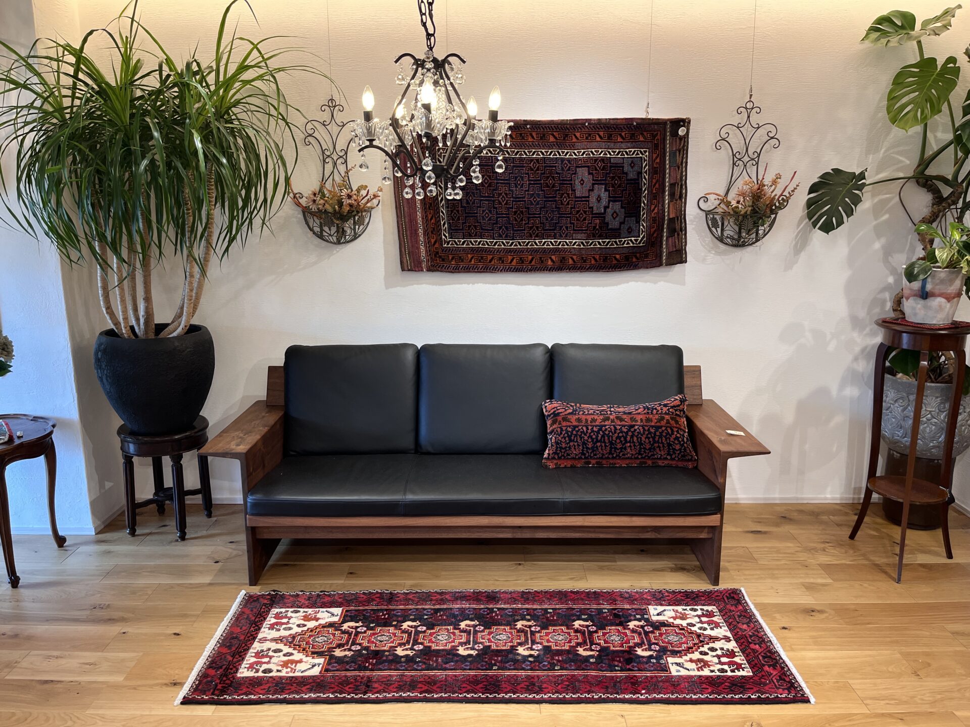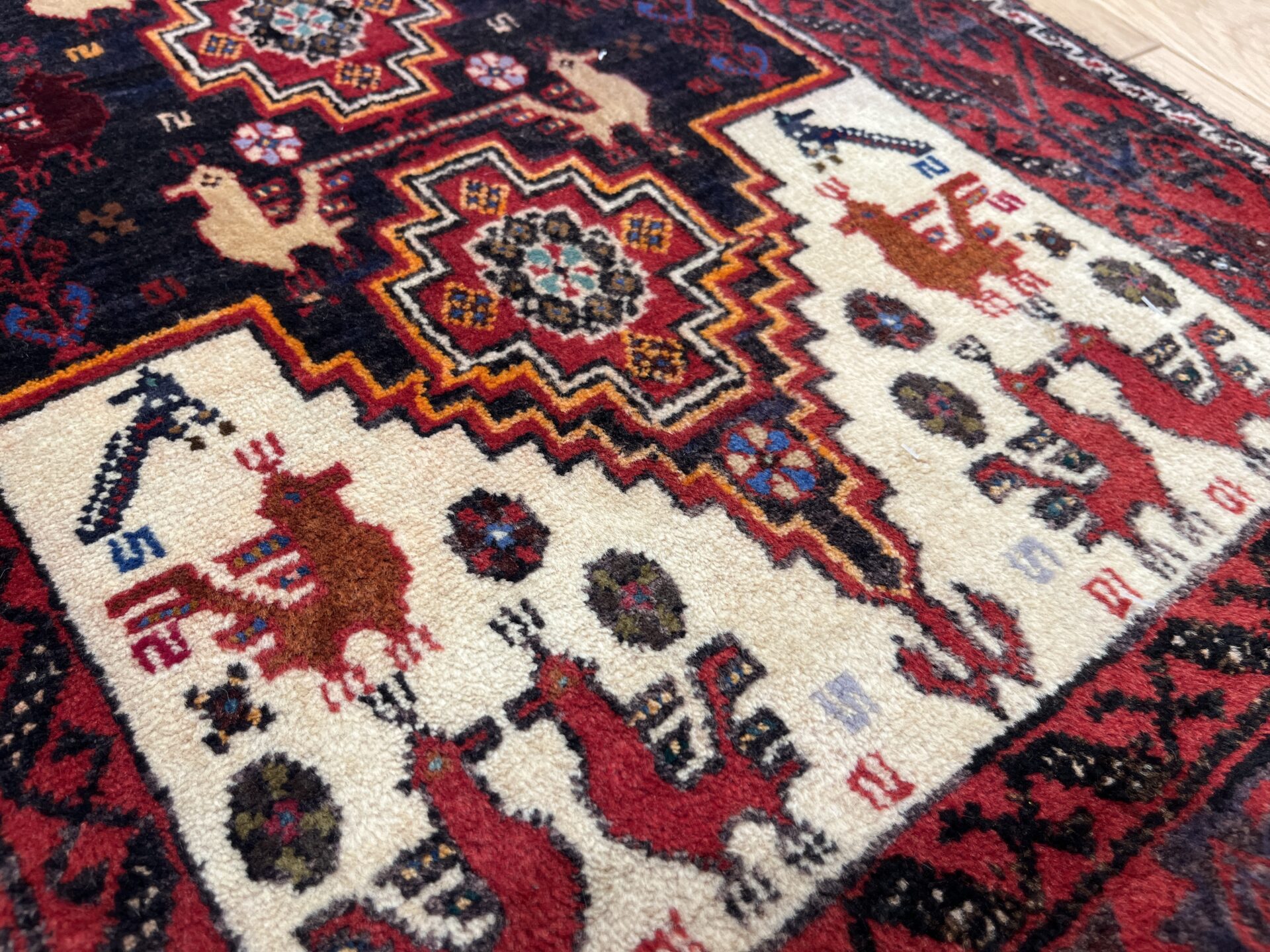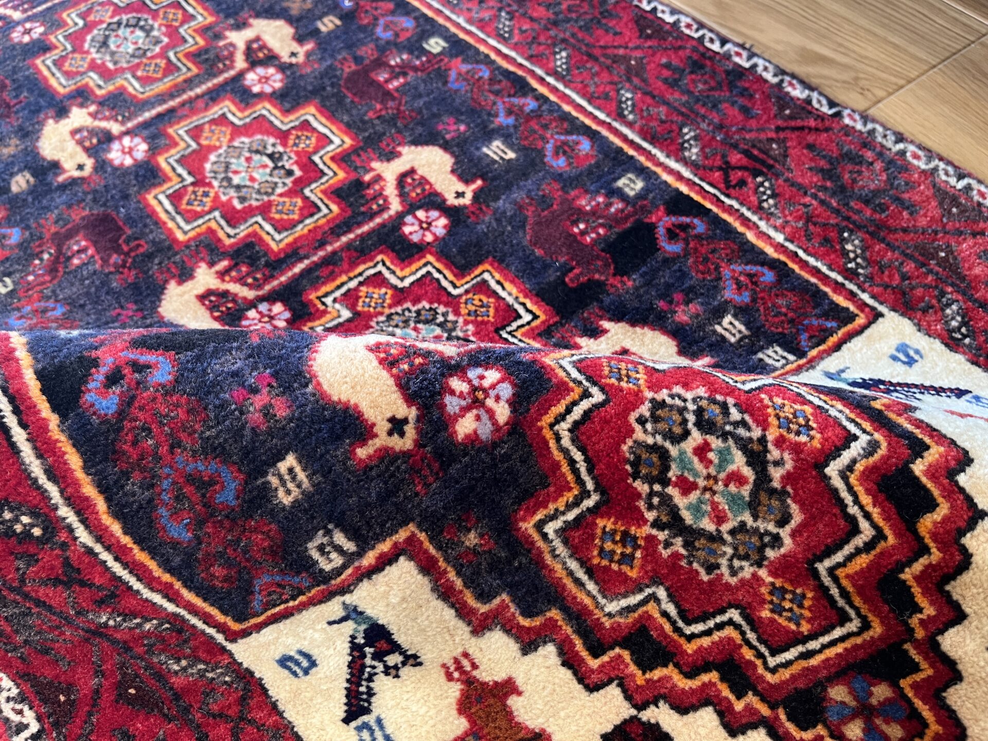 全体を彩るのは、深紅・濃藍・黒・生成りという部族絨毯ならではの落ち着きと力強さを併せ持つ配色。両端に広がる白地フィールドが光を取り込み、全体の印象を軽やかに引き立てる設計となっており、バルーチ絨毯には珍しい明暗の対比が楽しめる逸品です。