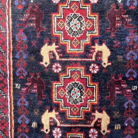 イラン東部からアフガニスタン国境付近に暮らすバルーチ族が手織りした、伝統と個性が光るランナータイプのペルシャ絨毯です。