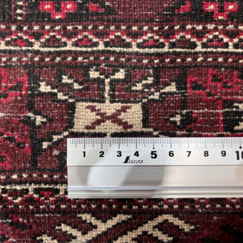 中央のギュル文様が整然と並び、縁には細やかな装飾模様。落ち着きの中に力強さを感じる一枚。