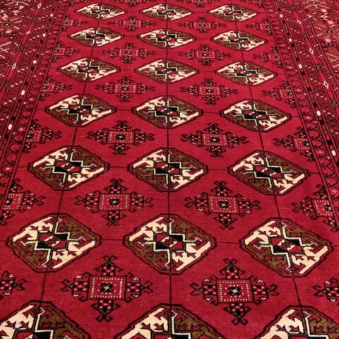 縦糸にシルクを用いた、珍しいトルクメン絨毯。中央には幾何学的なギュル(Gul)紋様が整然と並び、その周囲を取り囲む太めの縁取り(ボーダー)が堂々とした存在感を放ちます。深紅と生成り、黒のコントラストが美しく、力強さと上品さが見事に同居しています。