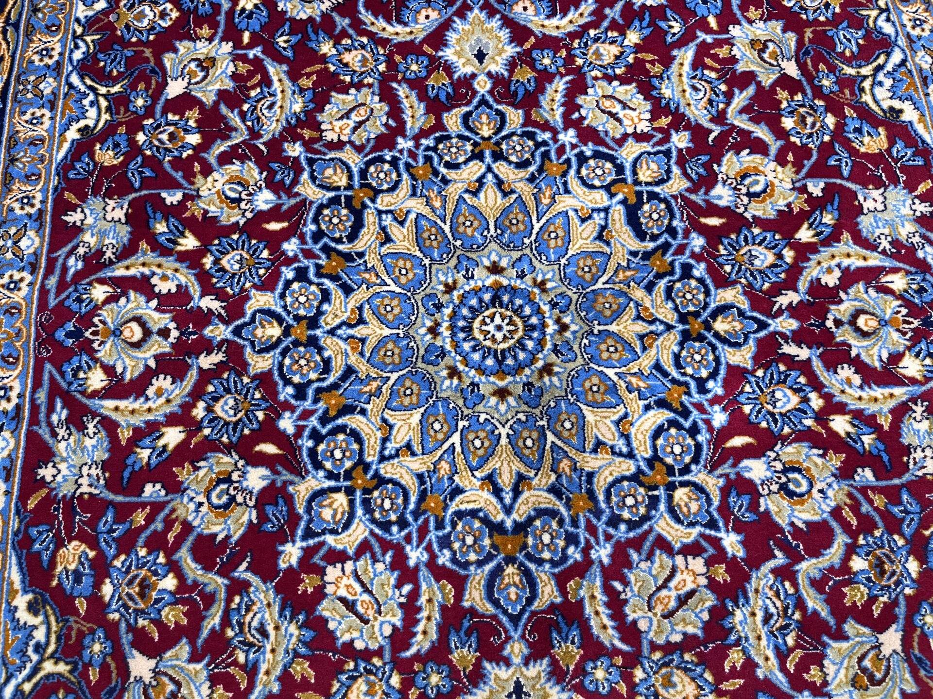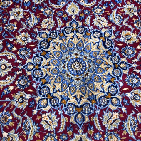 中心に広がるメダリオンは、まるで宝石細工のように精緻で、深紅のフィールドに広がる草花や唐草模様が、上質な絵画のような印象を与えます。地色のブルー、差し色としての生成り、そして赤の対比が美しく調和し、見る者を飽きさせません。