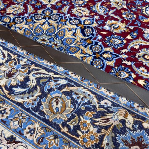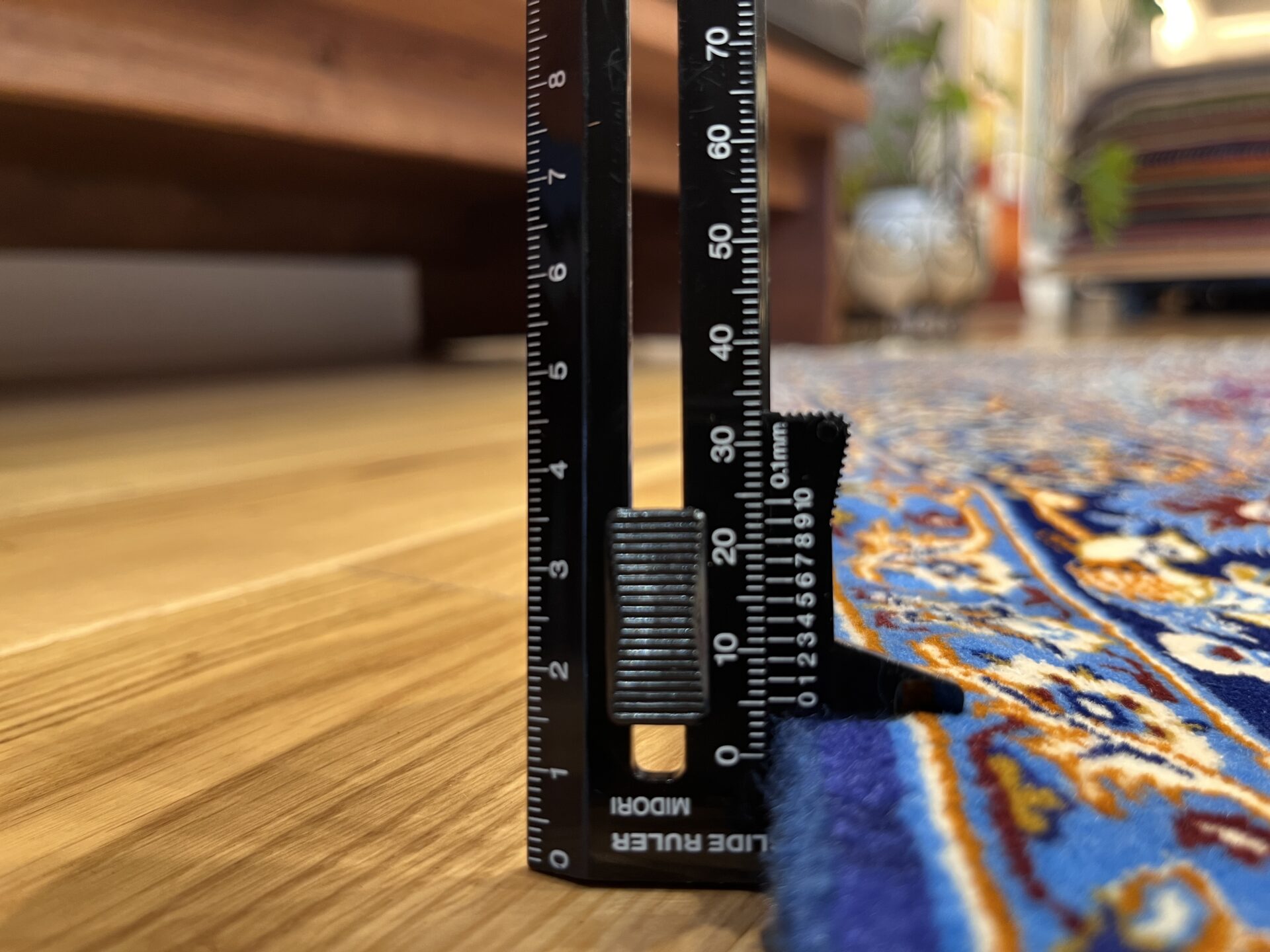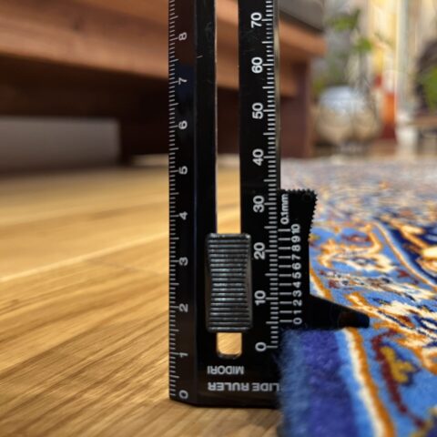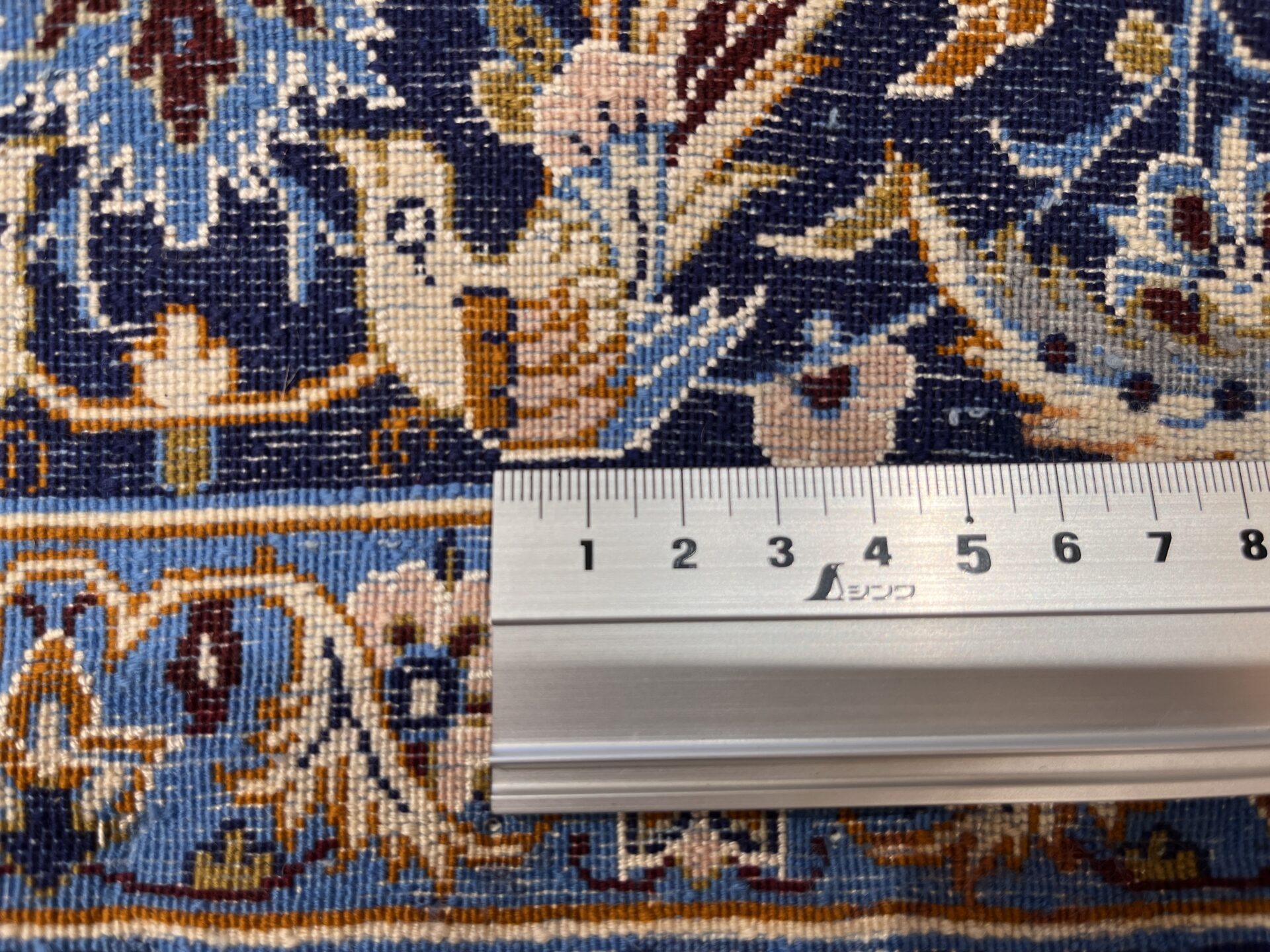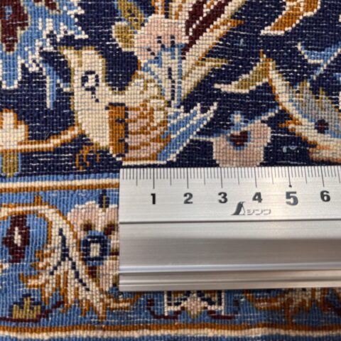 この絨毯は、非常に細かいノットで織られており、そのために生まれるしなやかでなめらかな質感が最大の魅力。触れた瞬間に、織りの精度と素材の良さを直感的に感じ取ることができます。