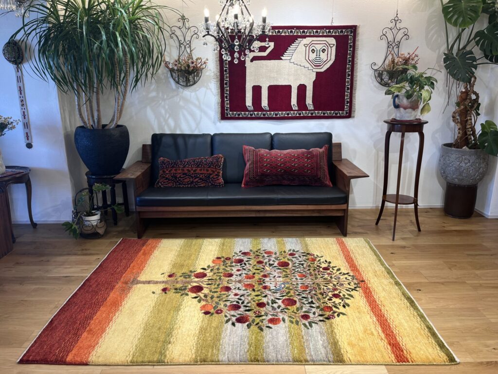 リビングをパッと華やかにしてくれる、草木染めの多色が美しい一枚。