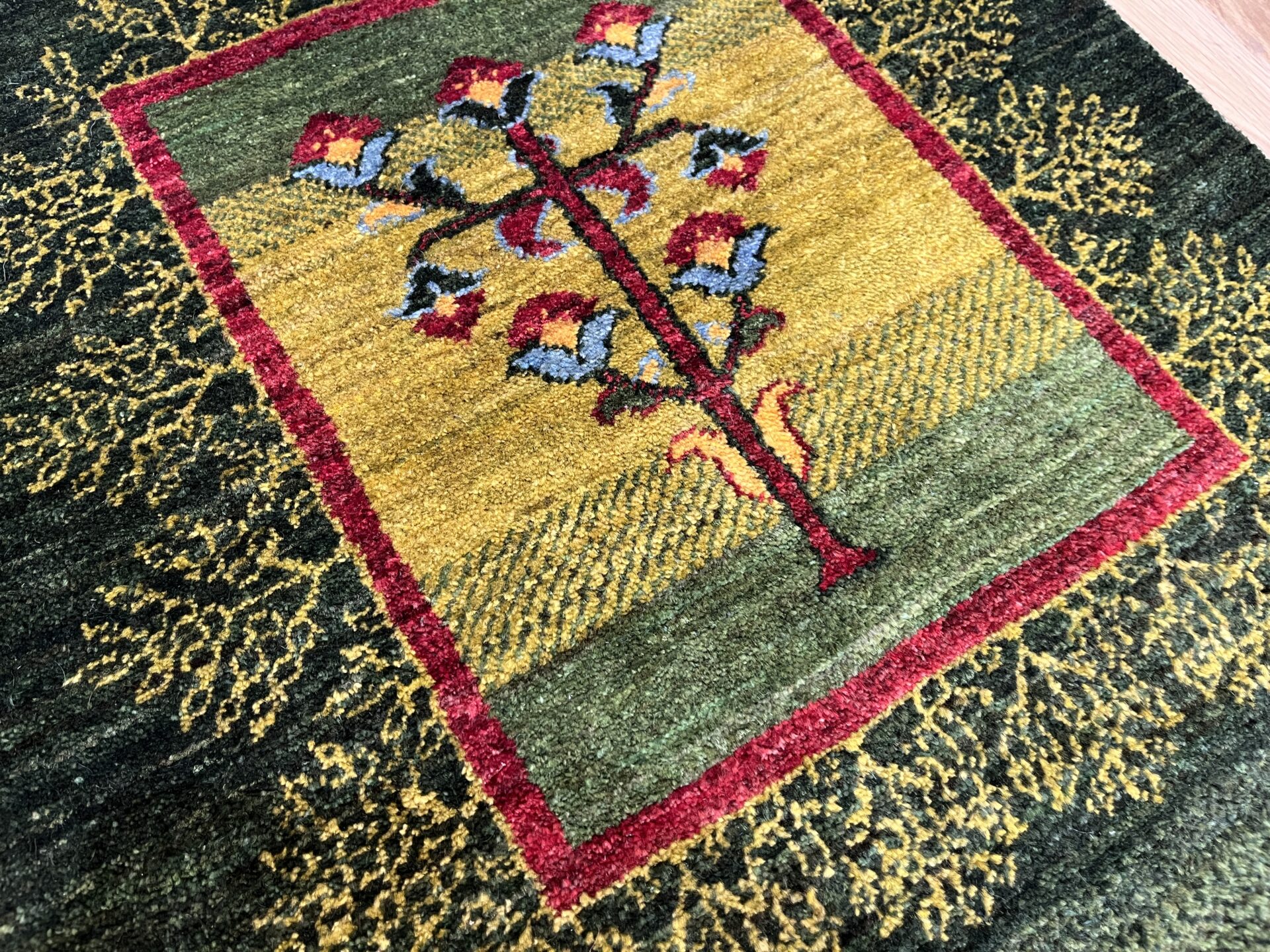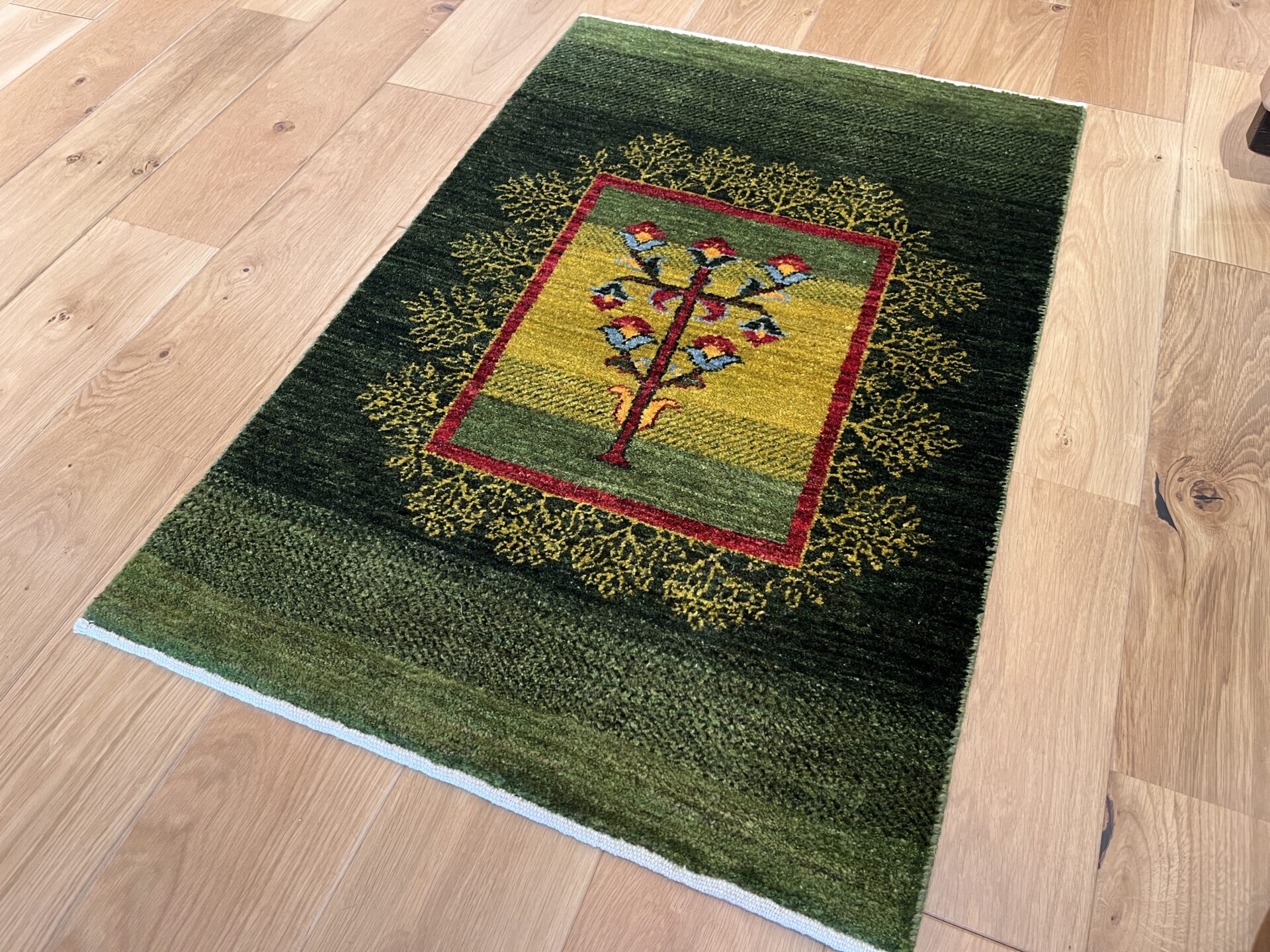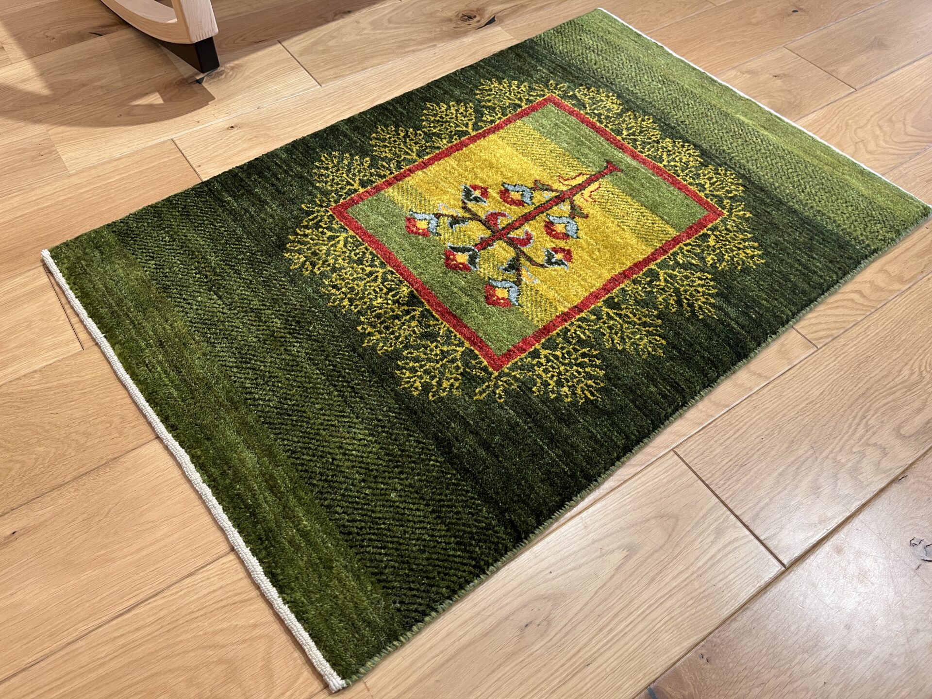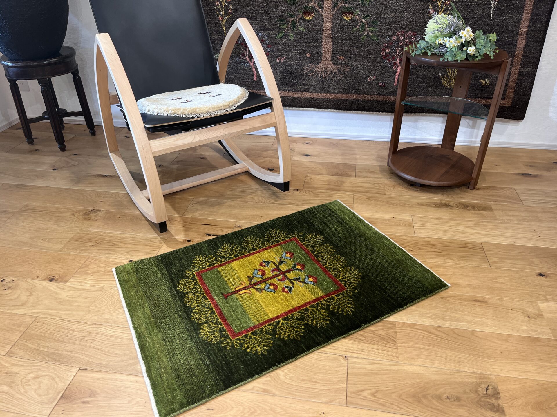 カシュクリ・ギャッベはアマレよりも細かな糸を使い、より緻密で滑らかな織りが特徴です。草木染めの色が美しく映え、模様の表現力も豊か。品質と軽やかさのバランスに優れ、使い心地と見た目の両方にこだわりたい方に最適な「カシュクリ ギャッベ」です。