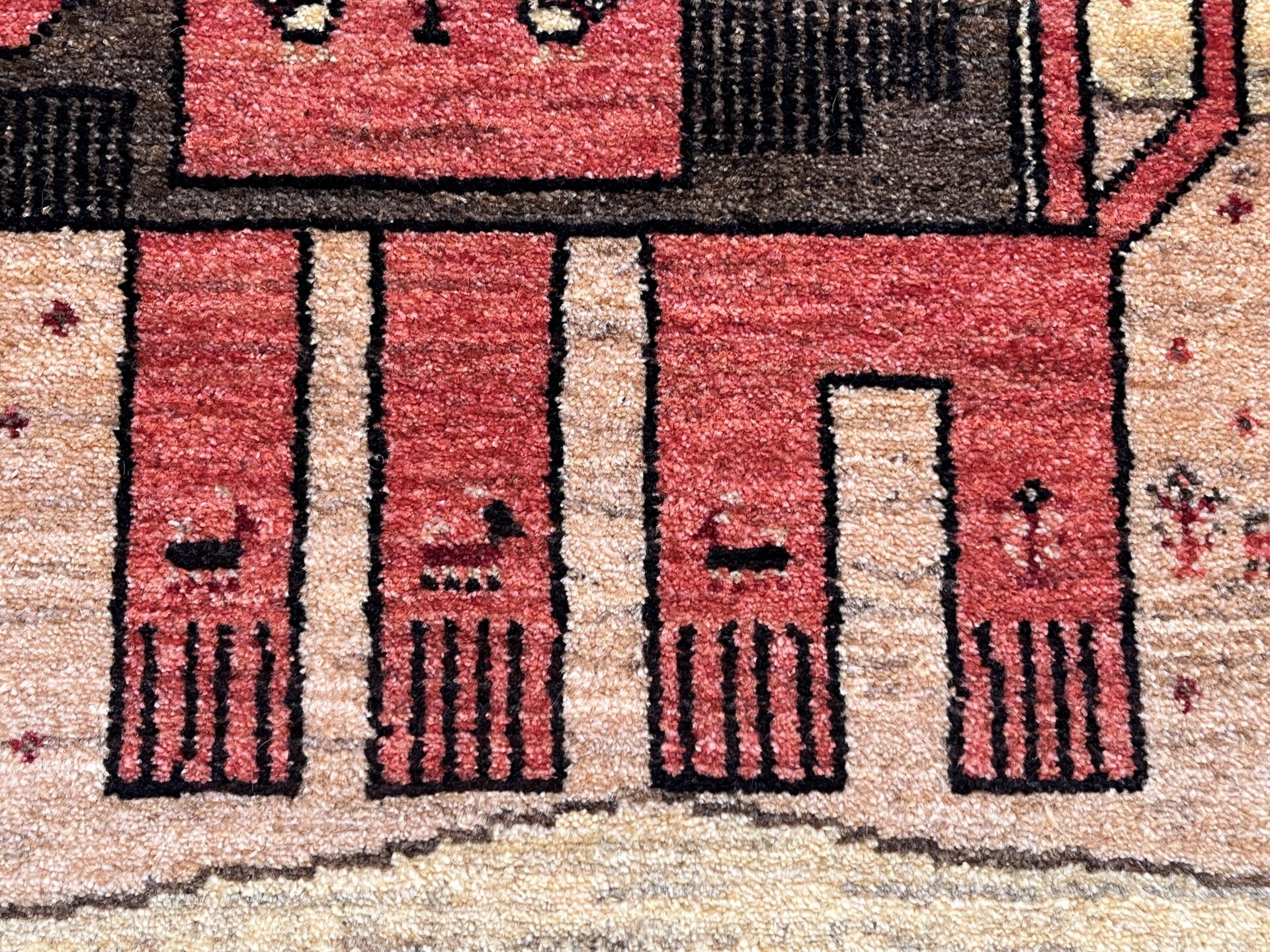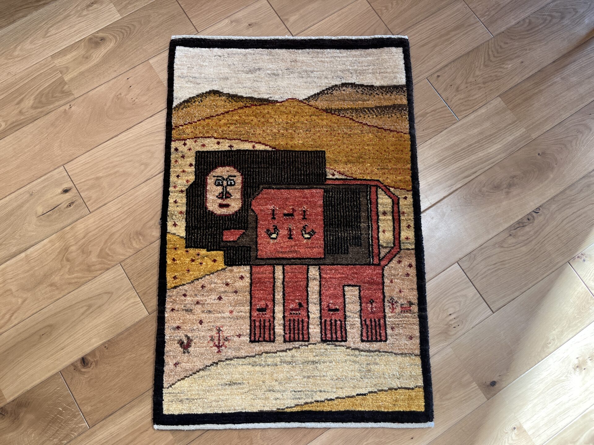 イランの大地を思わせるベージュから黄金色へのグラデーションの中に、愛嬌を感じさせる表情でユーモラスに描かれたライオンが存在感を放ちます。