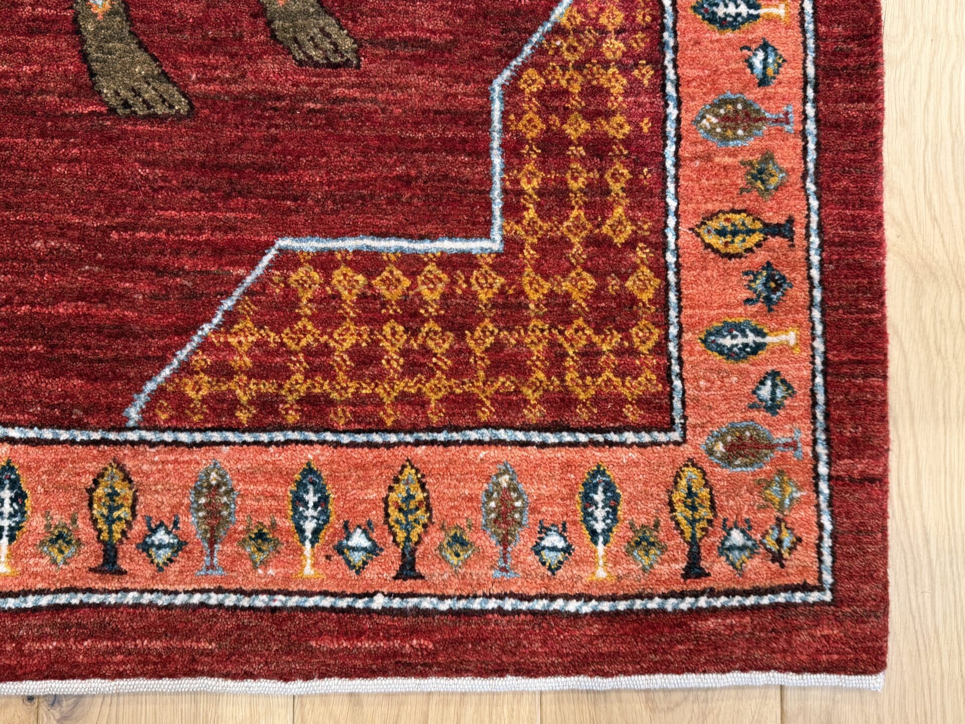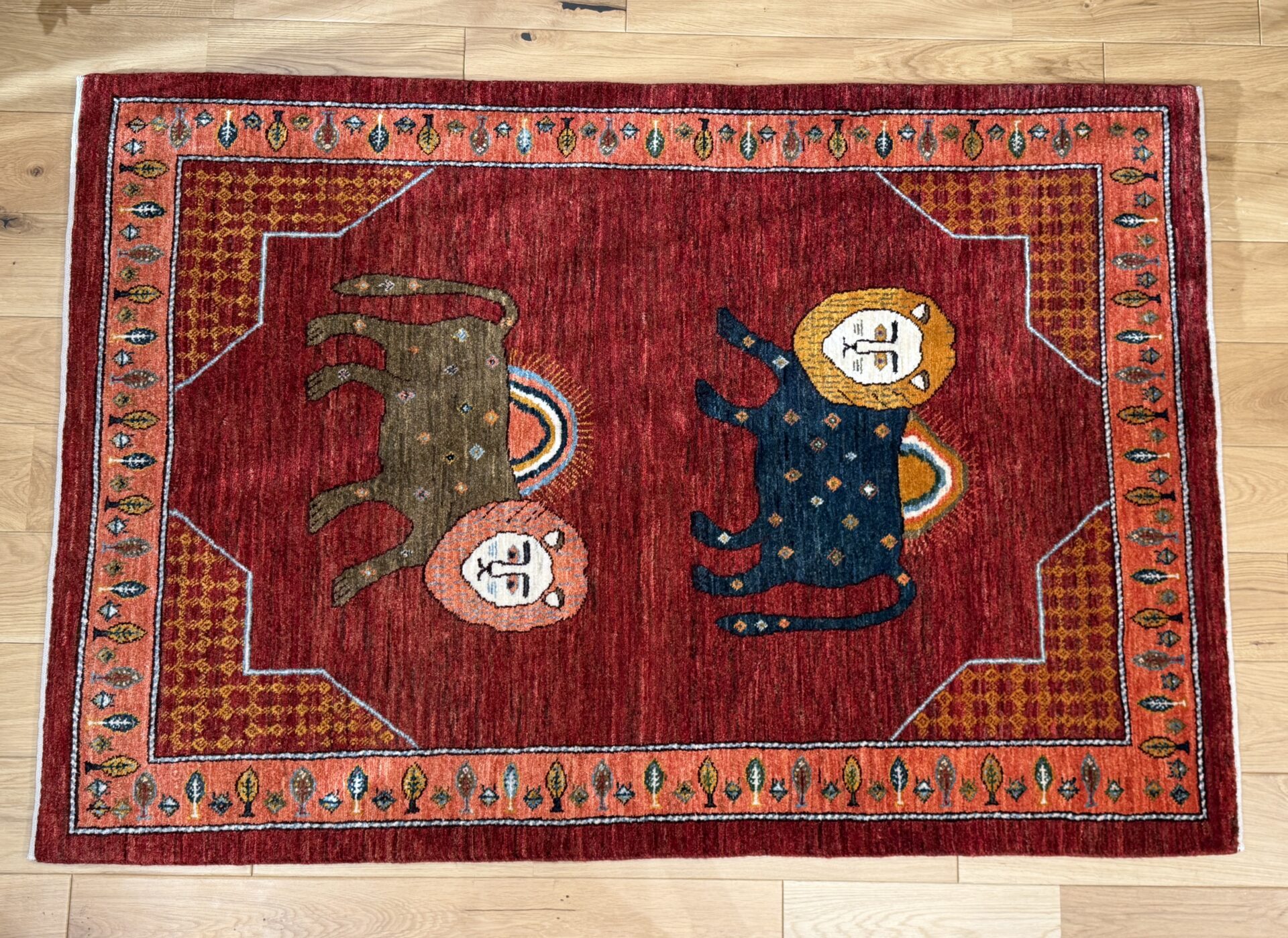 緻密に織り込まれた二匹のライオンは“勇気と力強さ”の象徴、中央に描かれた太陽神は“生命と繁栄”を意味しています。ライオンの表情はどこかユーモラスで、遊牧民の温かな人柄が感じられます。