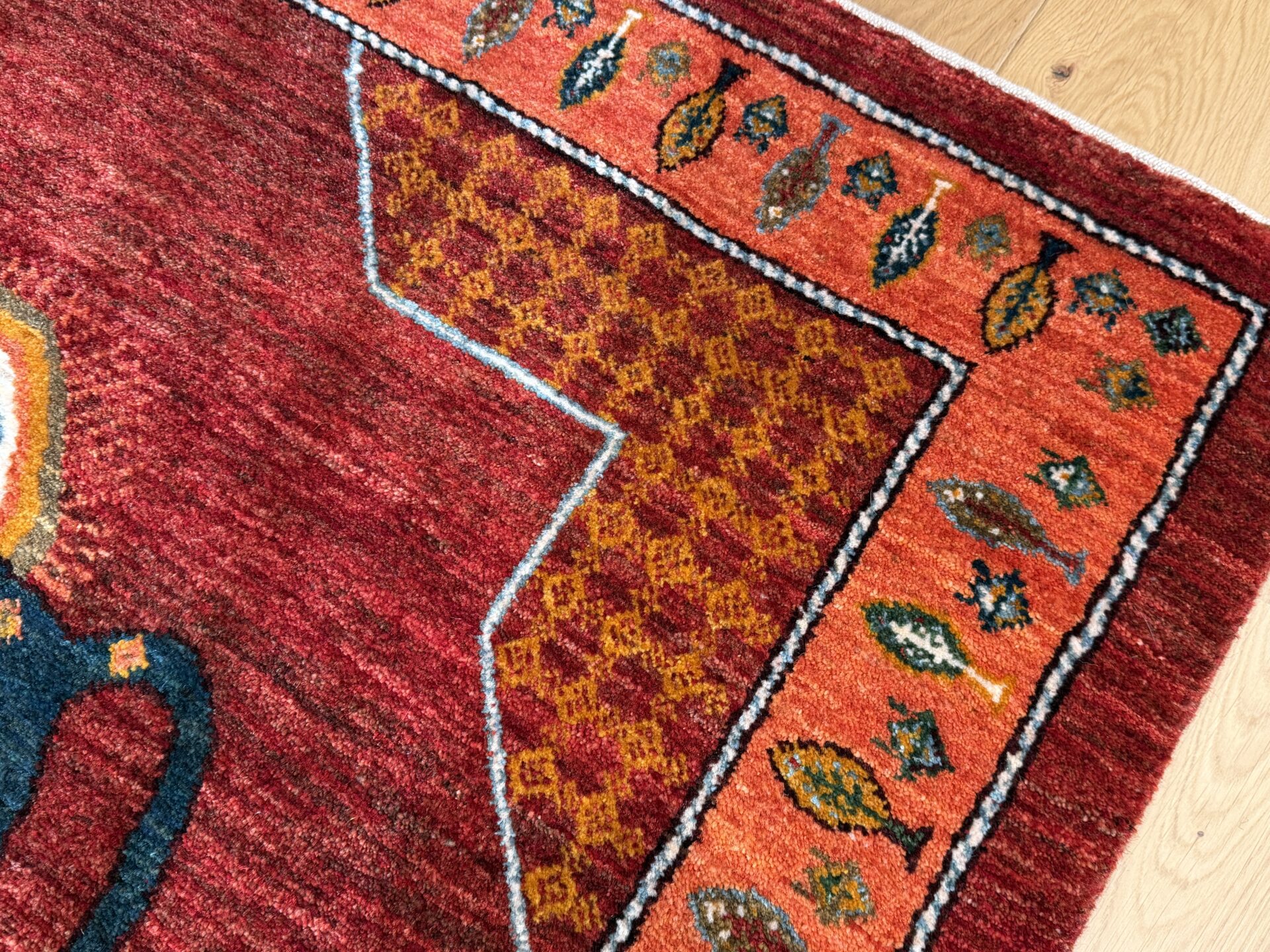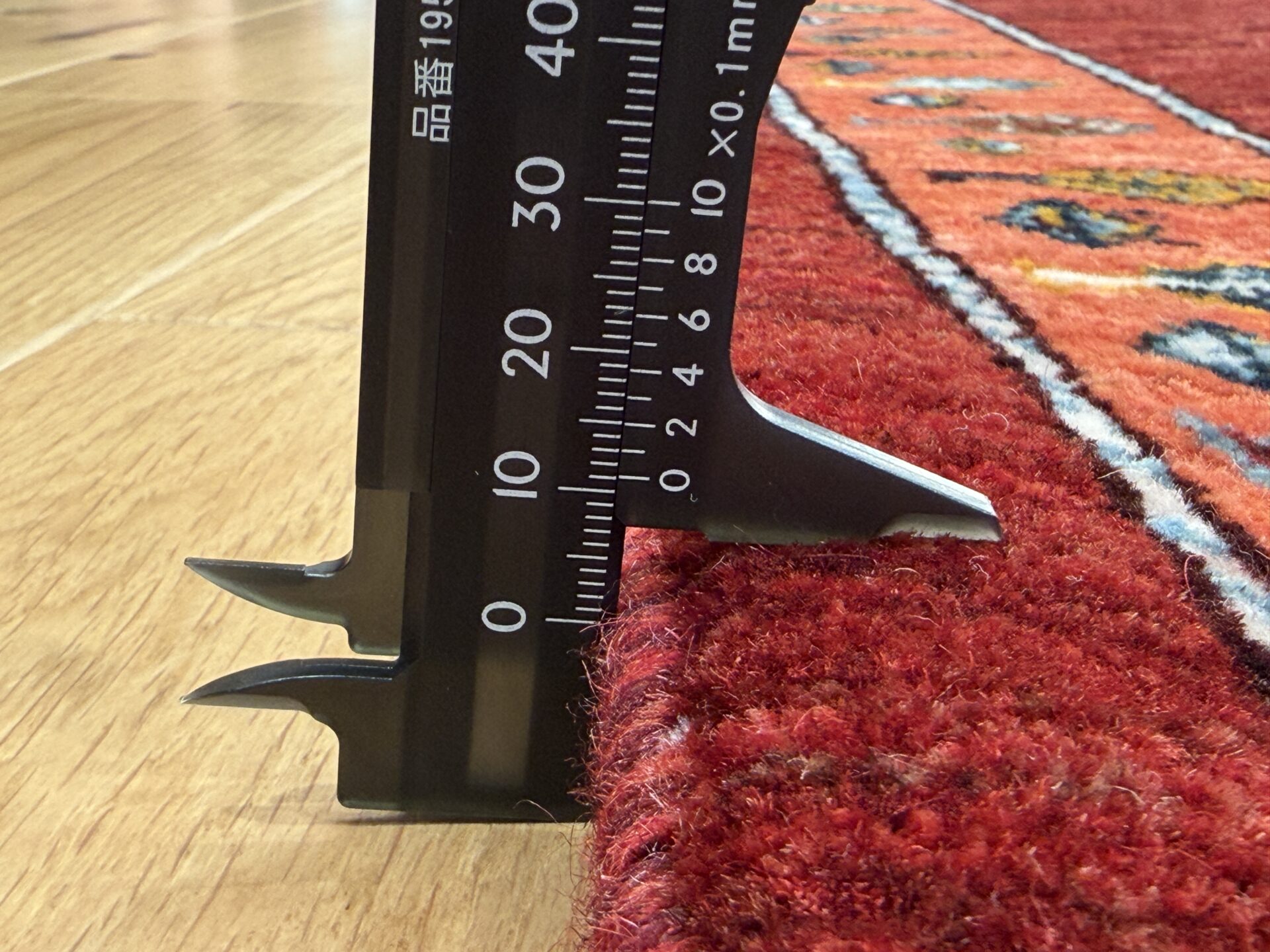 背景の深みある茜色が空間に温もりと高貴さをもたらし、光の当たり方によって表情を変えるその姿はまるで絵画のよう。ルリ族ならではの緻密な織りと洗練されたデザインが見事に調和した、まさに“絨毯を超えたアートピース”といえる逸品です。