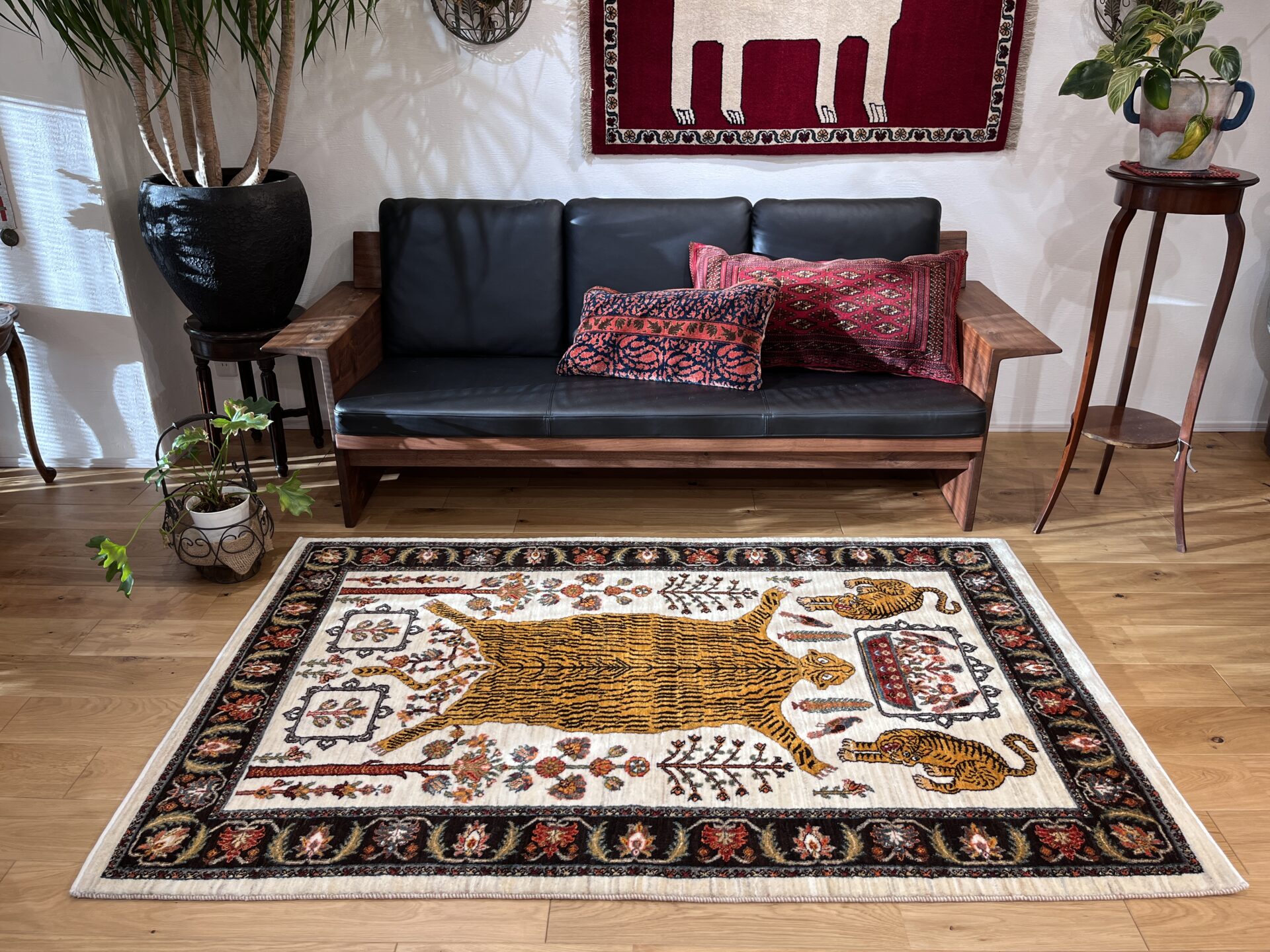 周囲には、2匹のトラ、鳥、糸杉などが配され、「自然の調和」と「豊かさ」を祈る遊牧民の願いが込められています。ルリバフらしい織りの細かさで、細部の紋様もくっきりと表現されています。