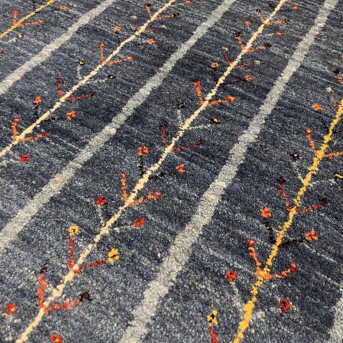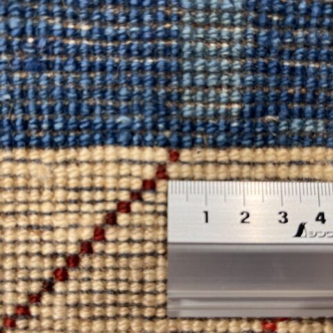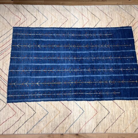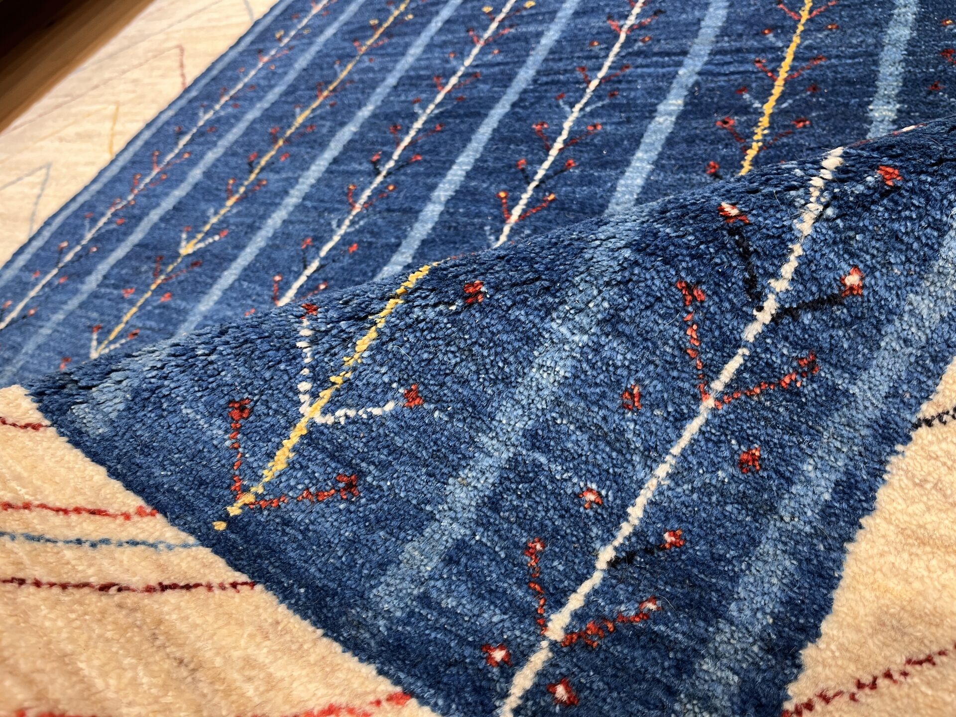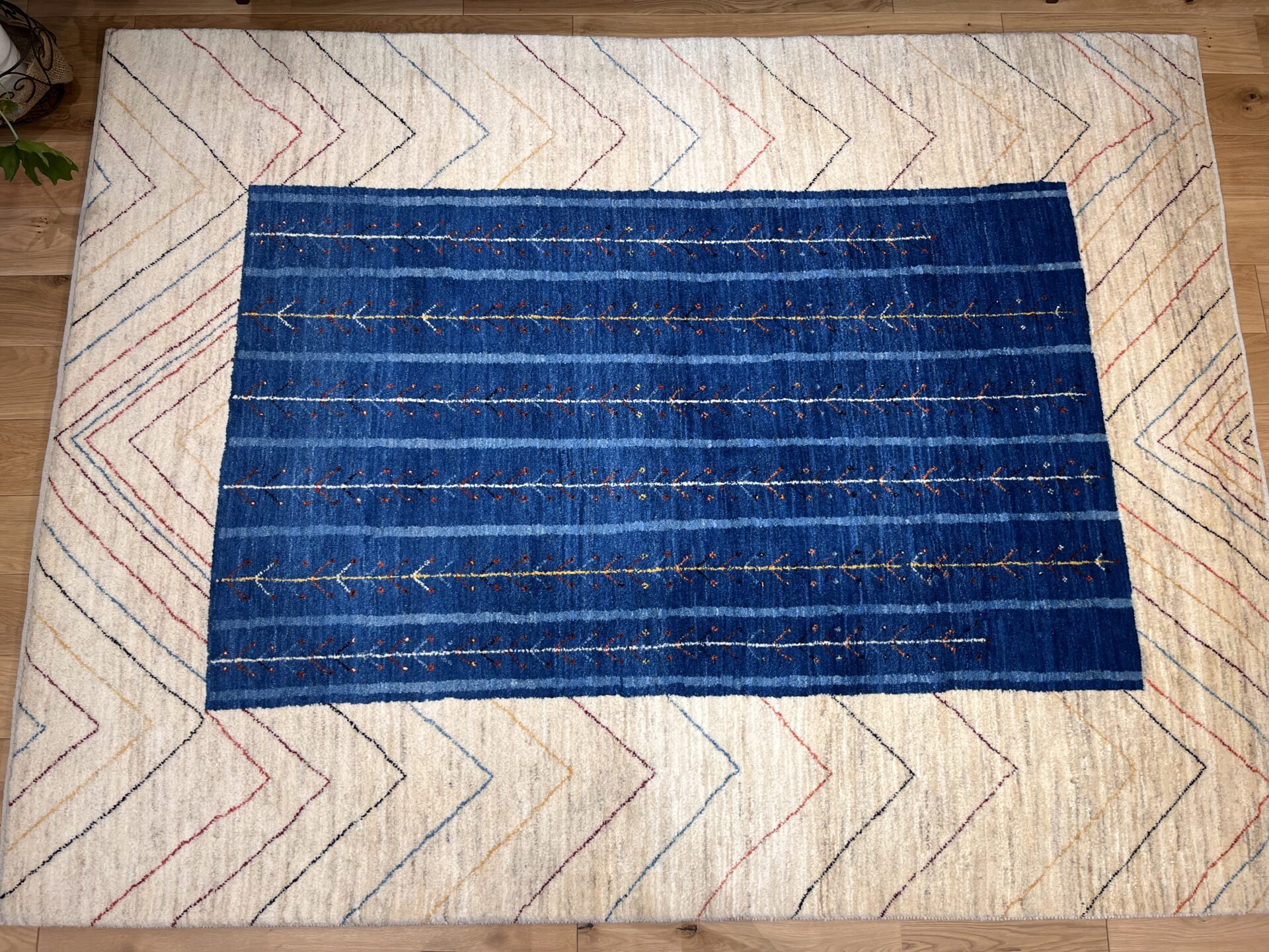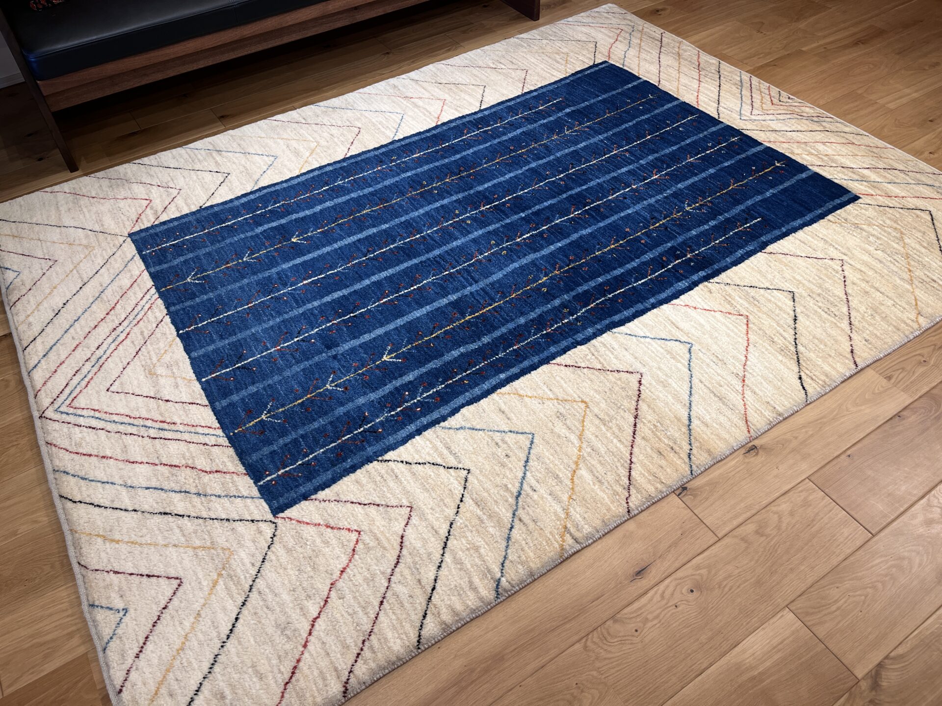 原毛をフィールドに、中央の深いブルーが印象的なアクセントが美しいギャッベ。