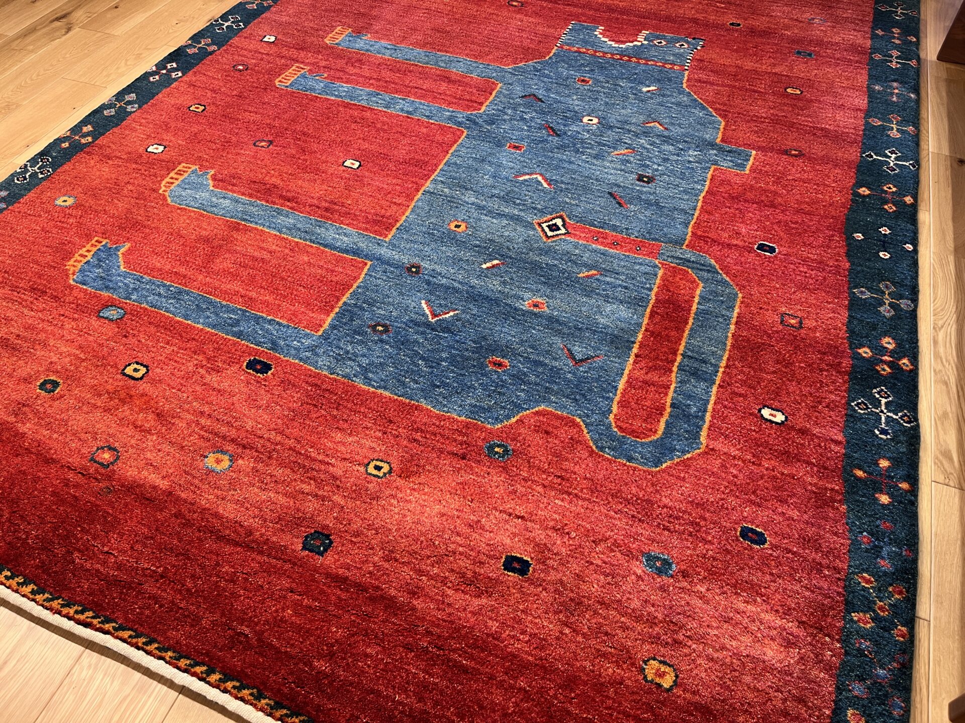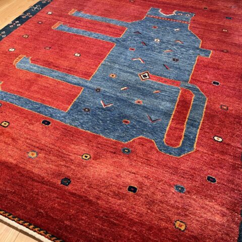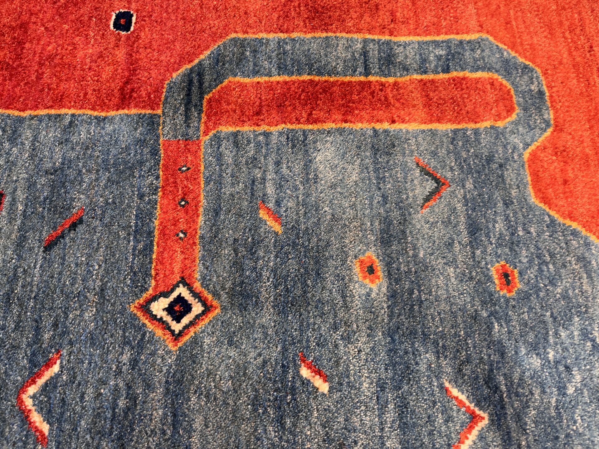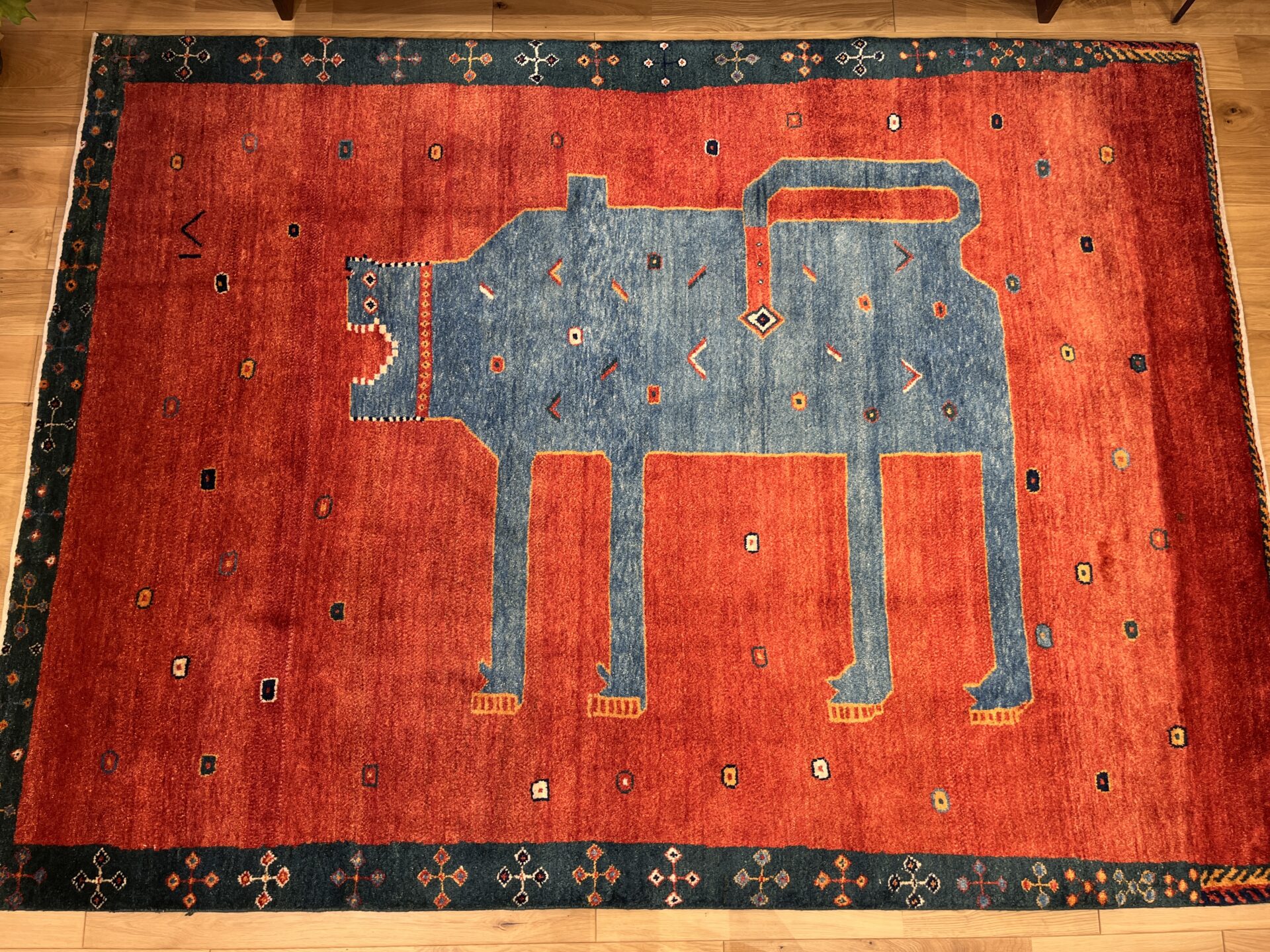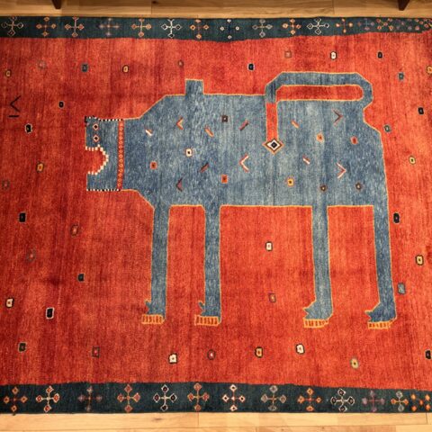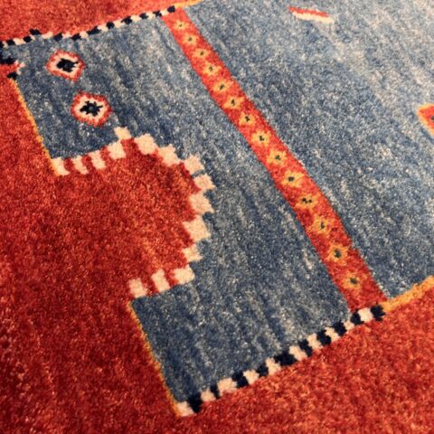 深みのある茜色のフィールドに、青く染め上げられたライオンが堂々と織り込まれた印象的なギャッベ。