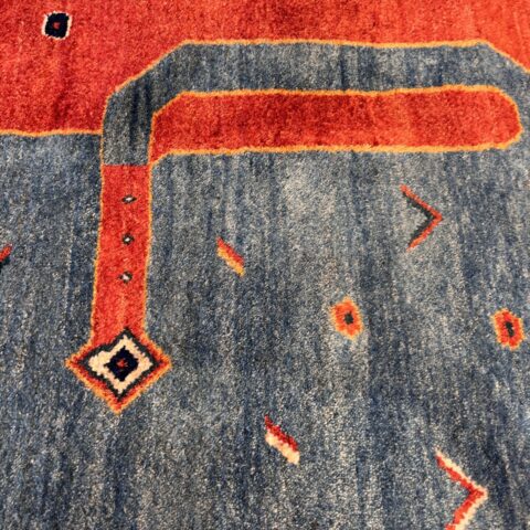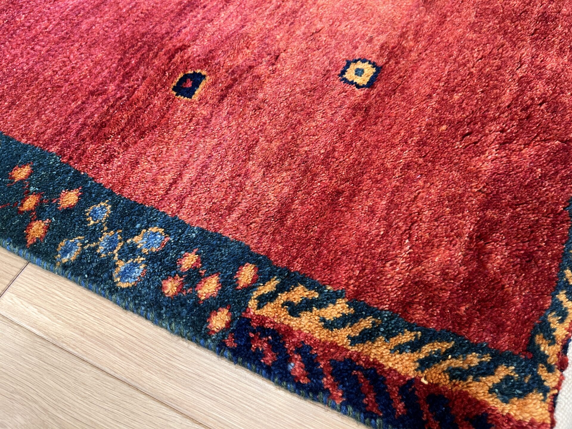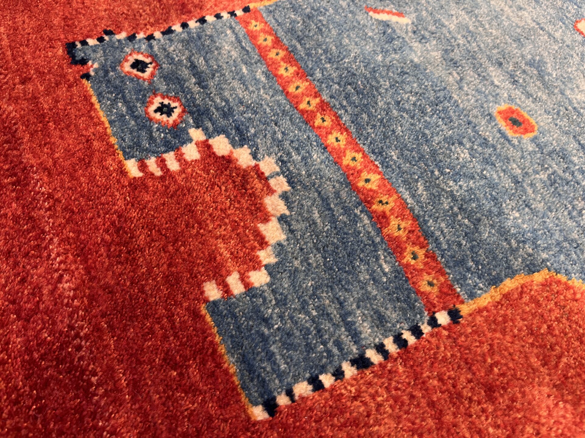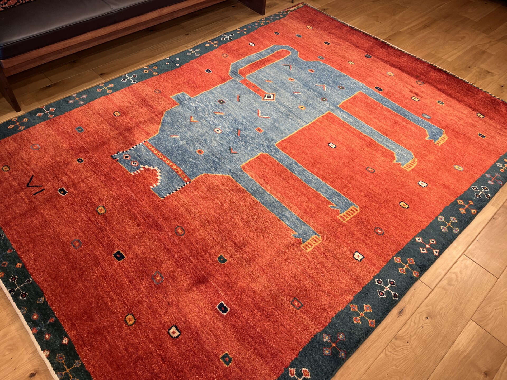 深みのある茜色のフィールドに、青く染め上げられたライオンが堂々と織り込まれた印象的なギャッベ。