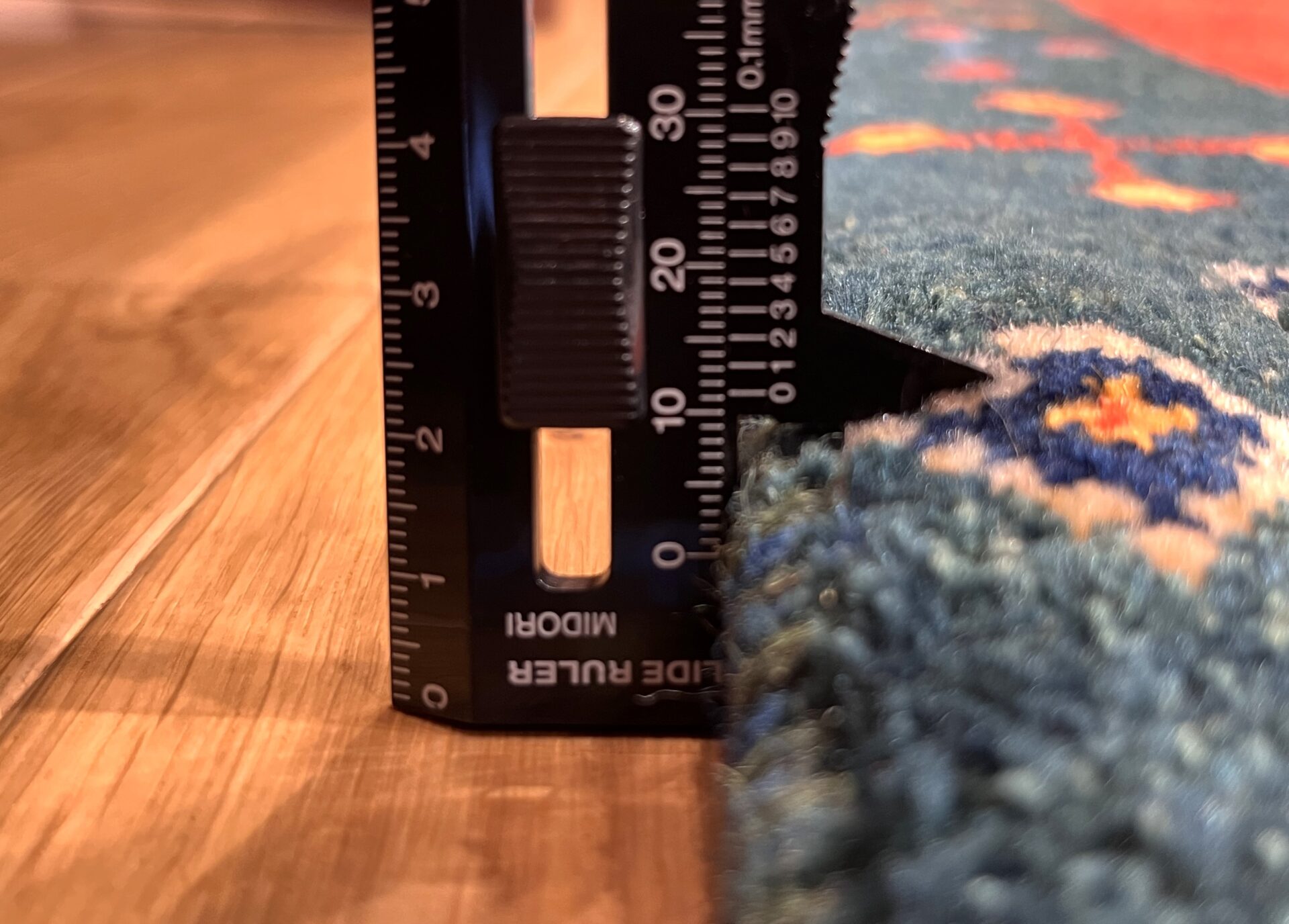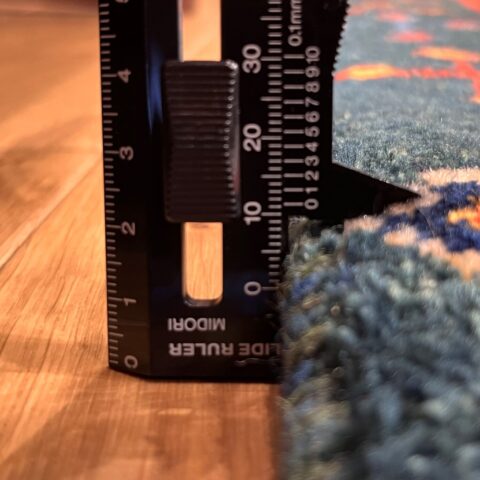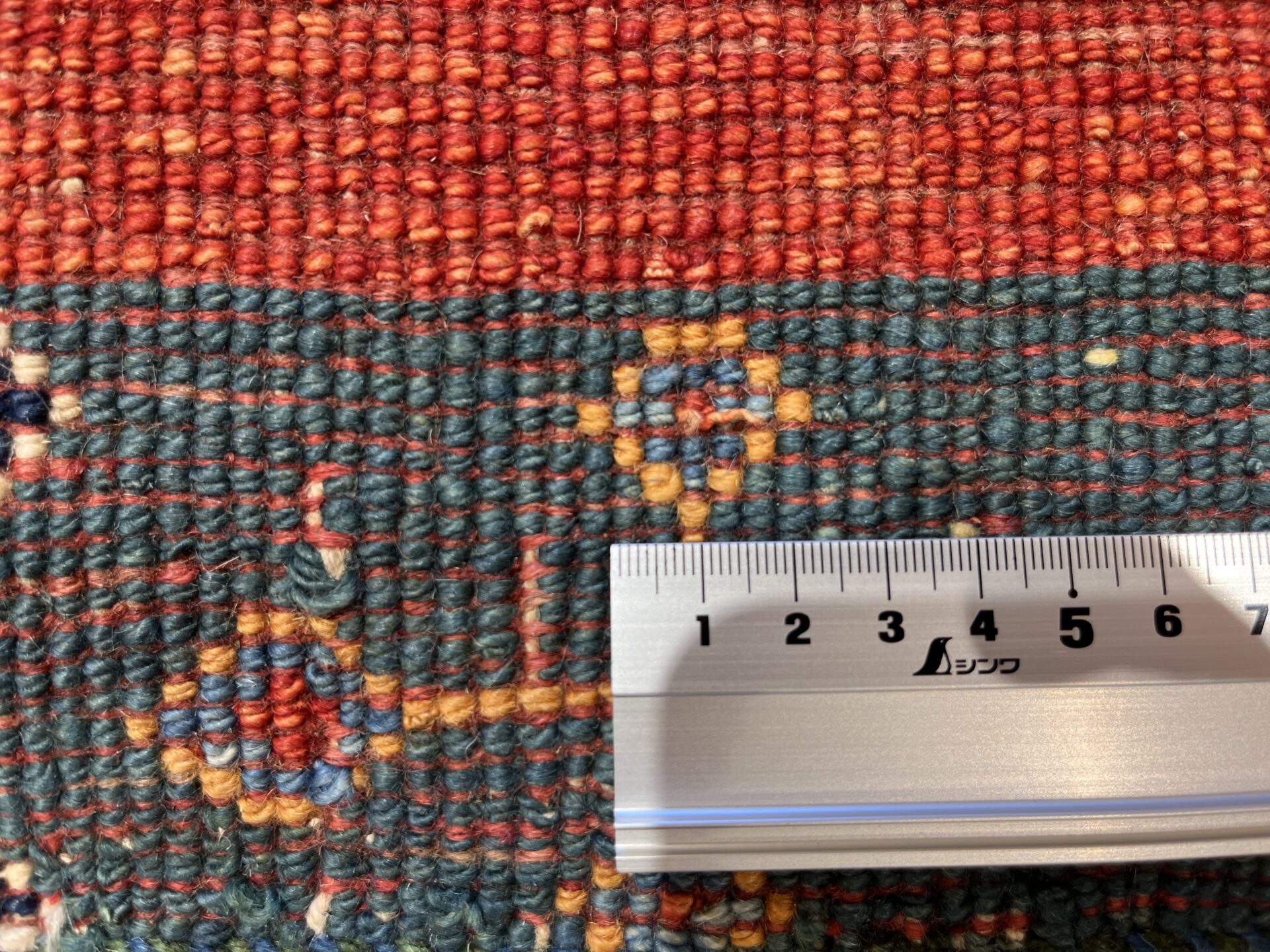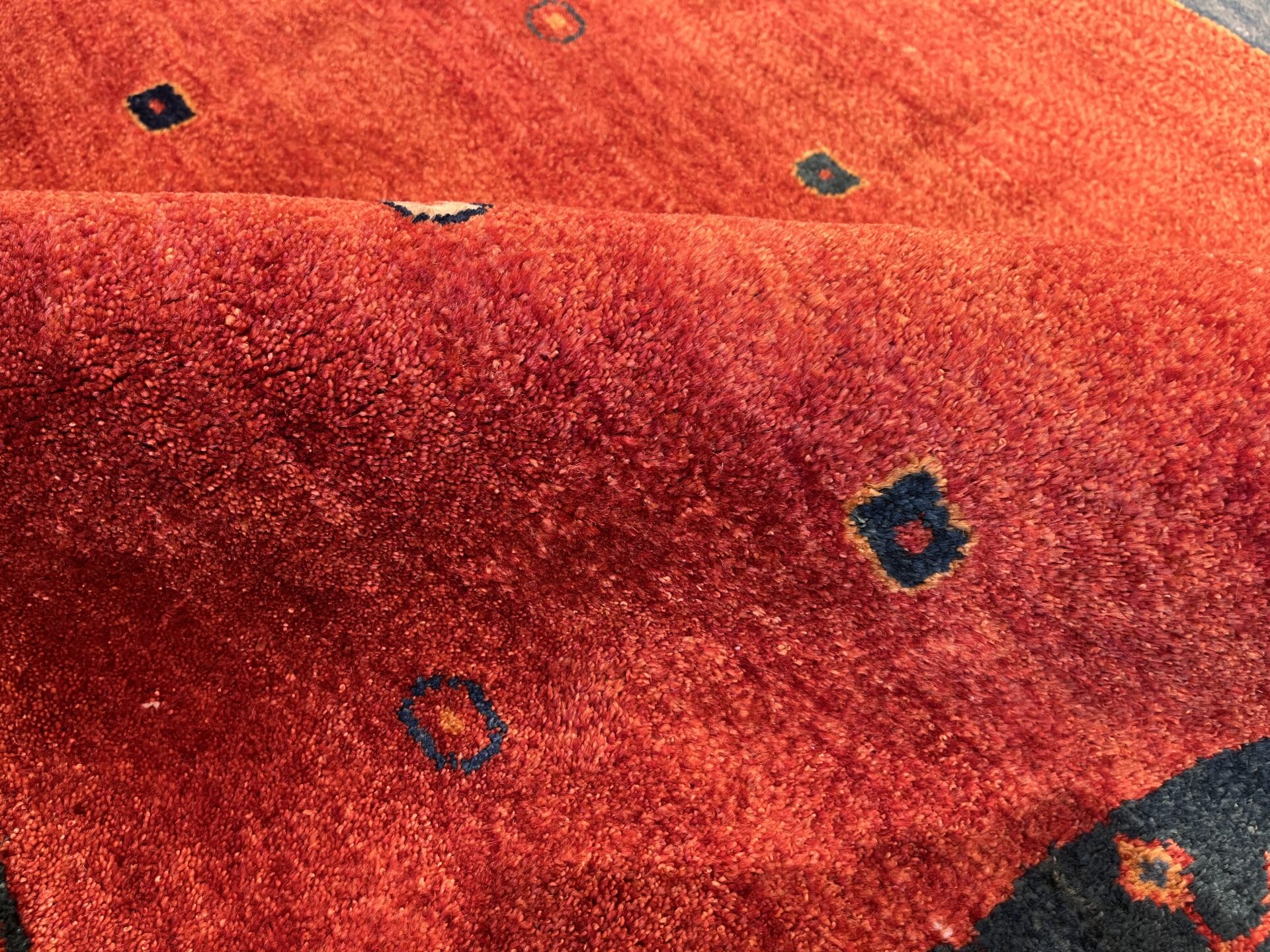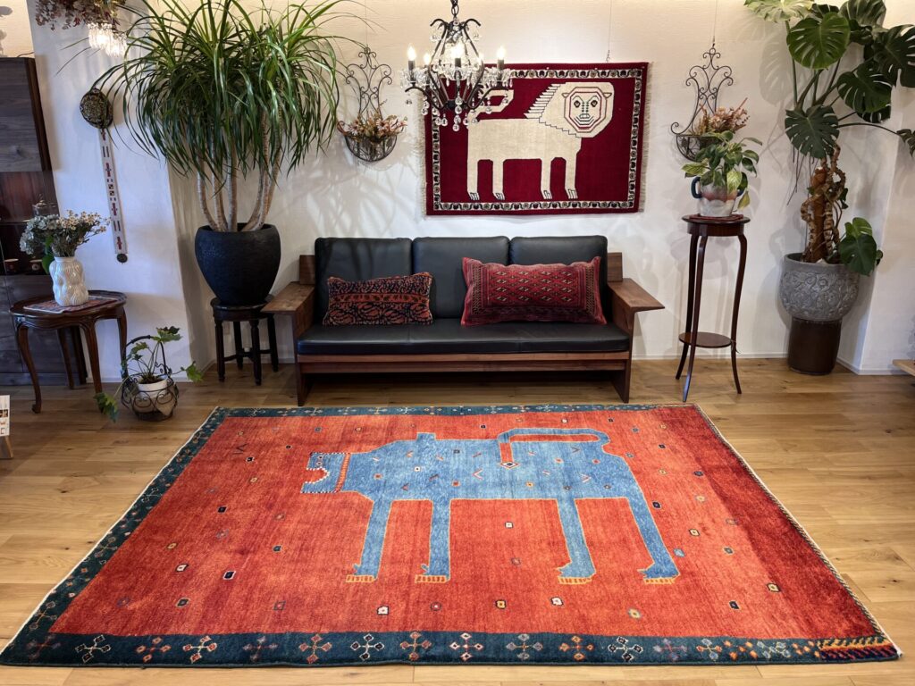 深みのある茜色のフィールドに、青く染め上げられたライオンが堂々と織り込まれた印象的なギャッベ。