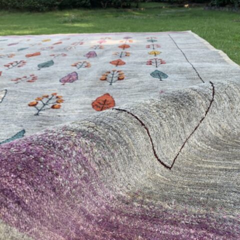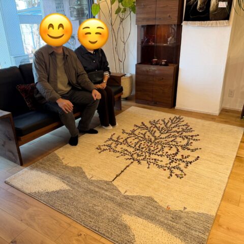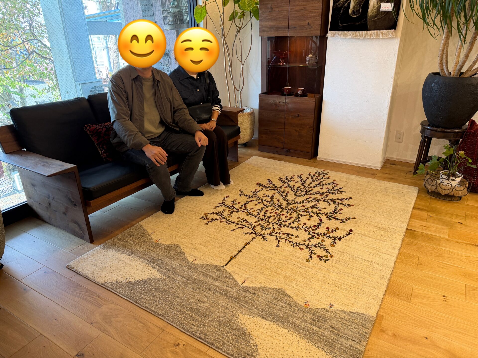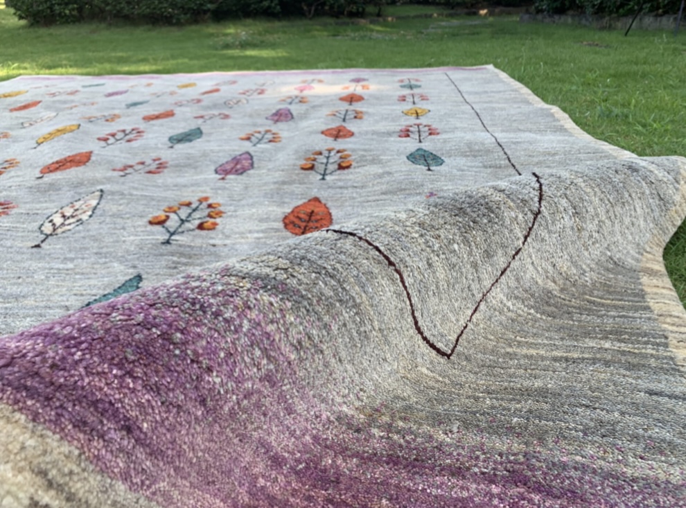 最後に、素敵な淡いグレーとパープルが幻想的で、「健康・長寿」の象徴である生命の木々がとても可愛らしいギャッベを購入いただいたお客様。301×254㎝の特大リビングサイズはやはり圧巻ですね。ベースが淡いグレーのグラデーションで厚みがるので、ゴロっとしても気持ちがいいです。是非、ご家族とご愛用くださいませ。