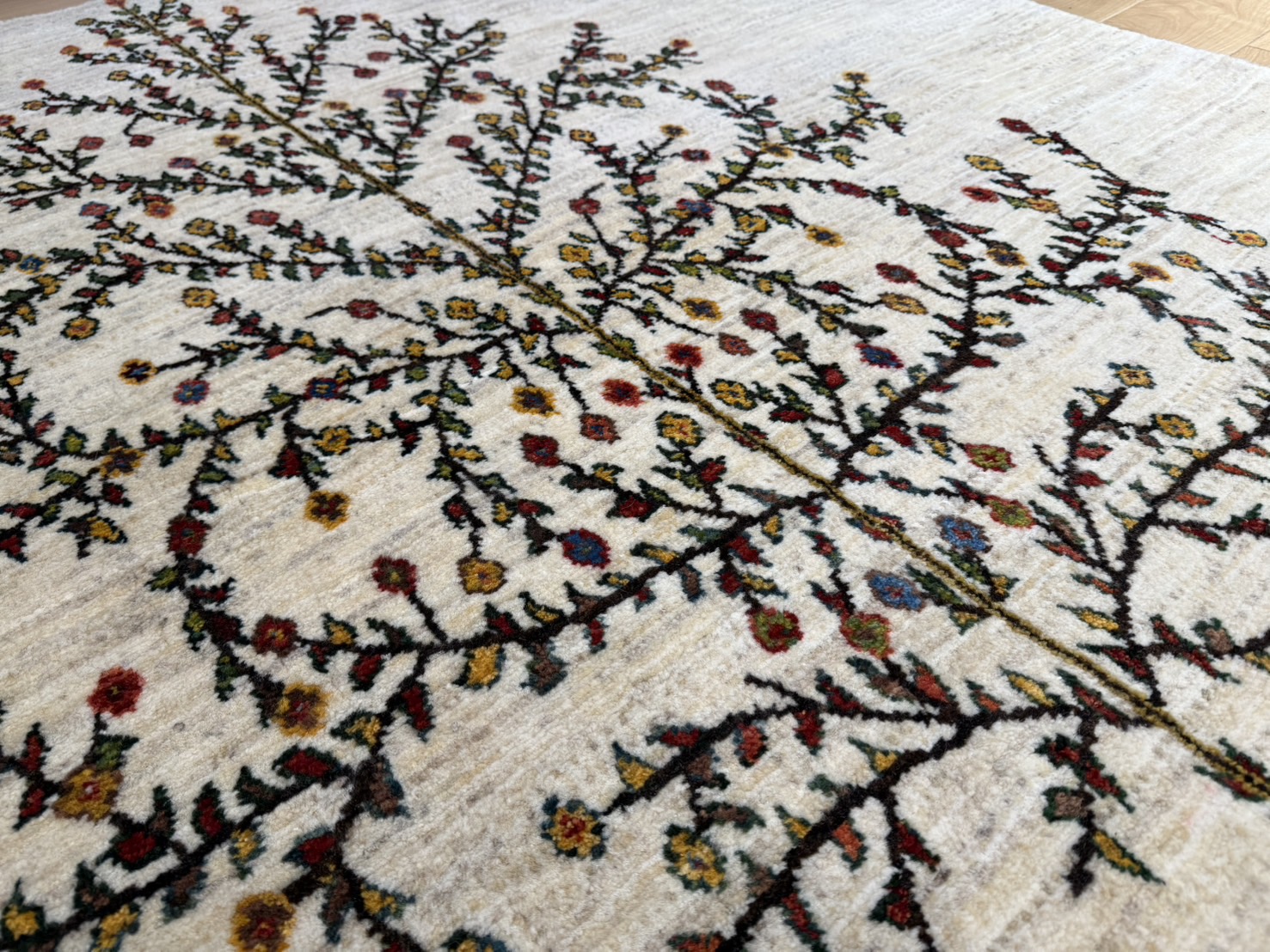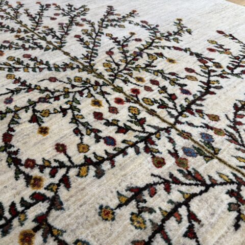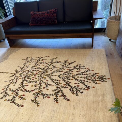 それでは、早速今回の嫁入りしたギャッベをご紹介させていただきます。生成りの原毛を基調としたフィールドに、大きく枝を広げる「生命の木」が描かれたギャッベを購入いただいたお客様。