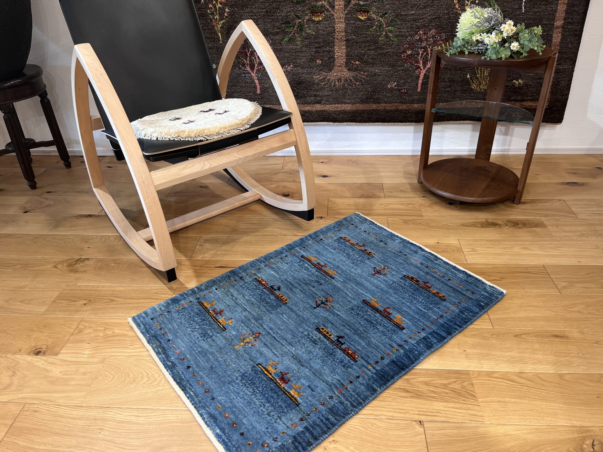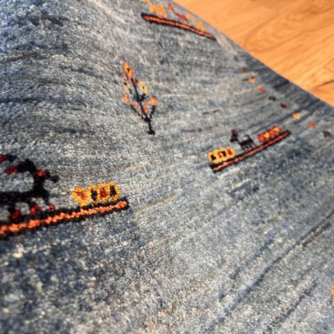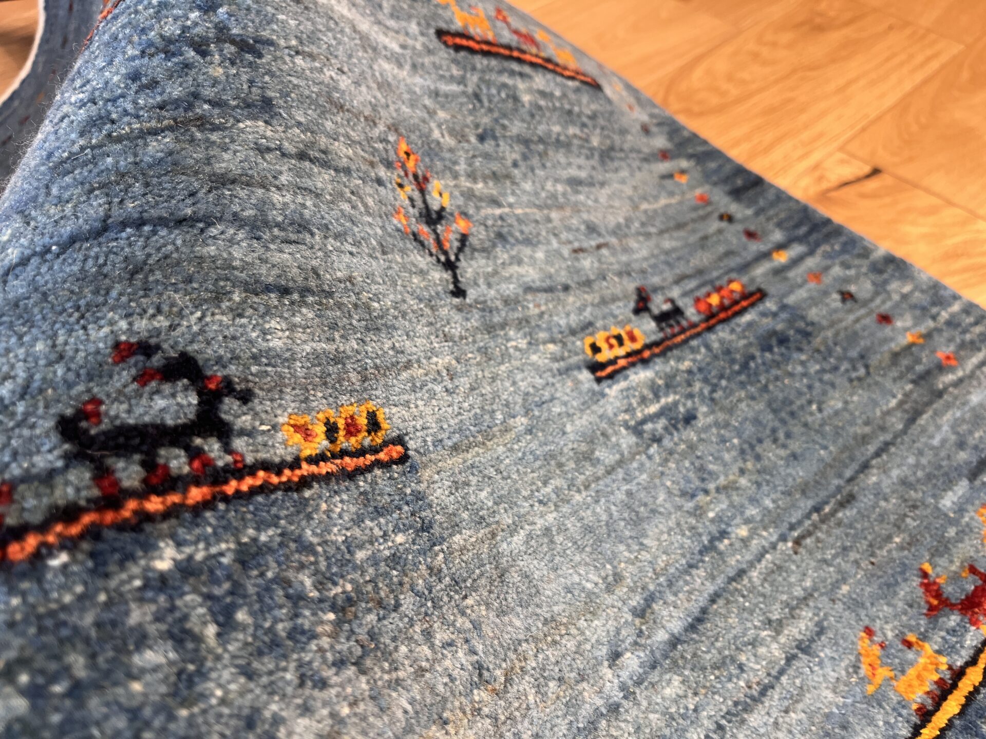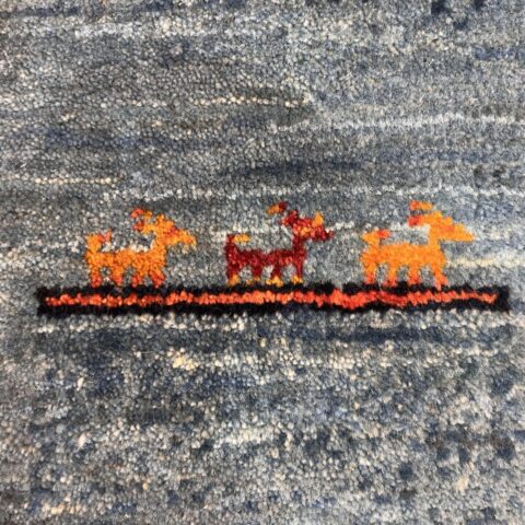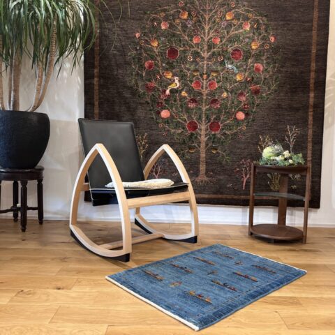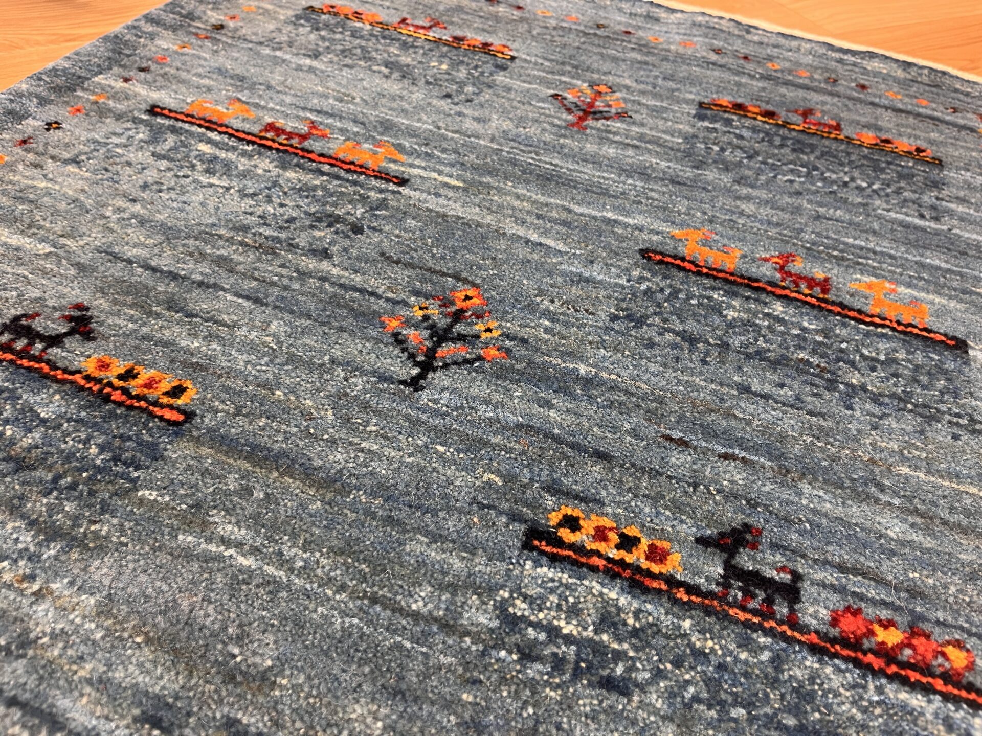 澄んだブルーフィールドには可愛らしい羊のモチーフが規則的に織り込まれています。「羊」は遊牧民にとって生活を支える豊かさの象徴であり、同時に家族の安らぎ・守り・繁栄を願う縁起の良い図案。加えて、中央に織られた「生命の樹」長寿・成長・家族の絆が、このギャッベの優しい世界観をより一層引き立てています。